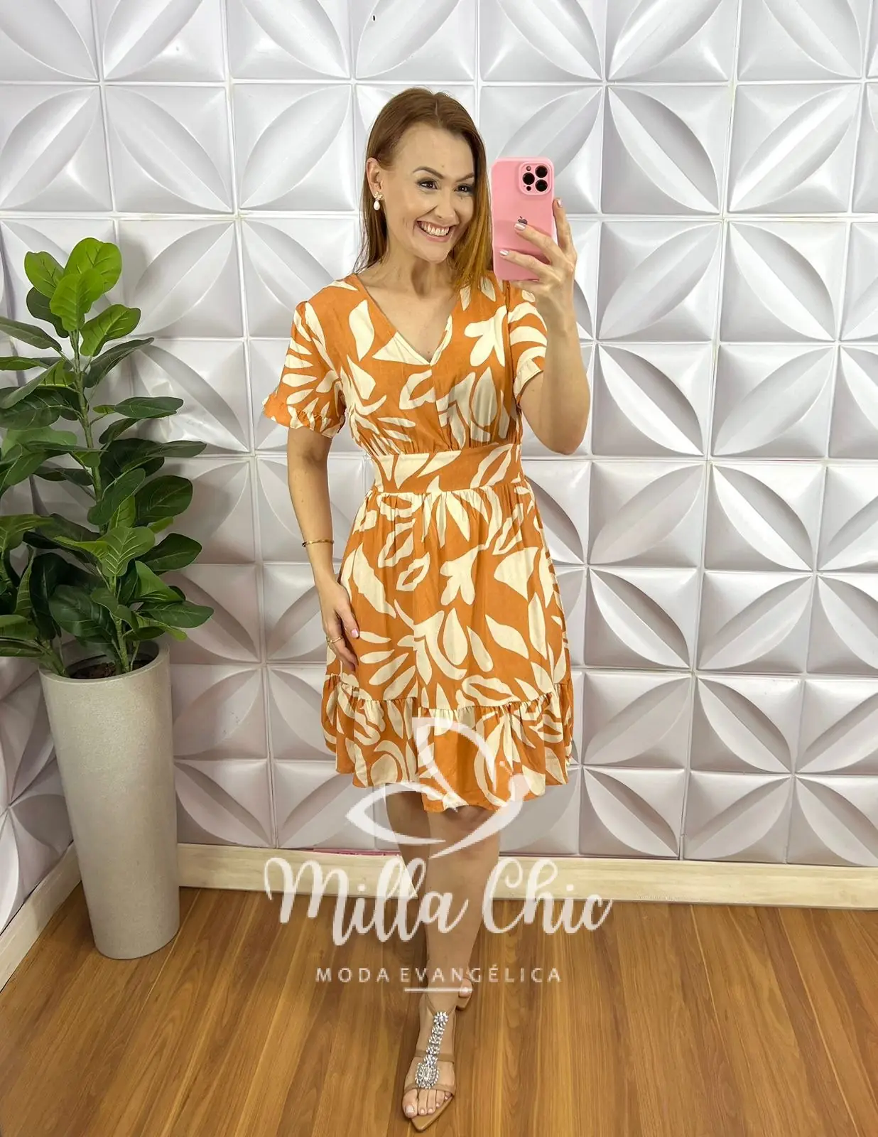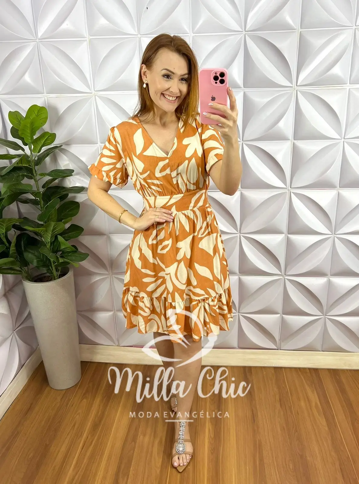 Vestido No Viscose Curto Manga Com Babadinho Estampado Fabia – Laranja e areia