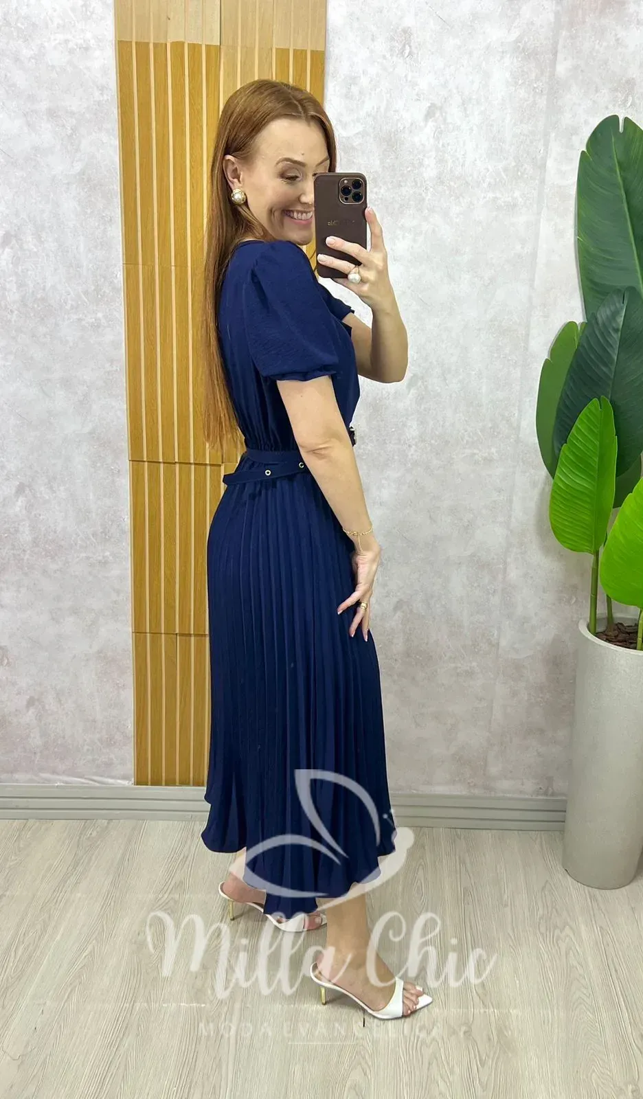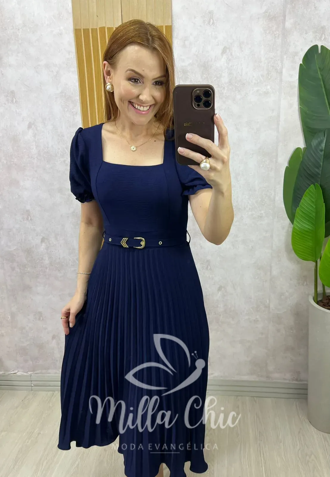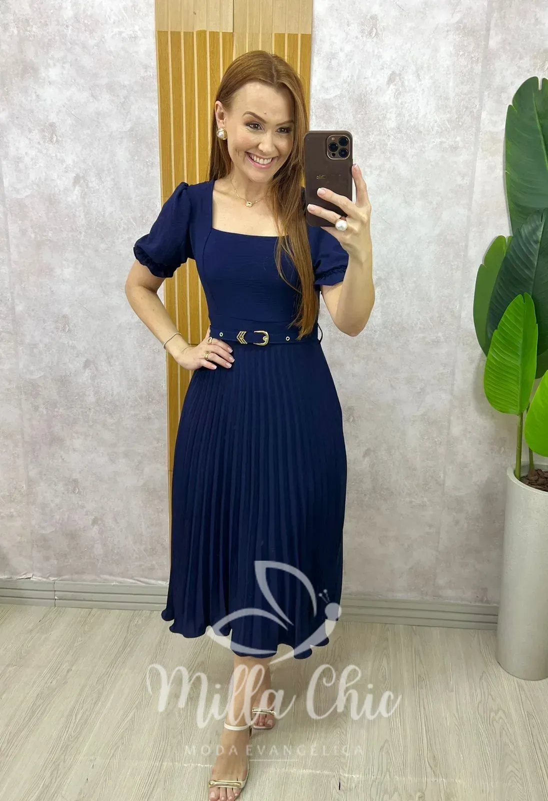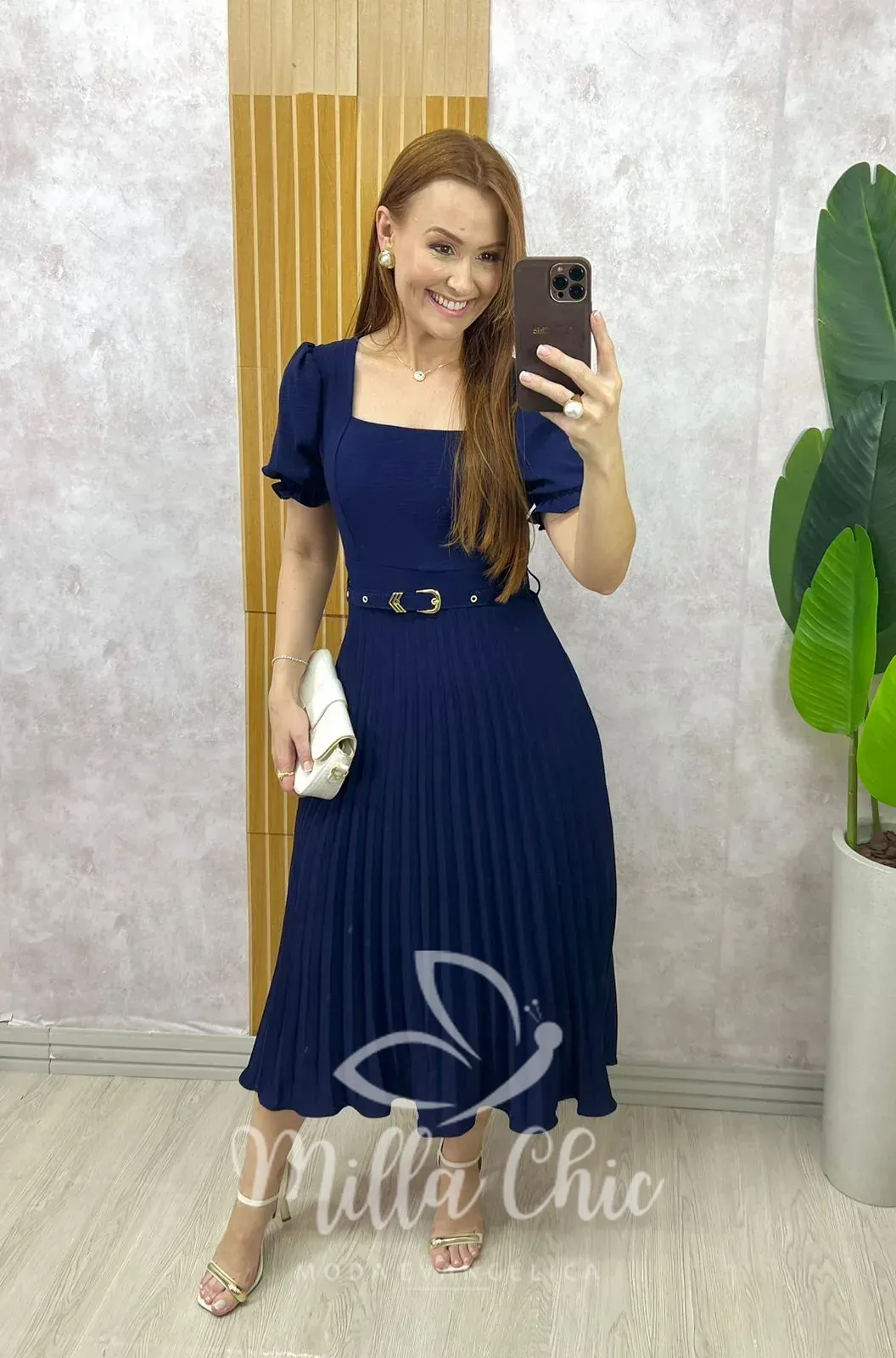 - Possui modelagem midi com saia plissada;