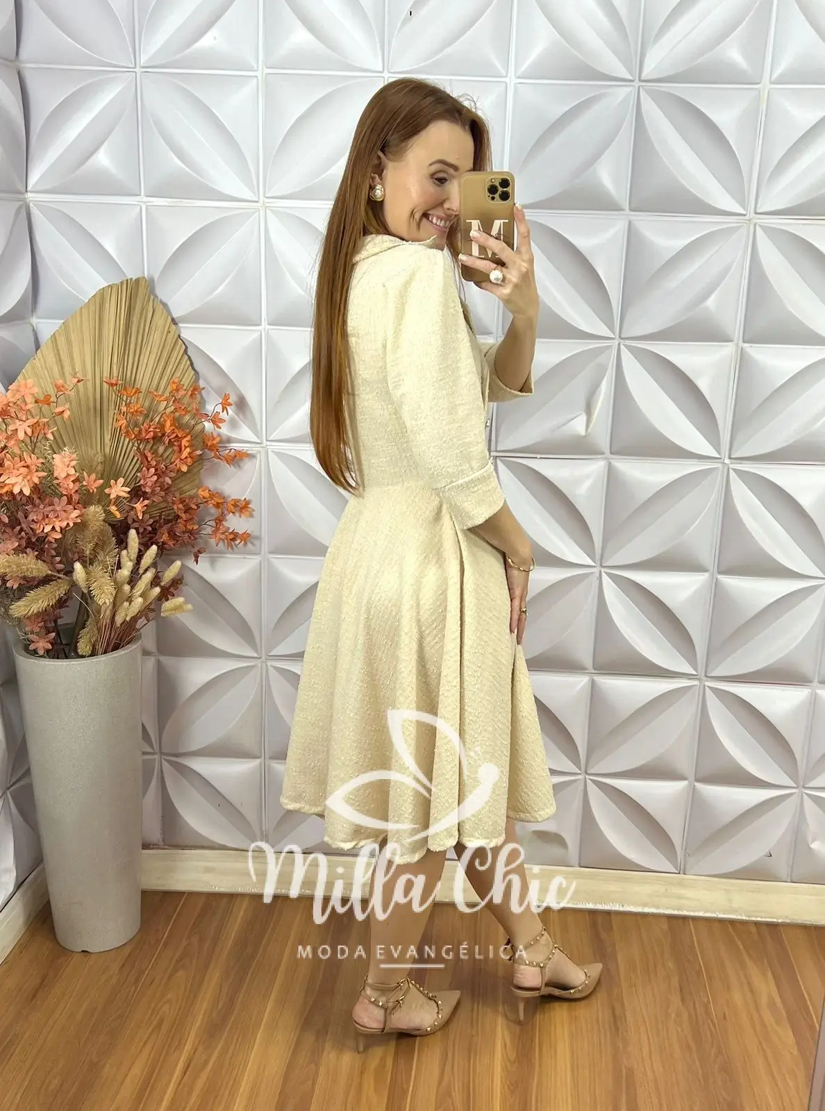 O Vestido Regina apresenta um design midi que valoriza a silhueta feminina, proporcionando um caimento perfeito.