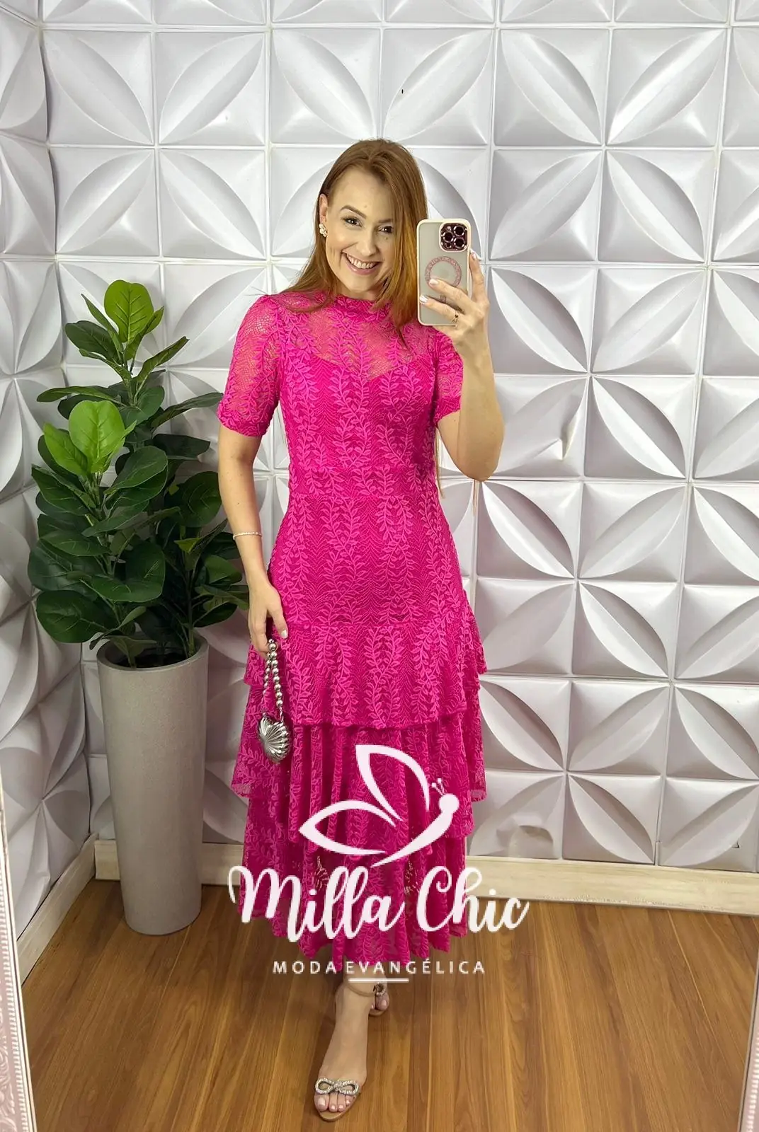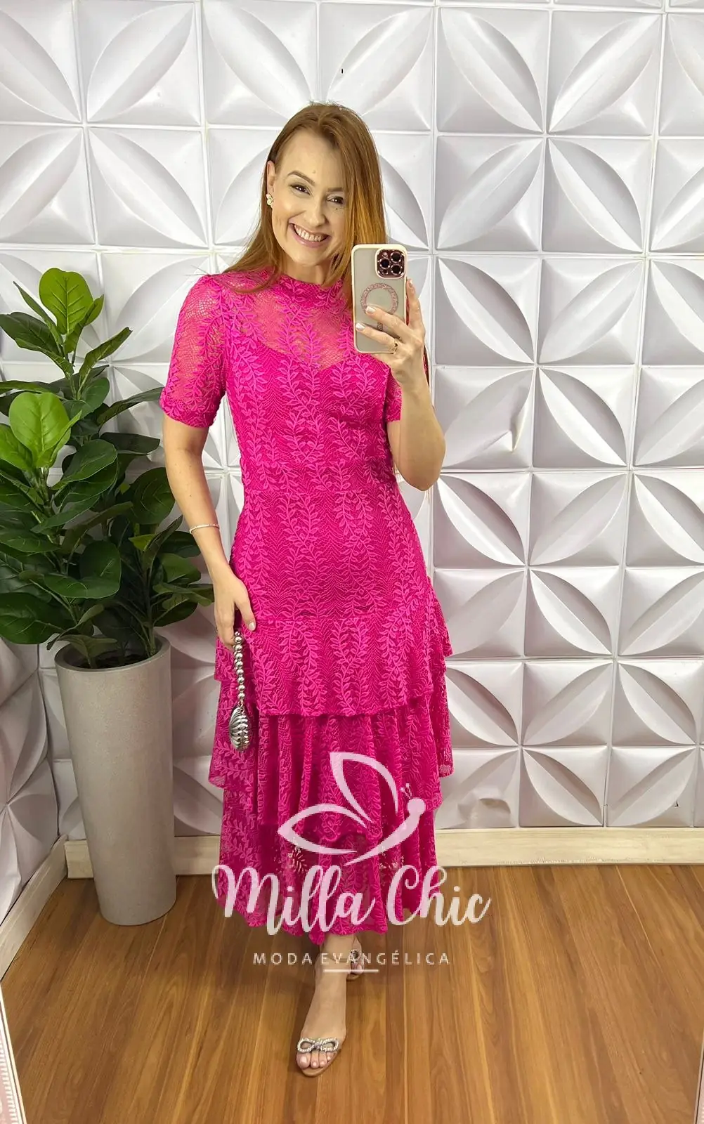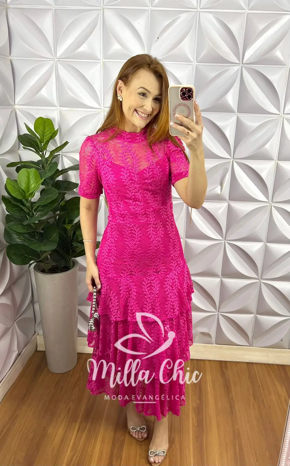 Vestido Renda Chantilly Gola Alta Com Babados Louise – Pink