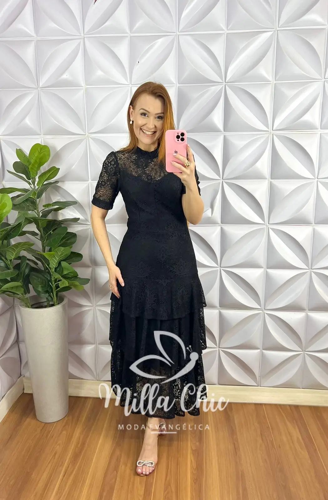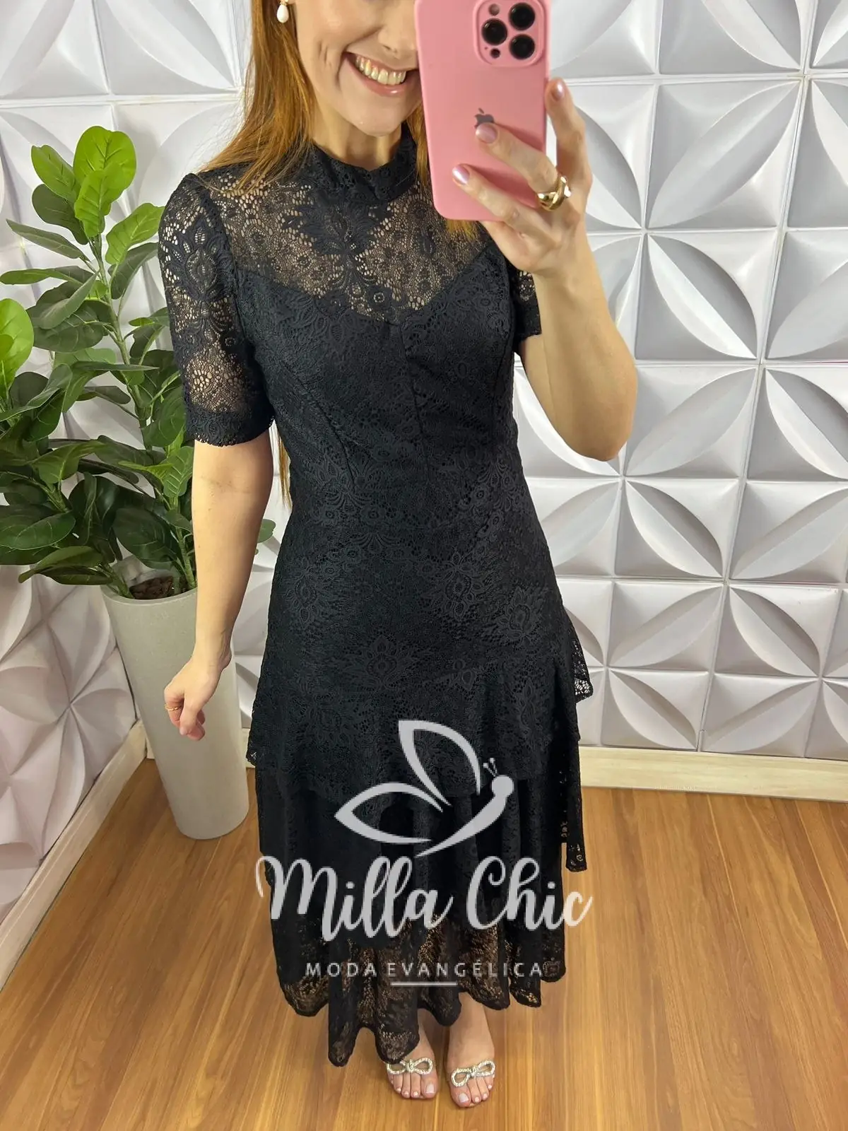 Vestido Renda Chantilly Gola Alta Com Babados Louise – Preto