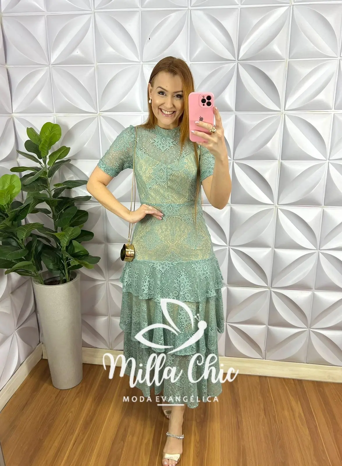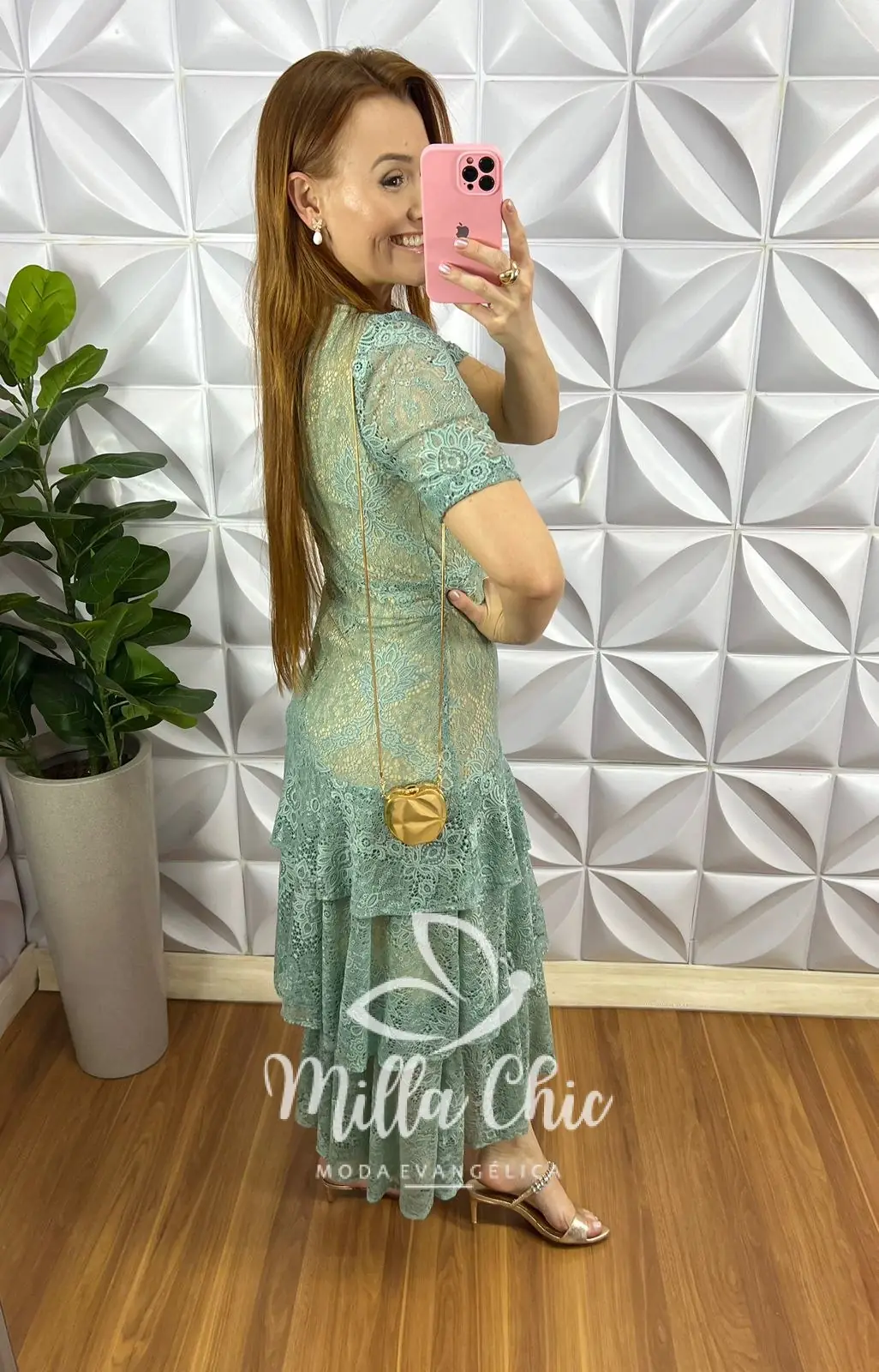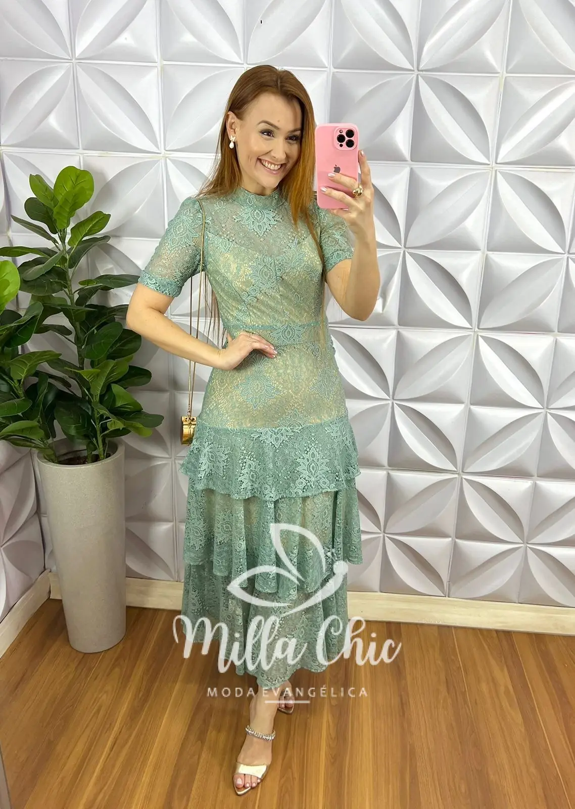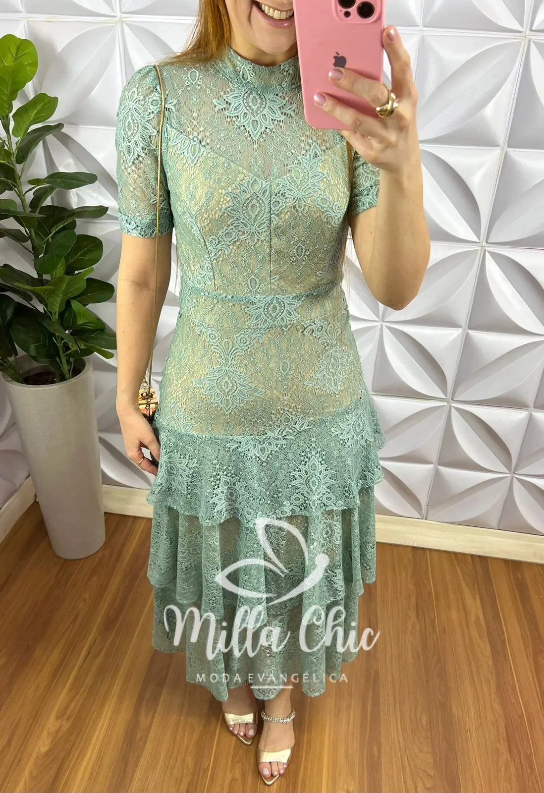 Vestido Renda Chantilly Gola Alta Com Babados Louise – Verde Tiffany