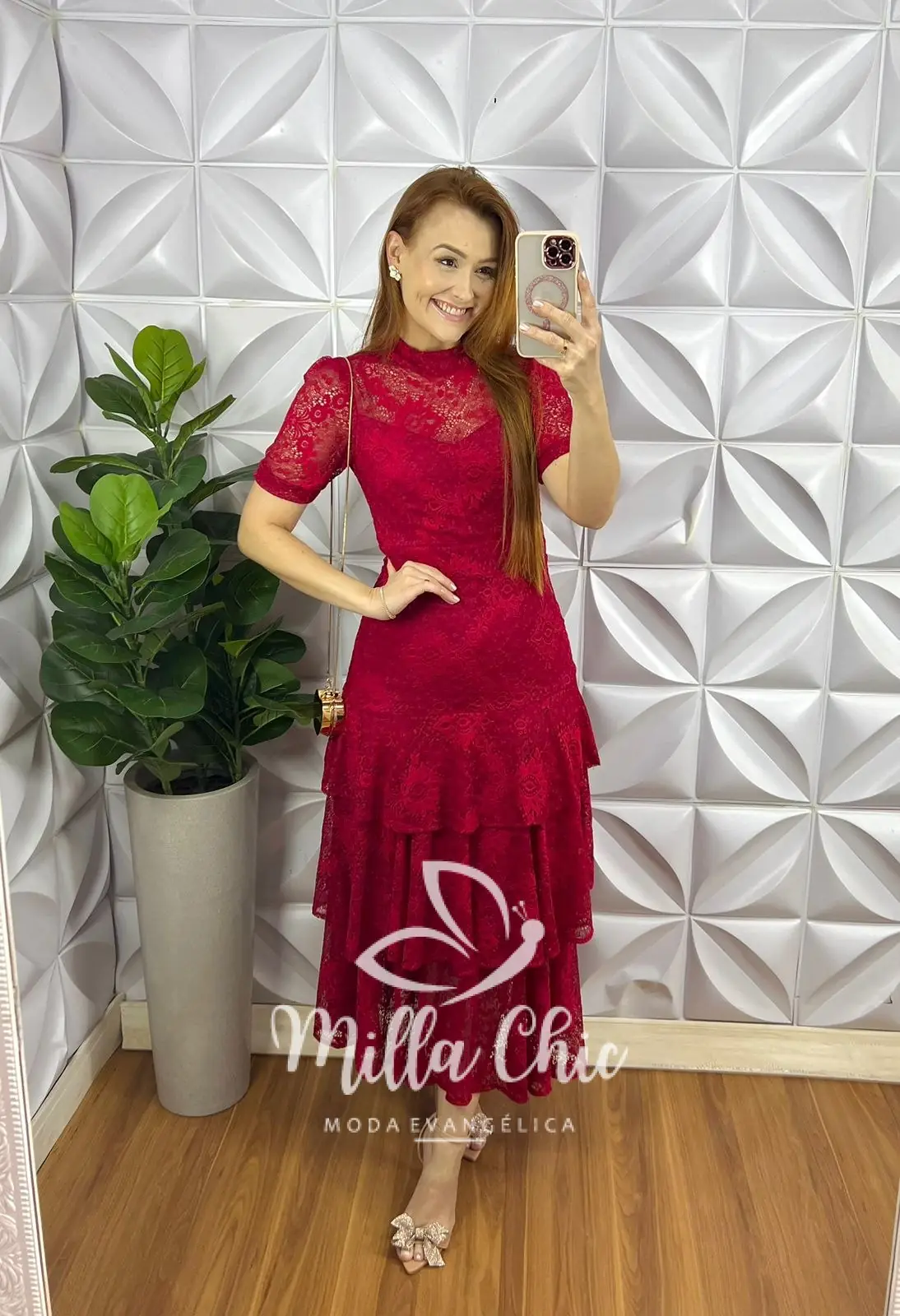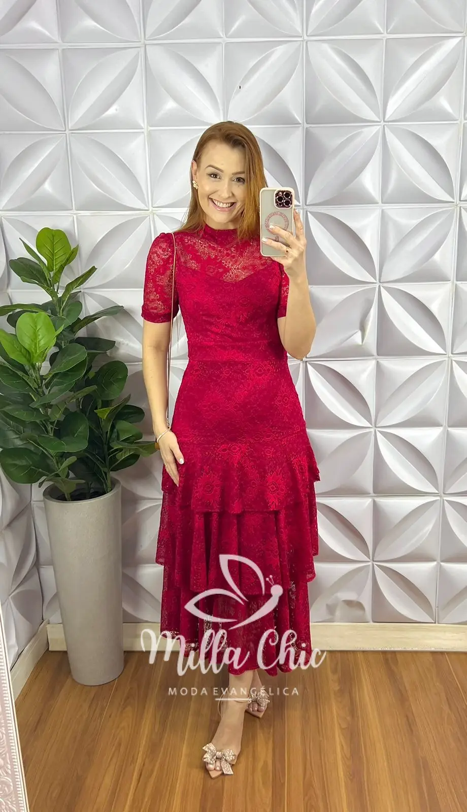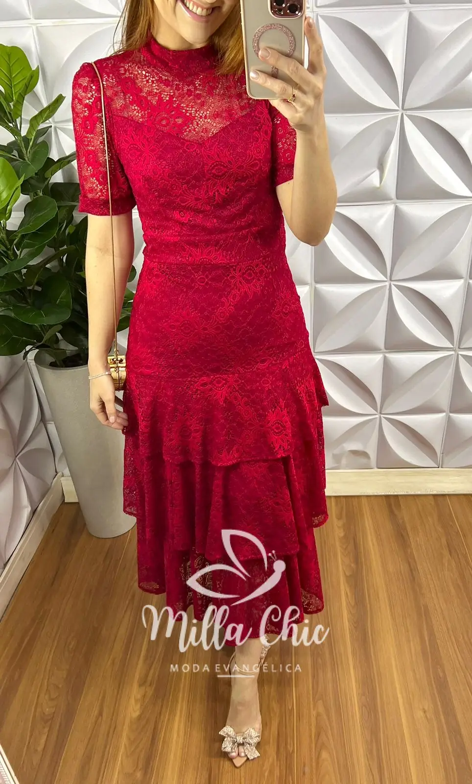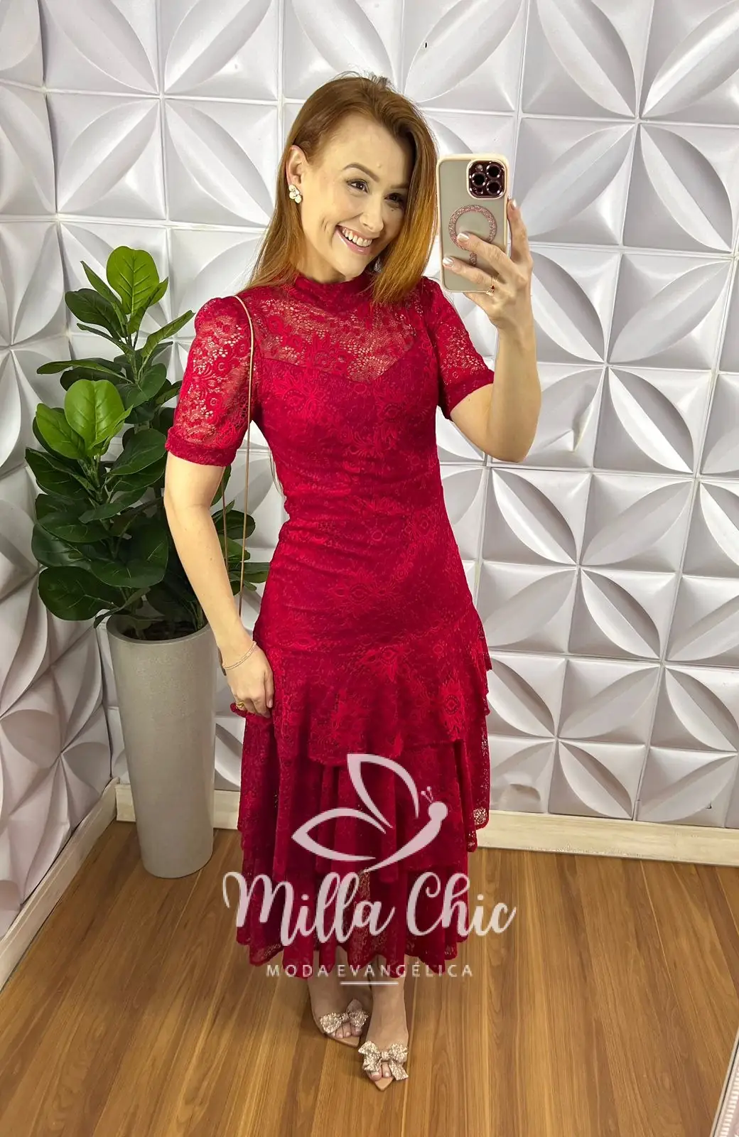 Vestido Renda Chantilly Gola Alta Com Babados Louise – Vermelho