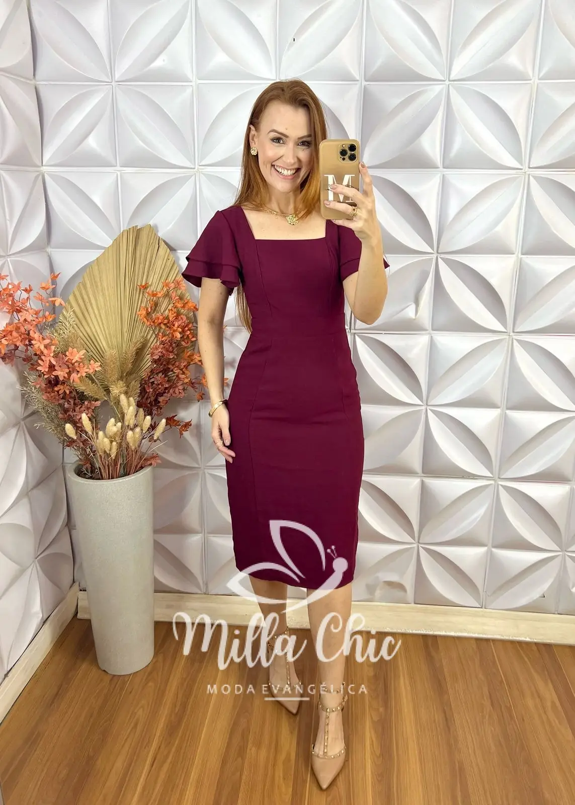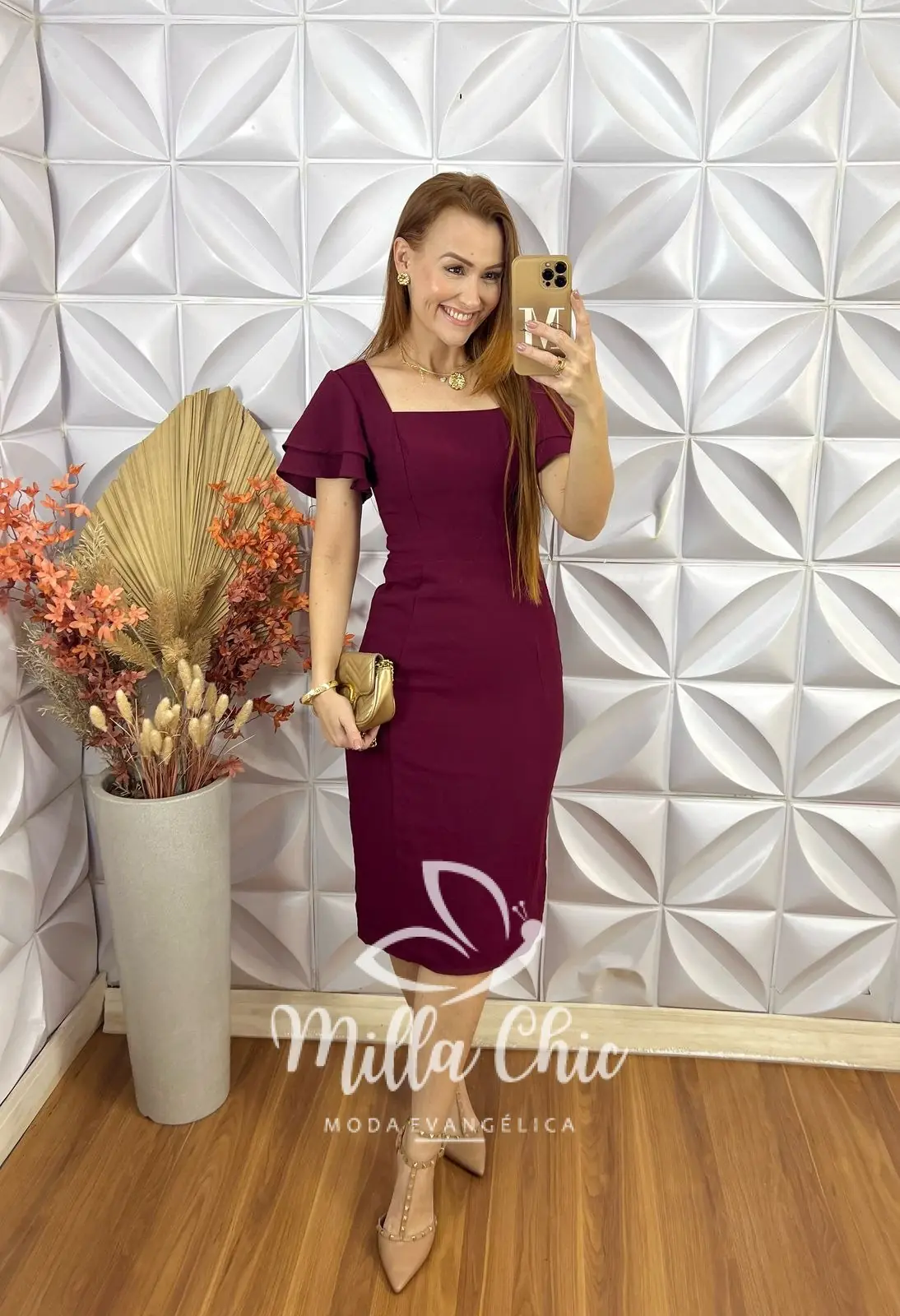 Sofisticado , aquele vestido reto que não marca , possui mangas em dois babados que dá aquele toque de modernidade e decote quadrado que transmite feminilidade e elegância .
