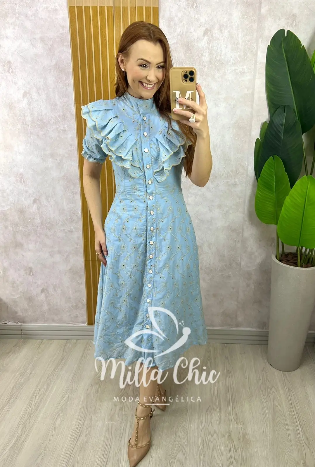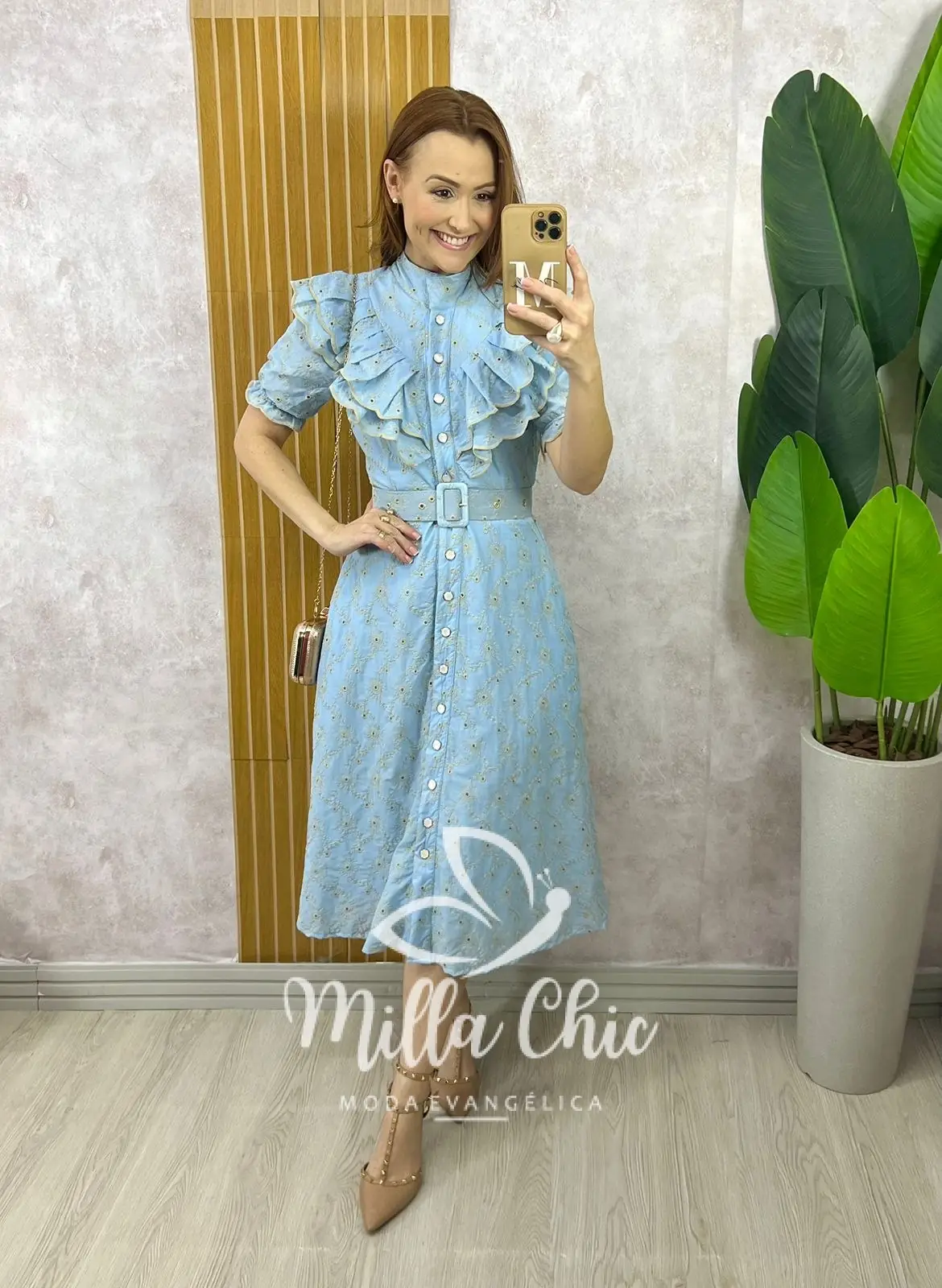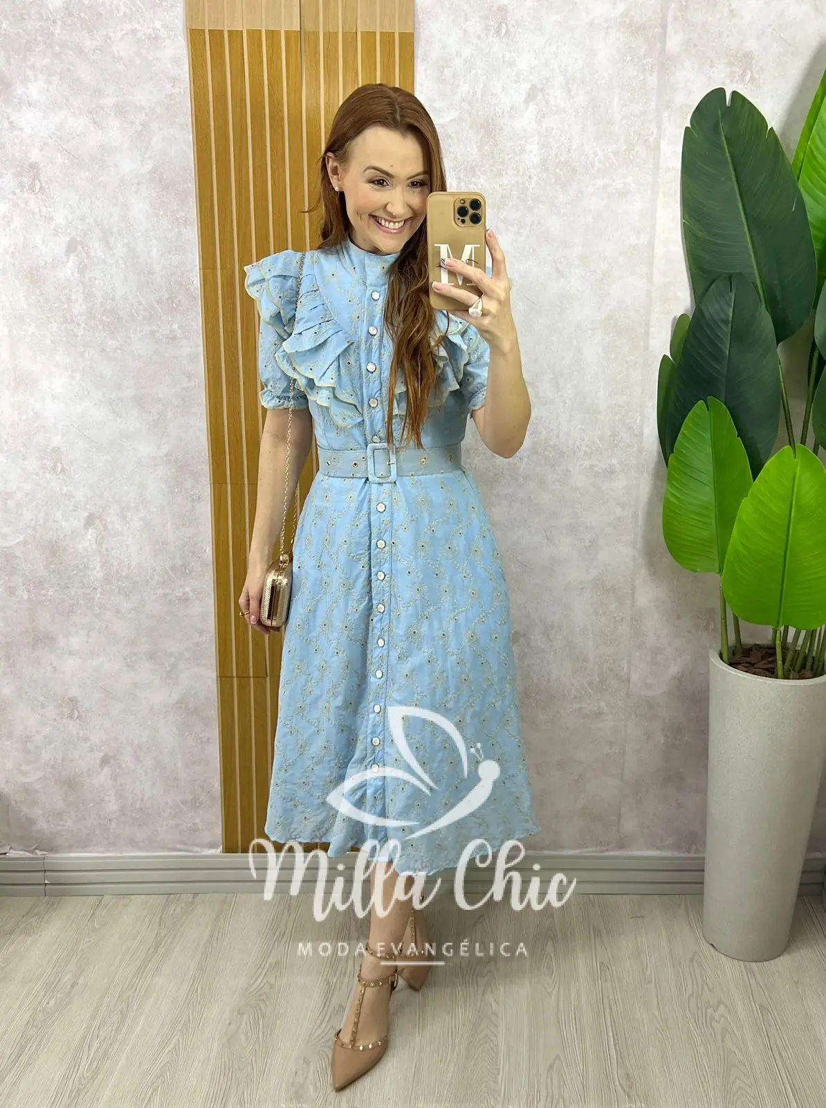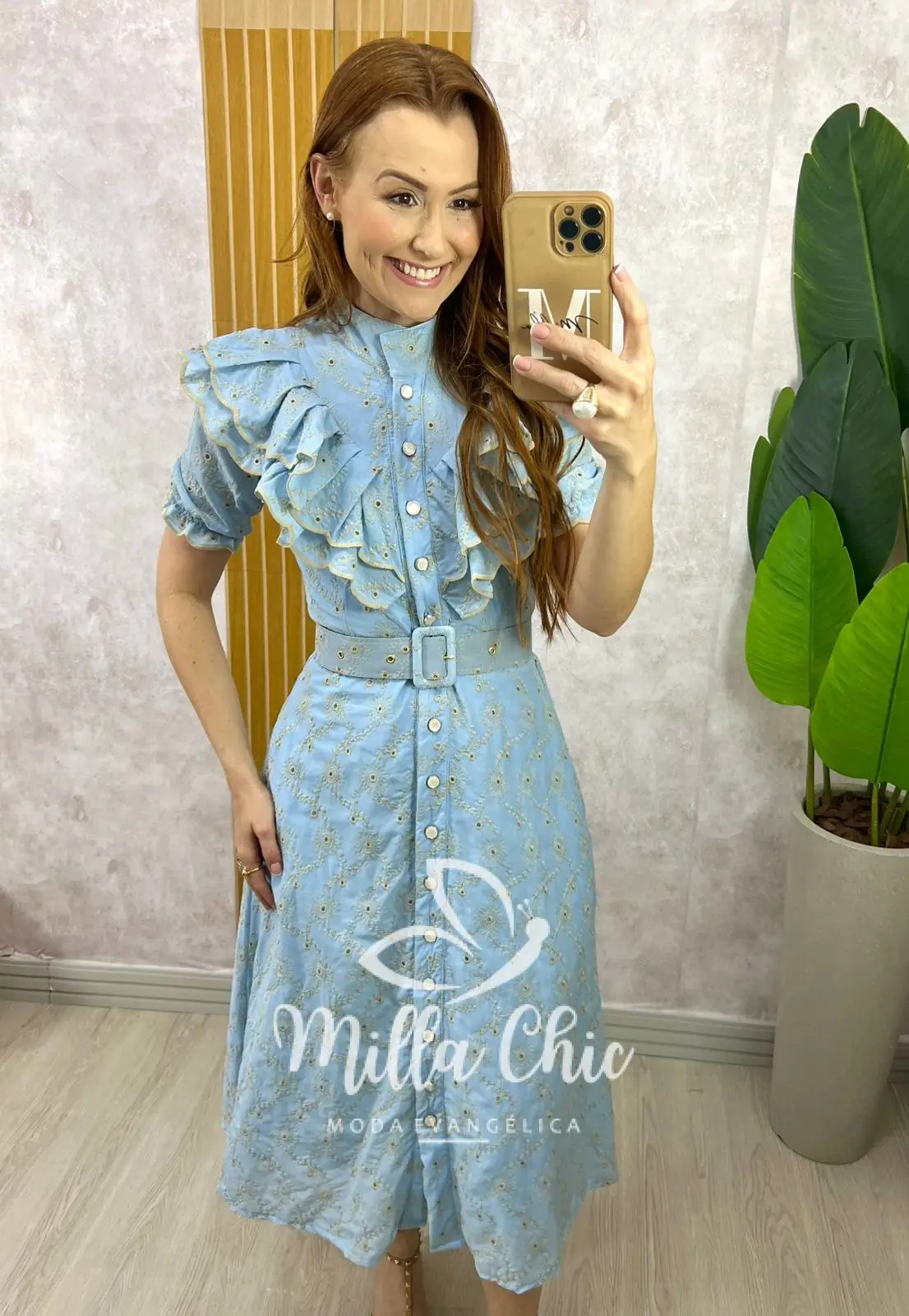 Um clássico romântico . Botões perolados funcionais , acompanha o cinto forrado que dá aquela acinturada , a manga tem os babados que transmite modernidade e leveza . O caimento da saia é evasê com um movimento lindo e solto .