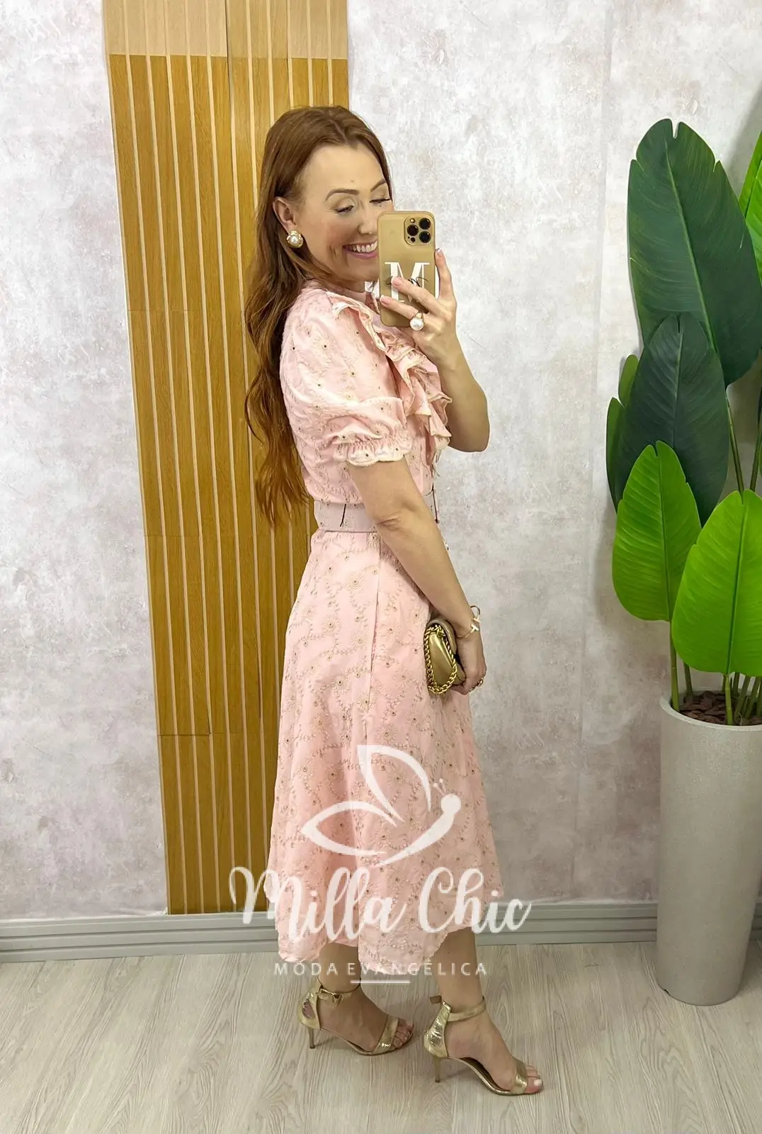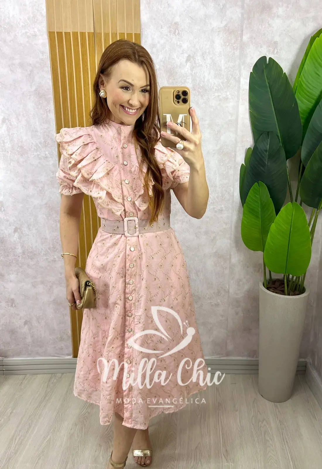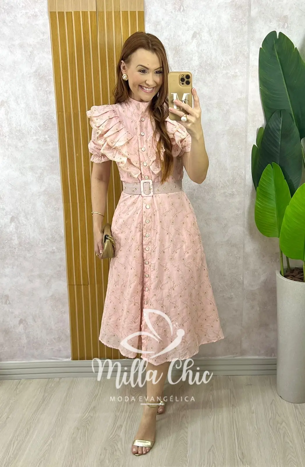 Um clássico romântico . Botões perolados funcionais , acompanha o cinto forrado que dá aquela acinturada , a manga tem os babados que transmite modernidade e leveza . O caimento da saia é evasê com um movimento lindo e solto .