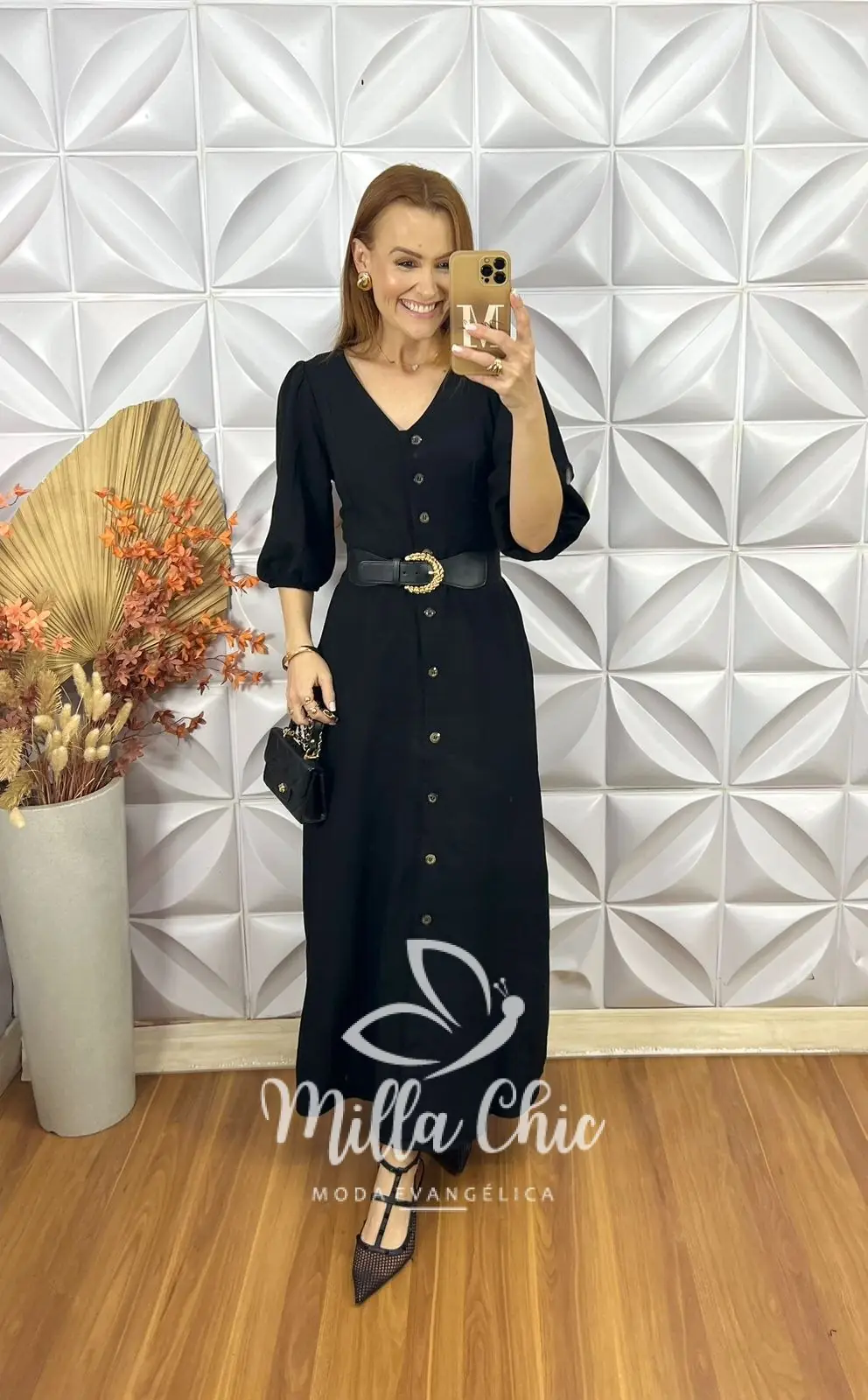 Ele é um longo estruturado e desce com a saia mais solta . Fica bem acinturado pois ele conta com um elástico na parte das costas do na cintura .
