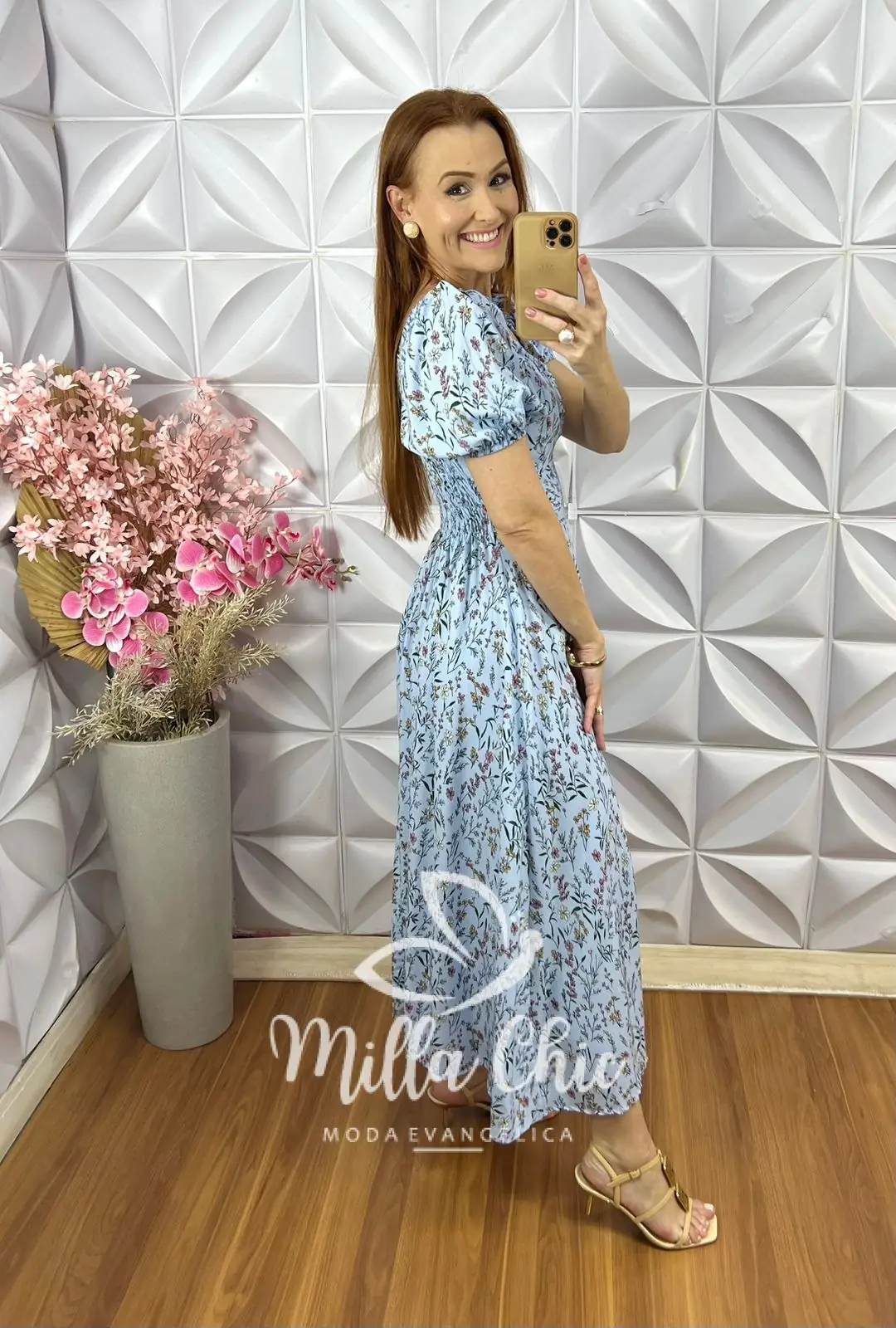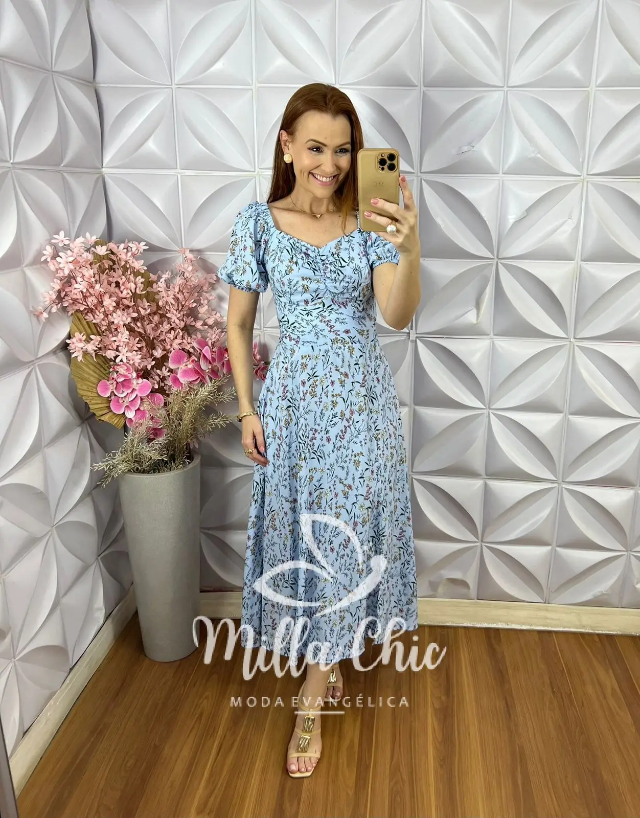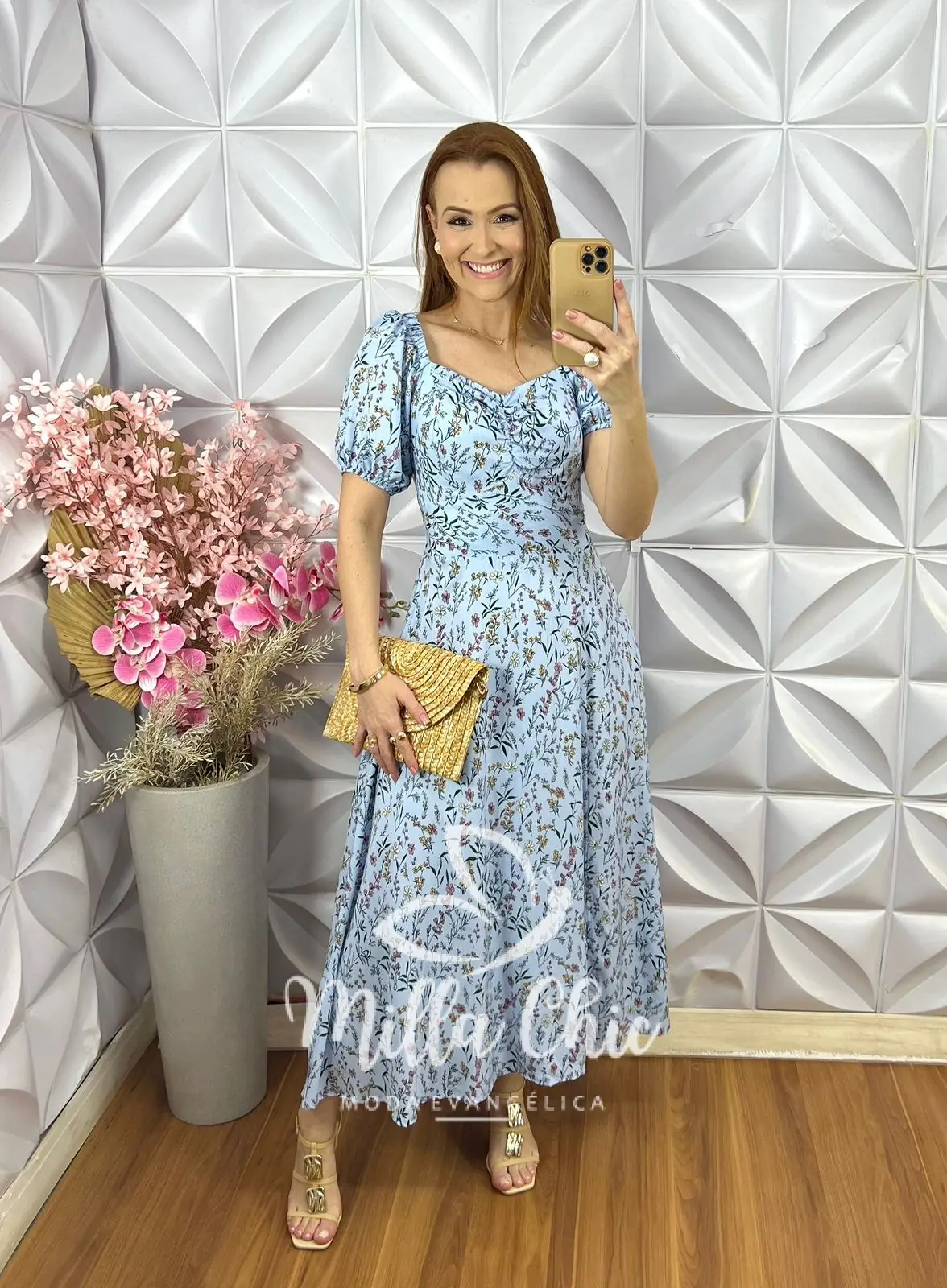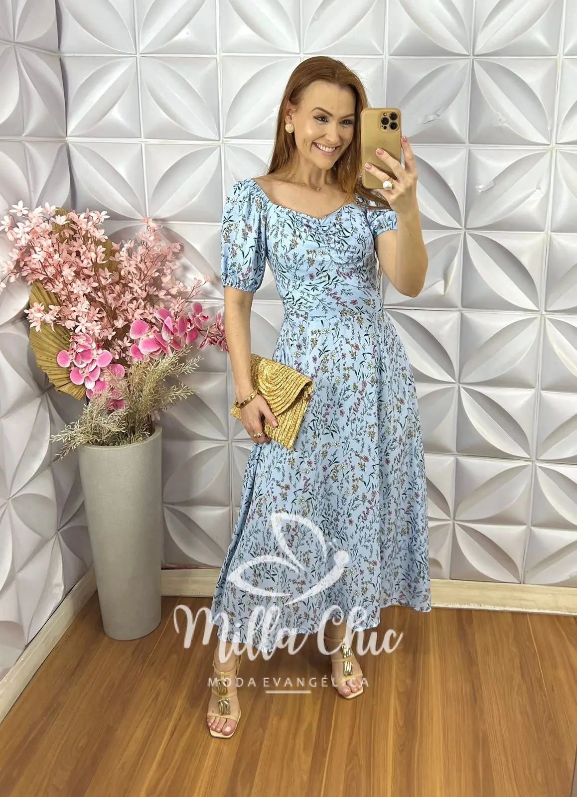 Vestido Sheila Em Viscolinho Estampado – Azul Céu