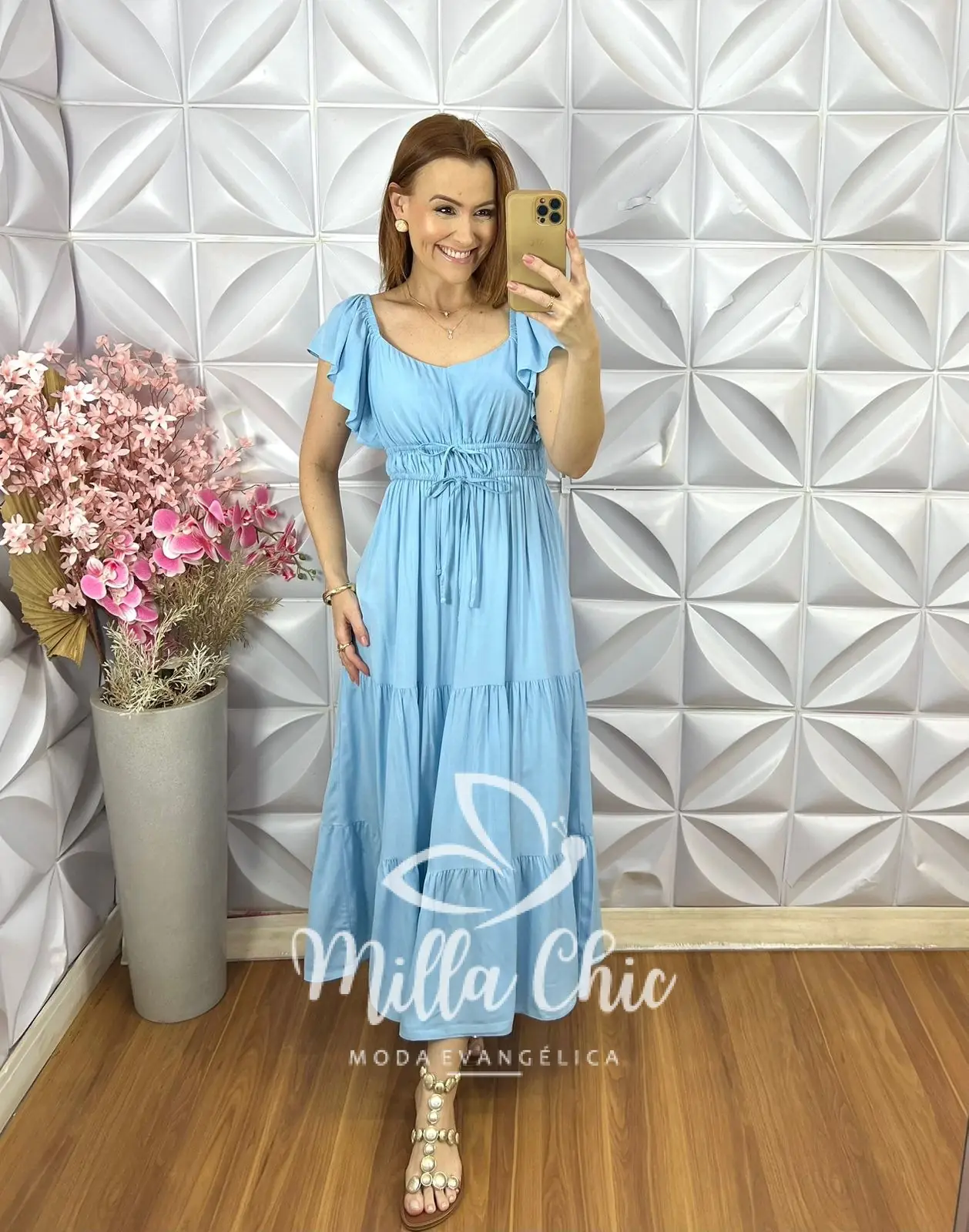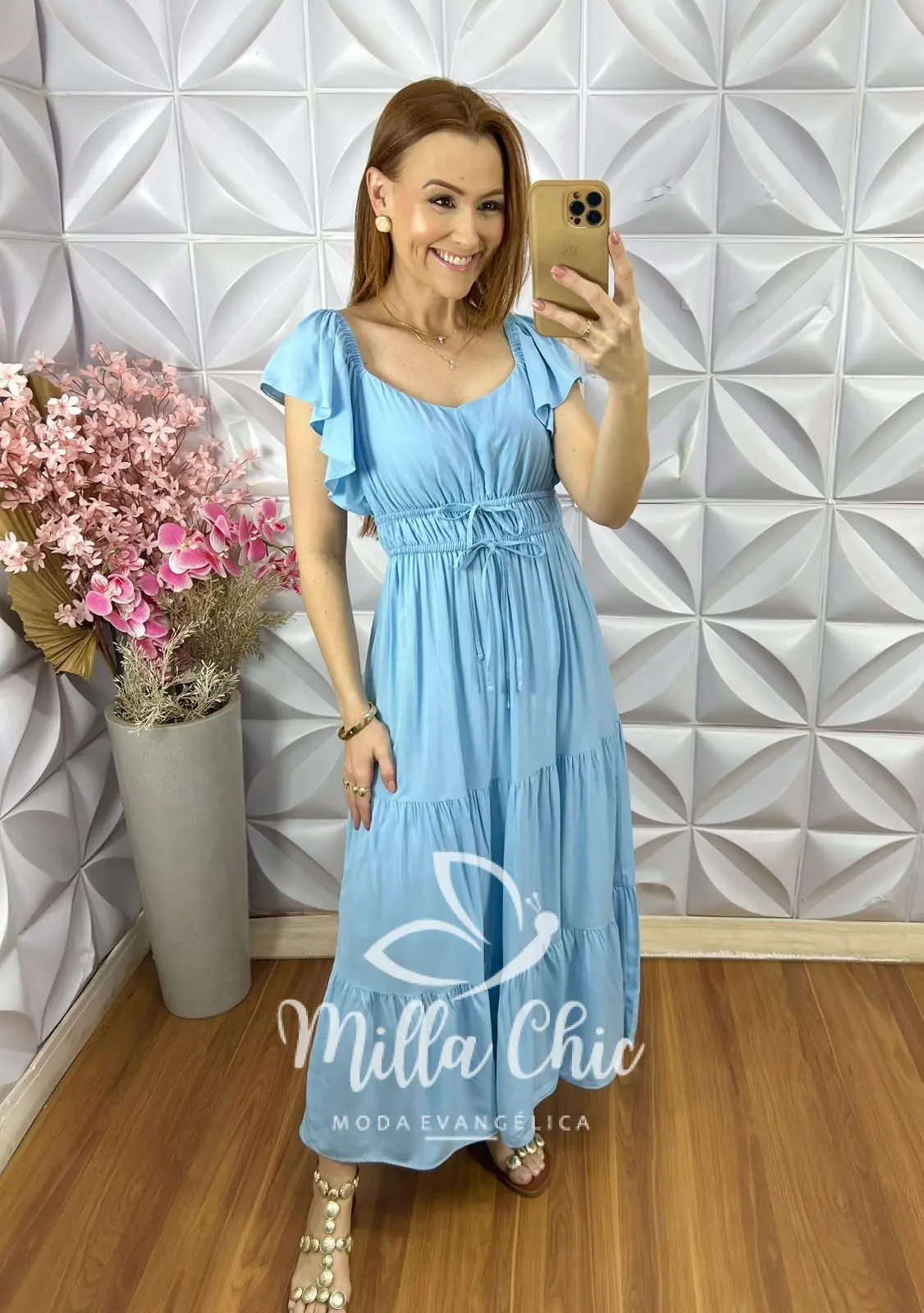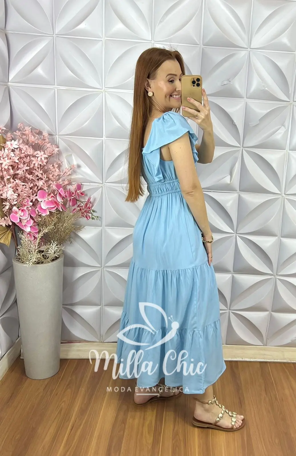 O detalhe que marca a presença dessa peça são as mangas em babado e o detalhe na cintura. O que deixa minhas irmãs que o vestem lindas, femininas e diferenciadas.