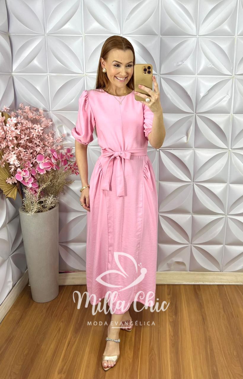 Ele fica bem acinturado e o cinto é costurado no vestido.