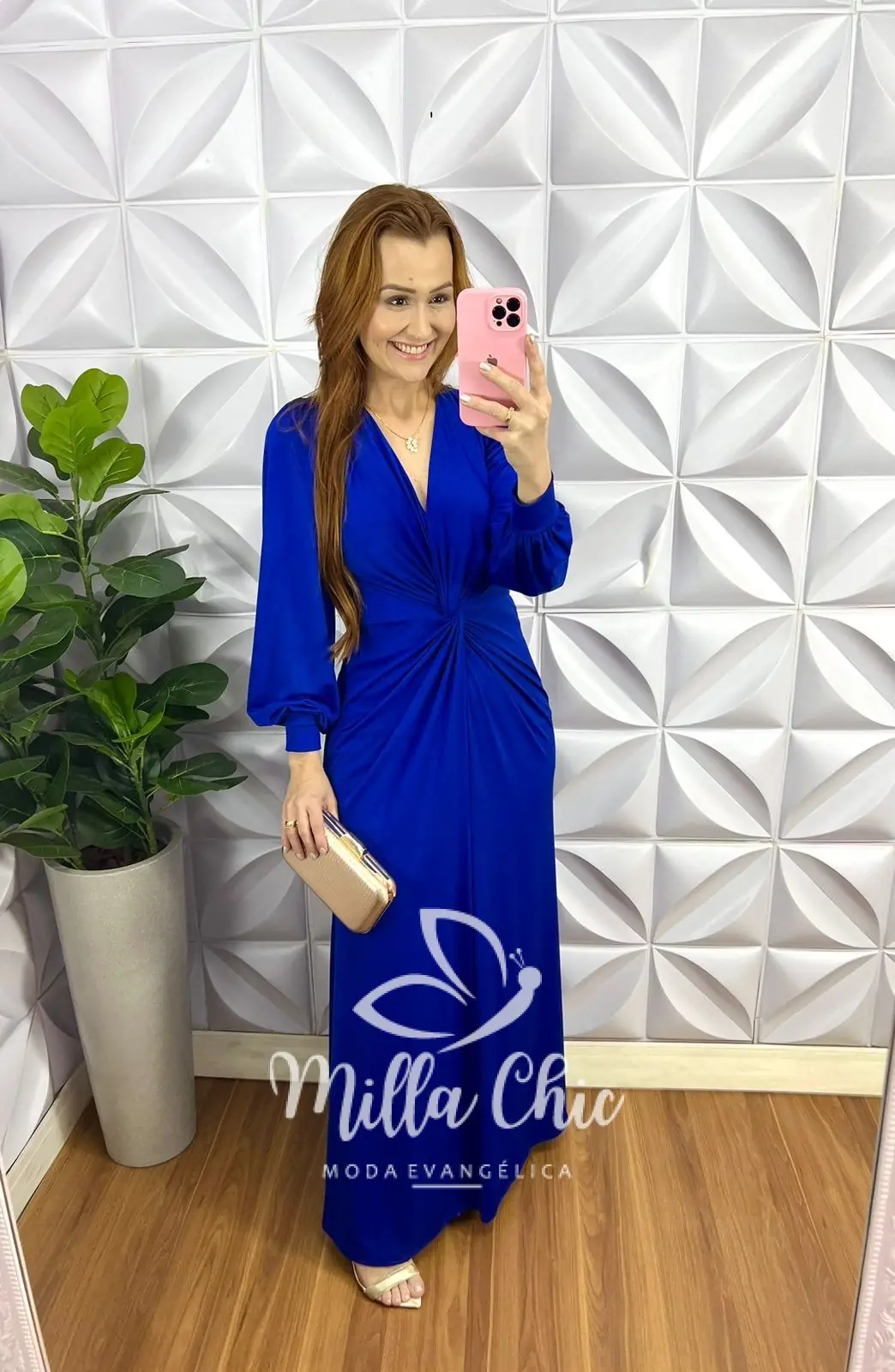 Vestido Tecido Fluity Longo Com Torção Francesca - Azul - Milla Chic