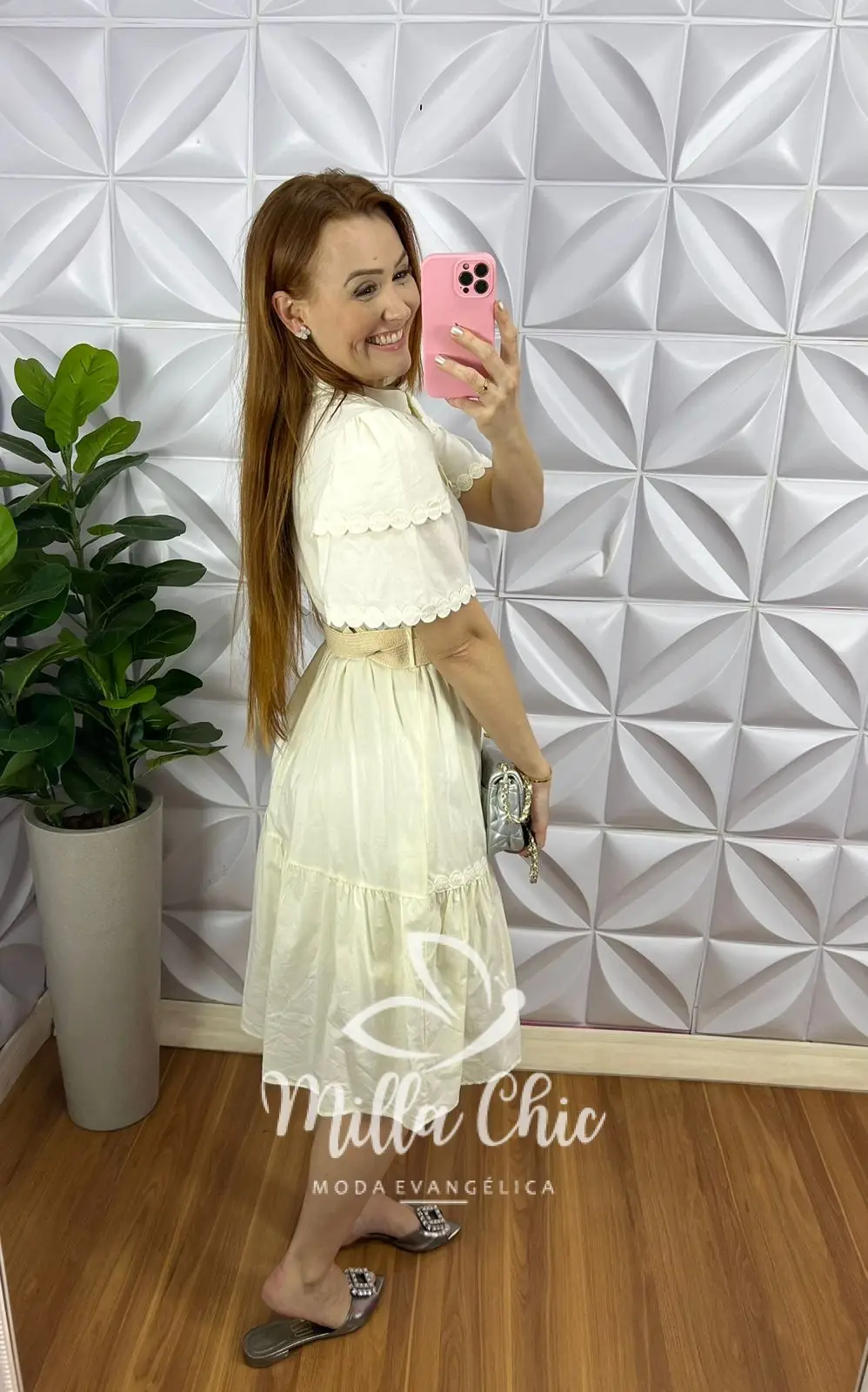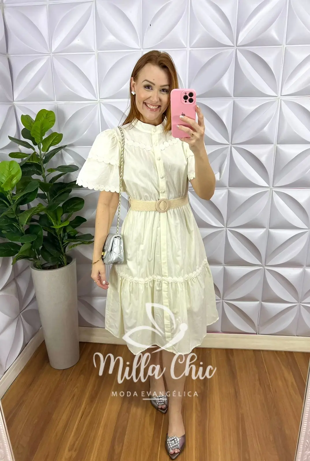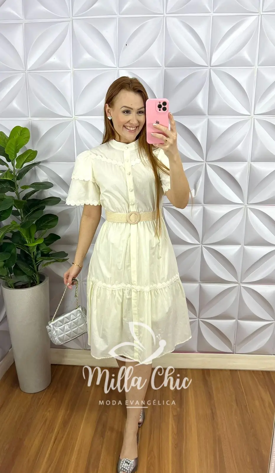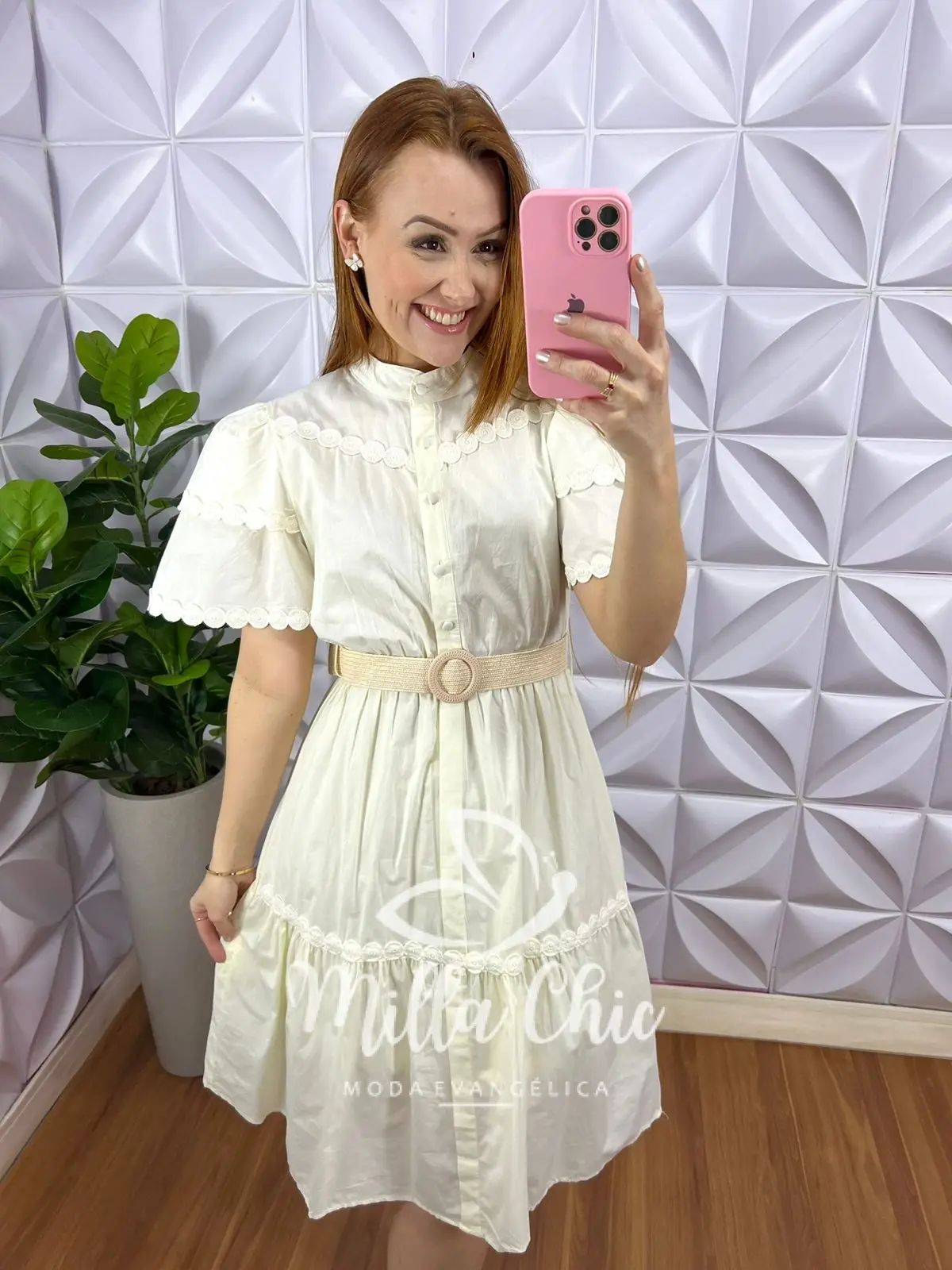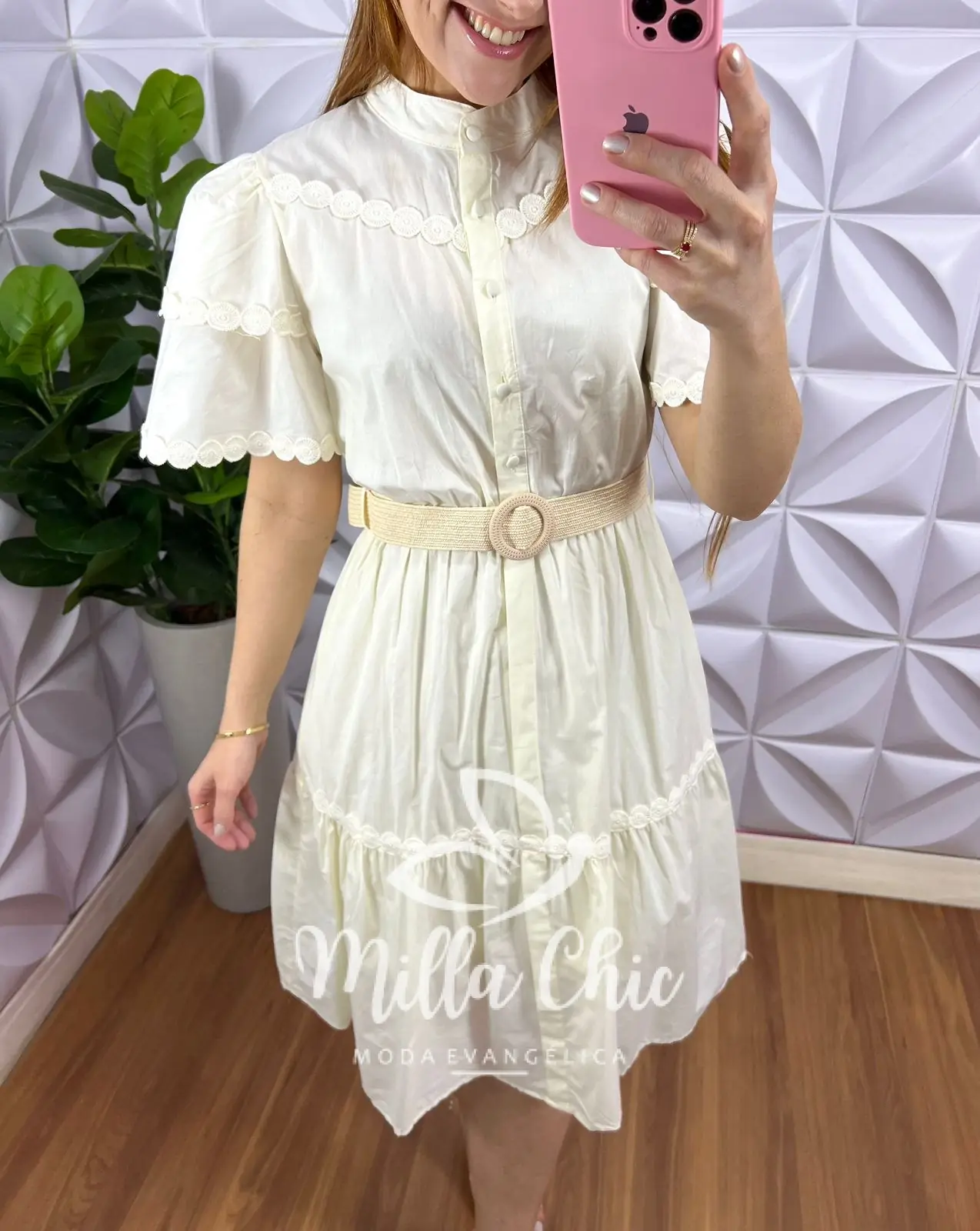 Possui: Gola padre, manga princesa com bordados e barrado, recorte no busto, botões encapados funcionas, cintura com elástico, comprimento abaixo do joelho, caimento evase com duas marias, forrado. Acompanha cinto com fivela.