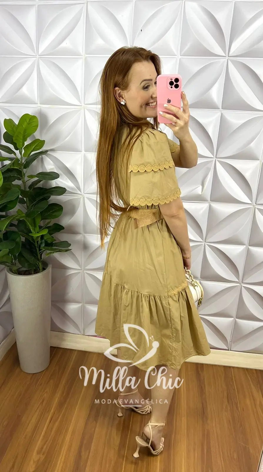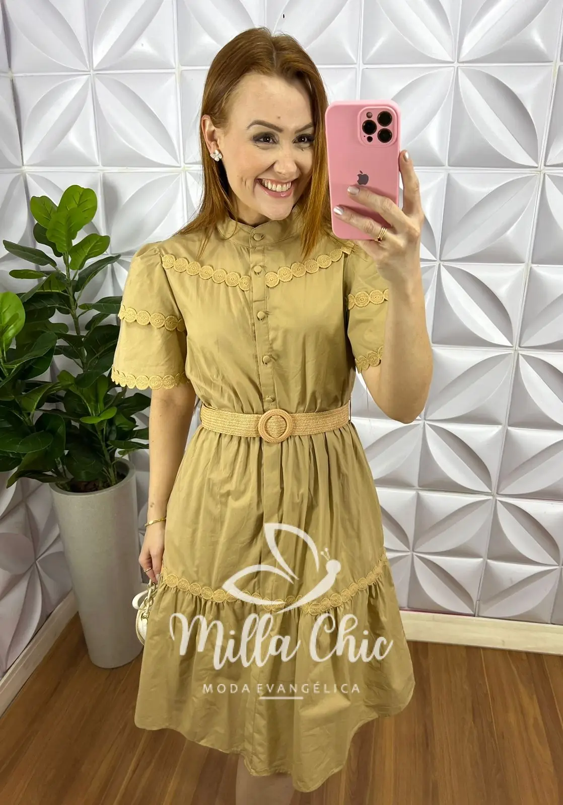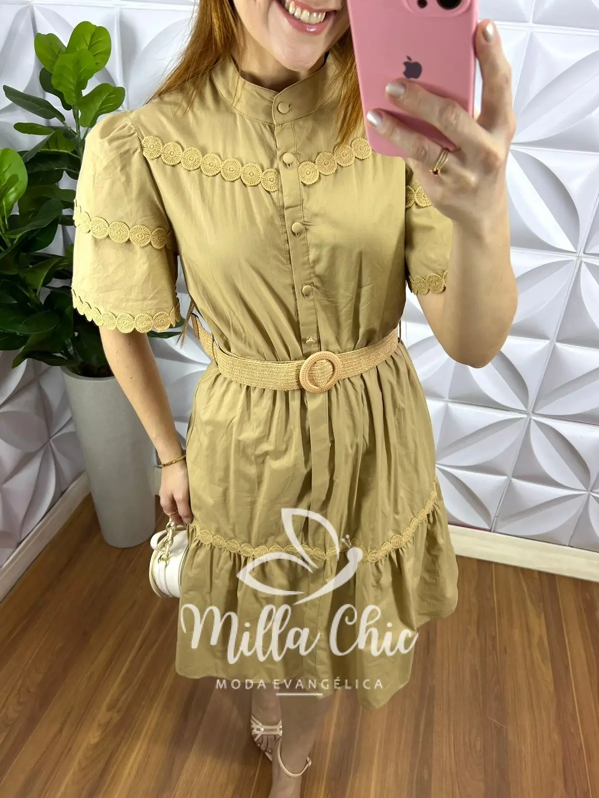 Vestido Tricoline Com Bordados De Guipper e Cinto Stefani – Capuchino