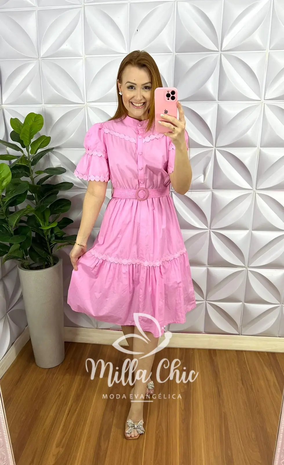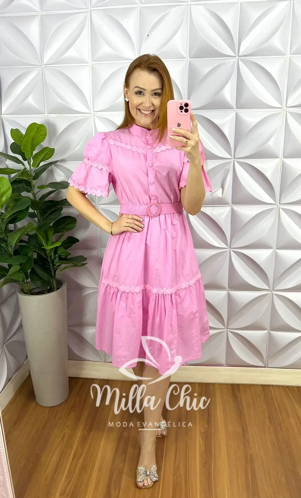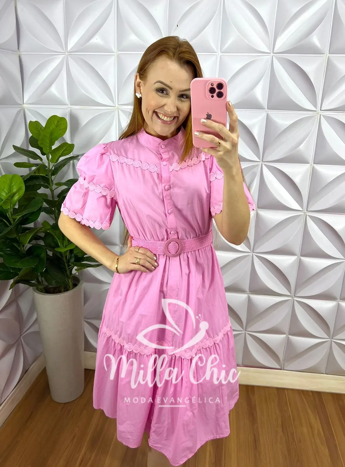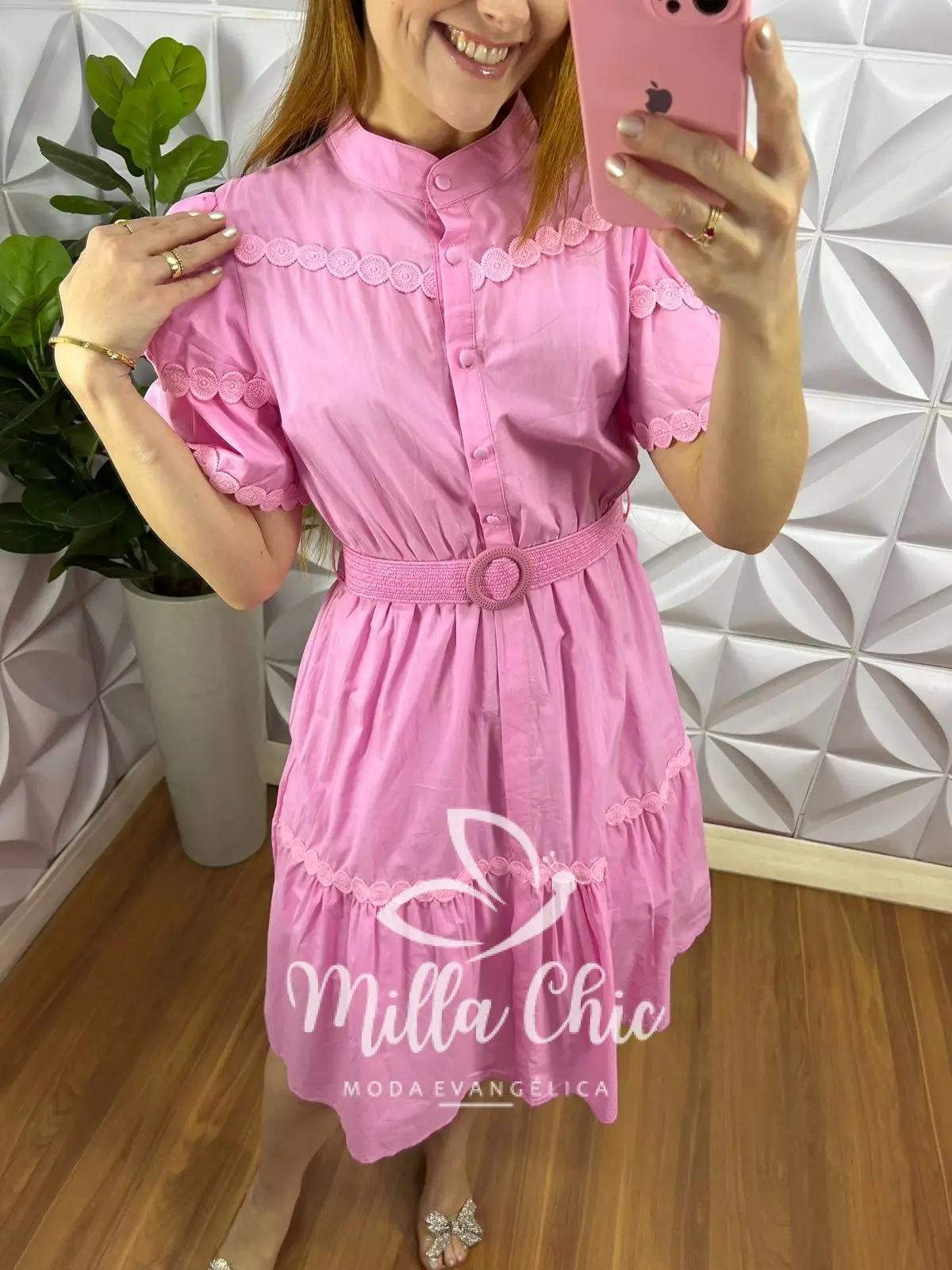 Vestido Tricoline Com Bordados De Guipper e Cinto Stefani – Rosa Ballet