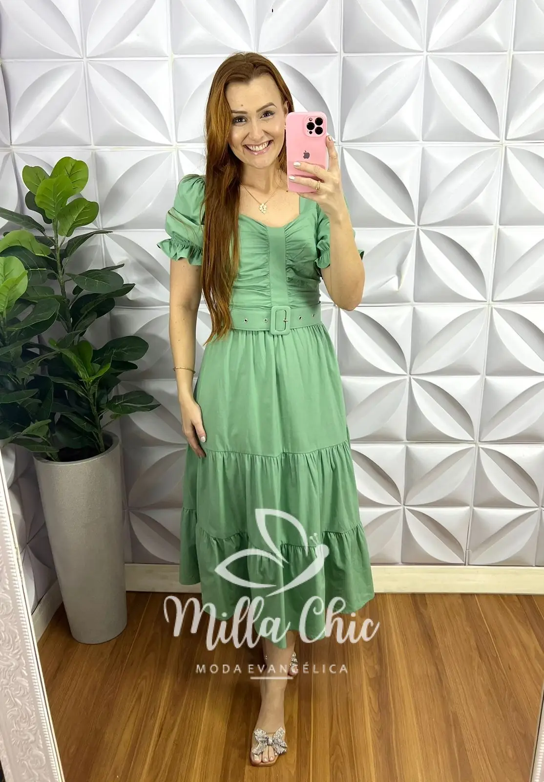 Vestido Tricoline Midi Com Cinto Encapado Emanuela - Verde - Milla Chic