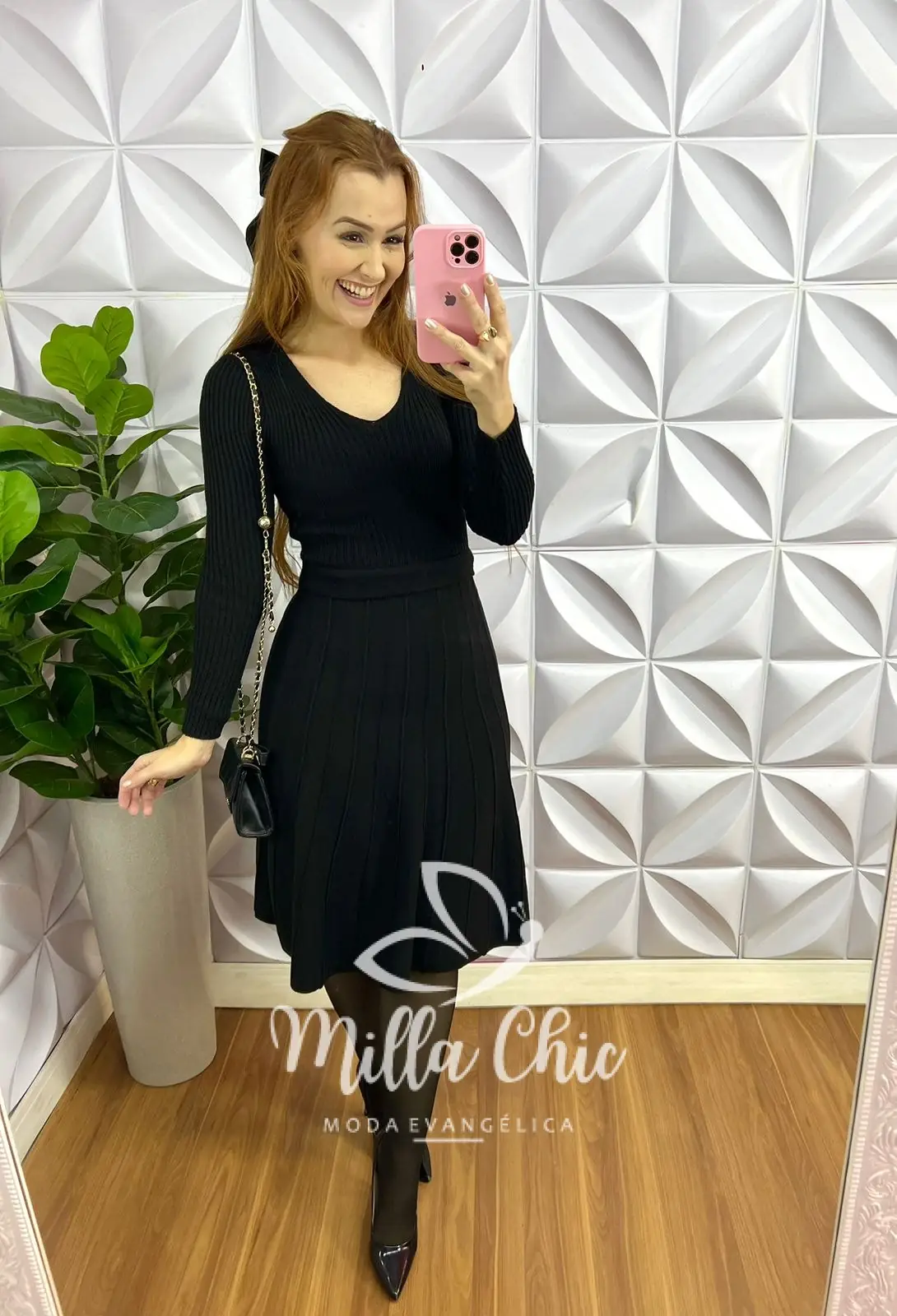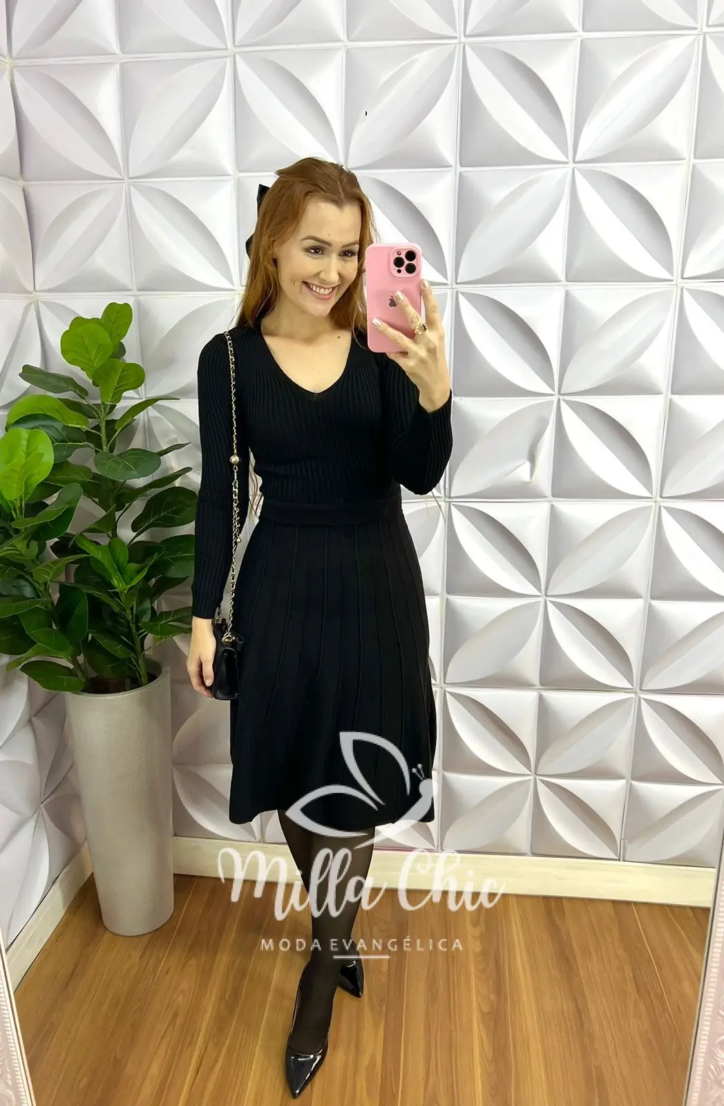 Vestido Tricot Com Pala Na Cintura Saia Evase Lyra - Preto - Milla Chic
