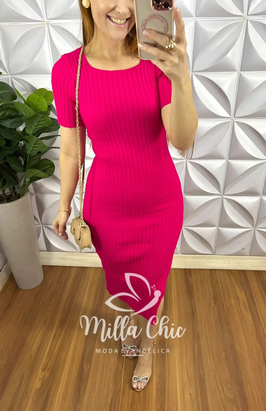 Possui: decote quadrado, manga justa, com detalhe canelado em alto relevo, caimento tubinho, fenda na lateral, comprimento mídi.