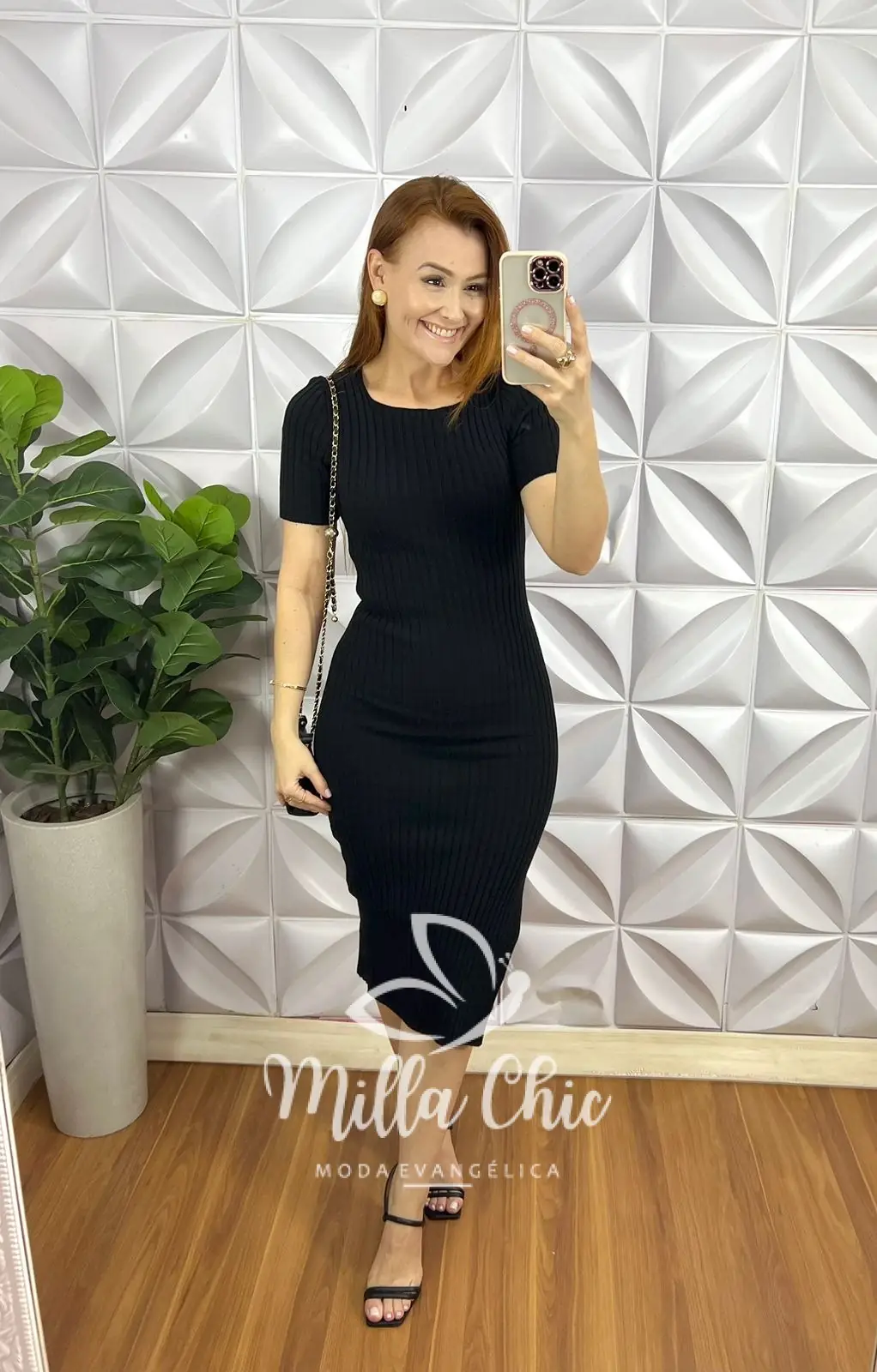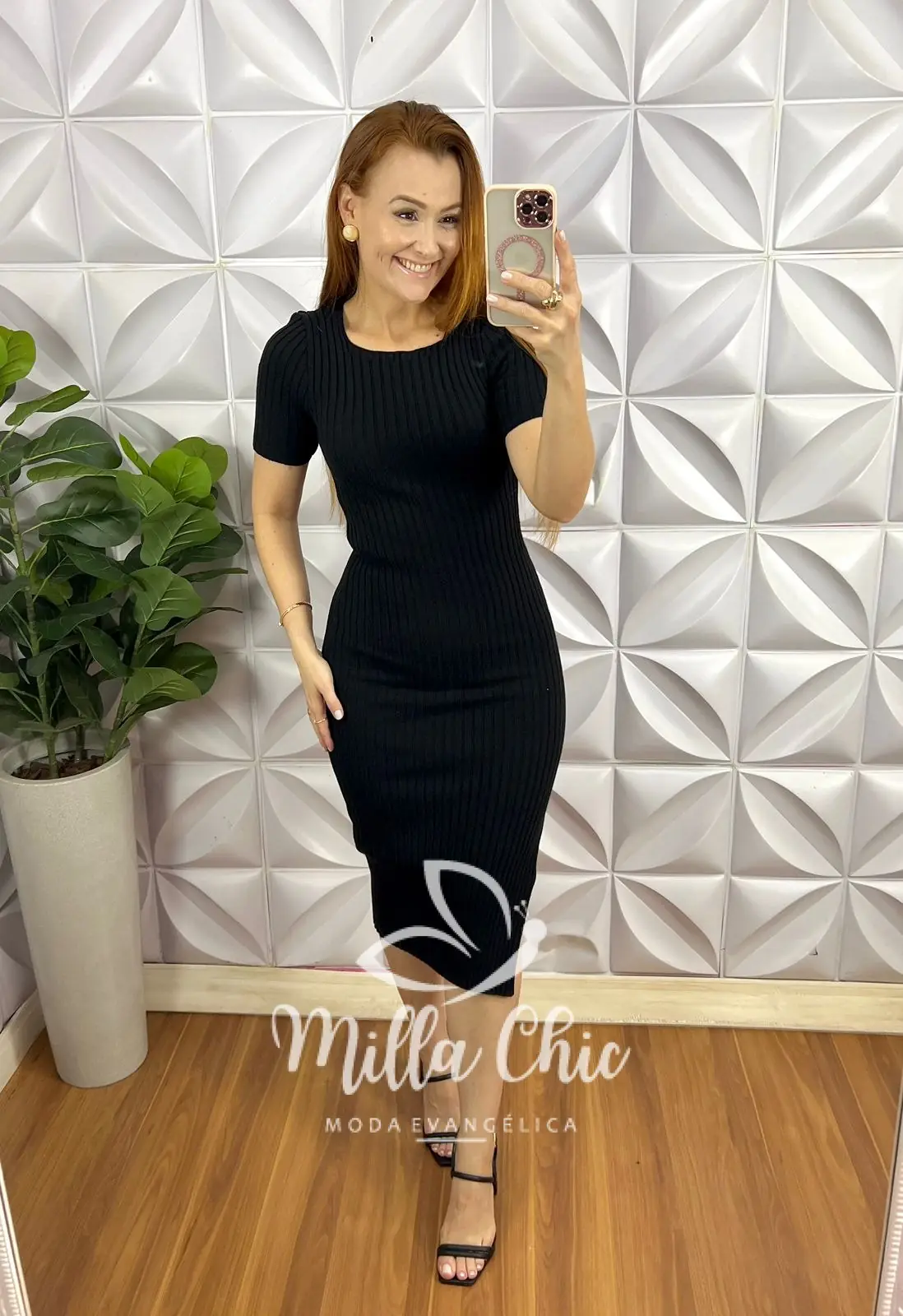 Possui: decote quadrado, manga justa, com detalhe canelado em alto relevo, caimento tubinho, fenda na lateral, comprimento mídi.