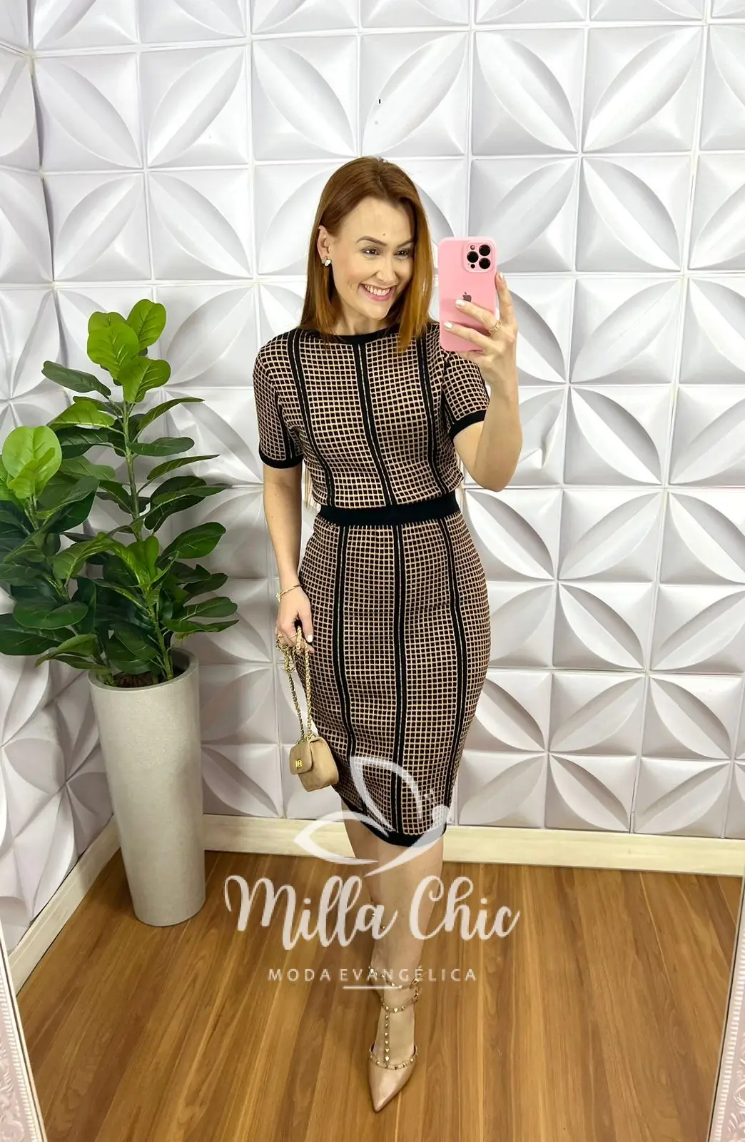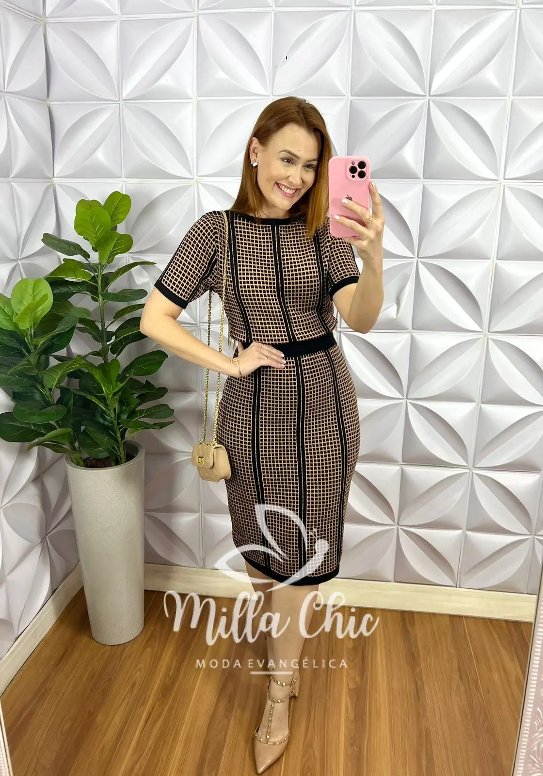 O Vestido de Tricot Modal caimento perfeito, linha com bastante elastano! Estampado quadriculado preto com marrom que esta um charme!