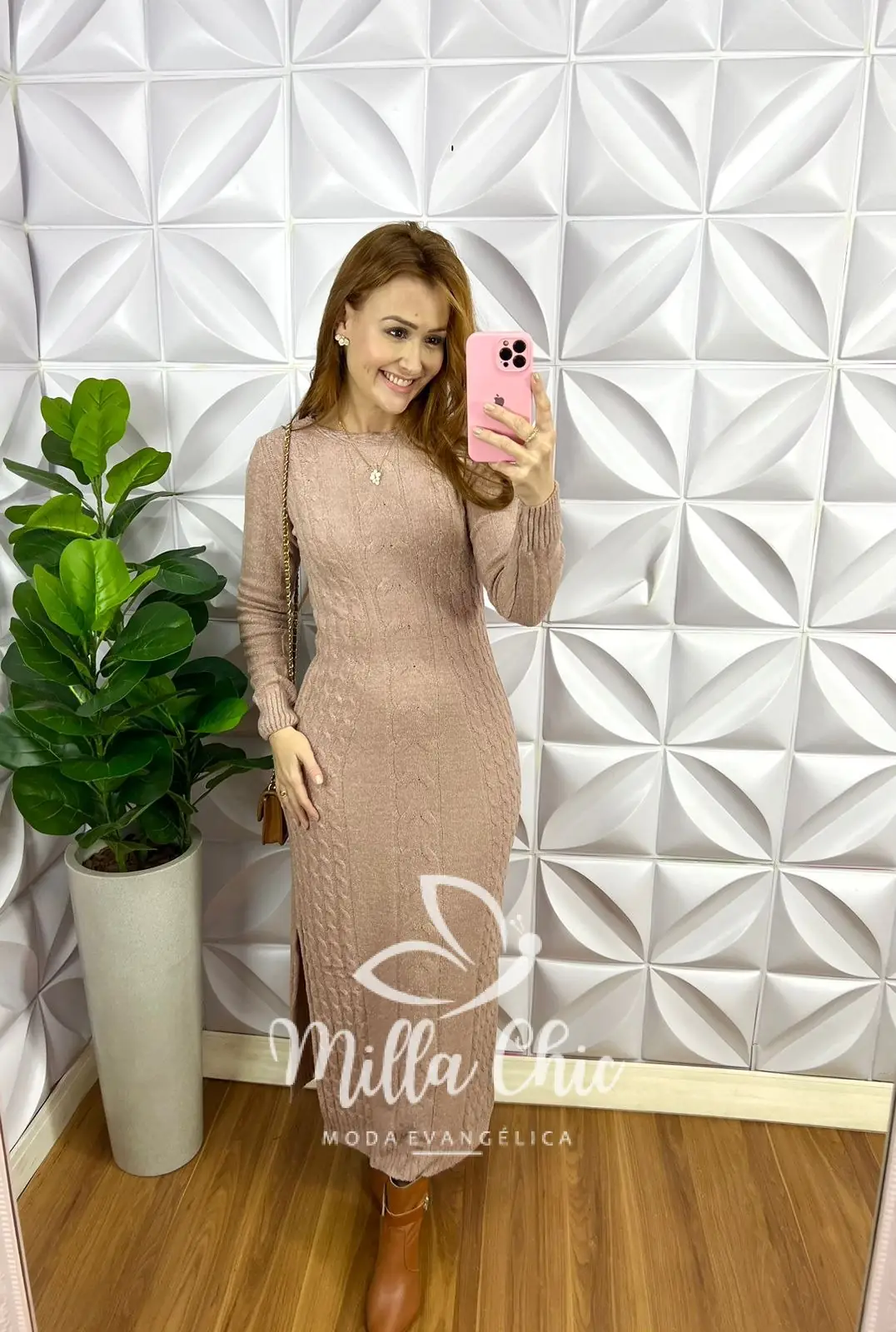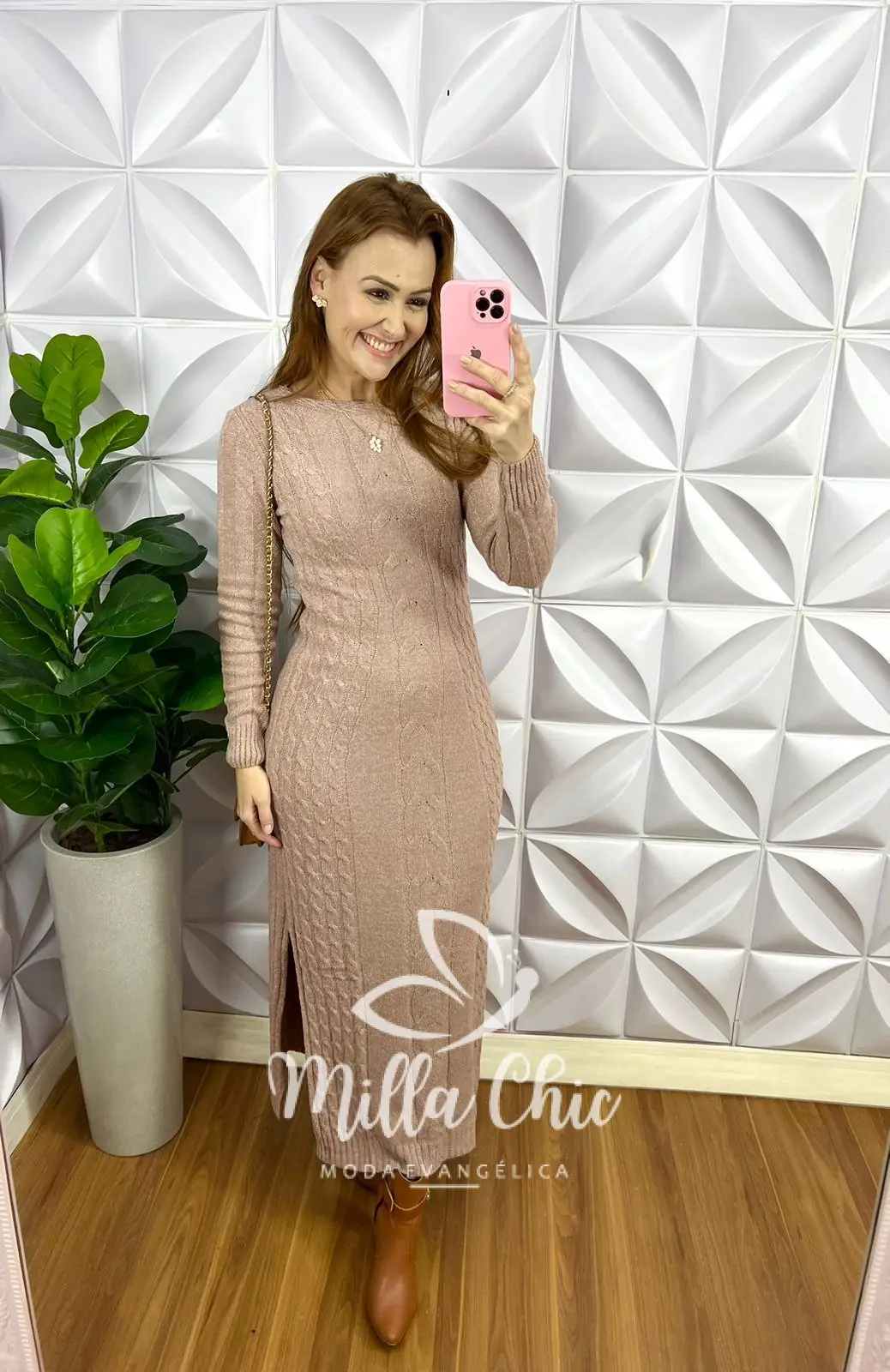 Vestido Tricot Mouse Justo Com Fenda Longo Giovany - Rose - Milla Chic