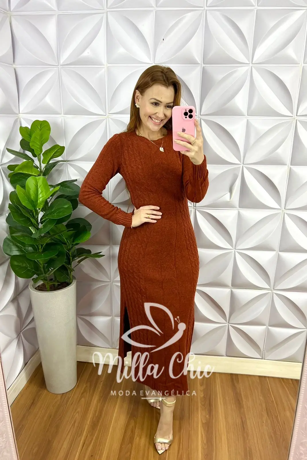 Vestido Tricot Mouse Justo Com Fenda Longo Giovany – Terra Cota