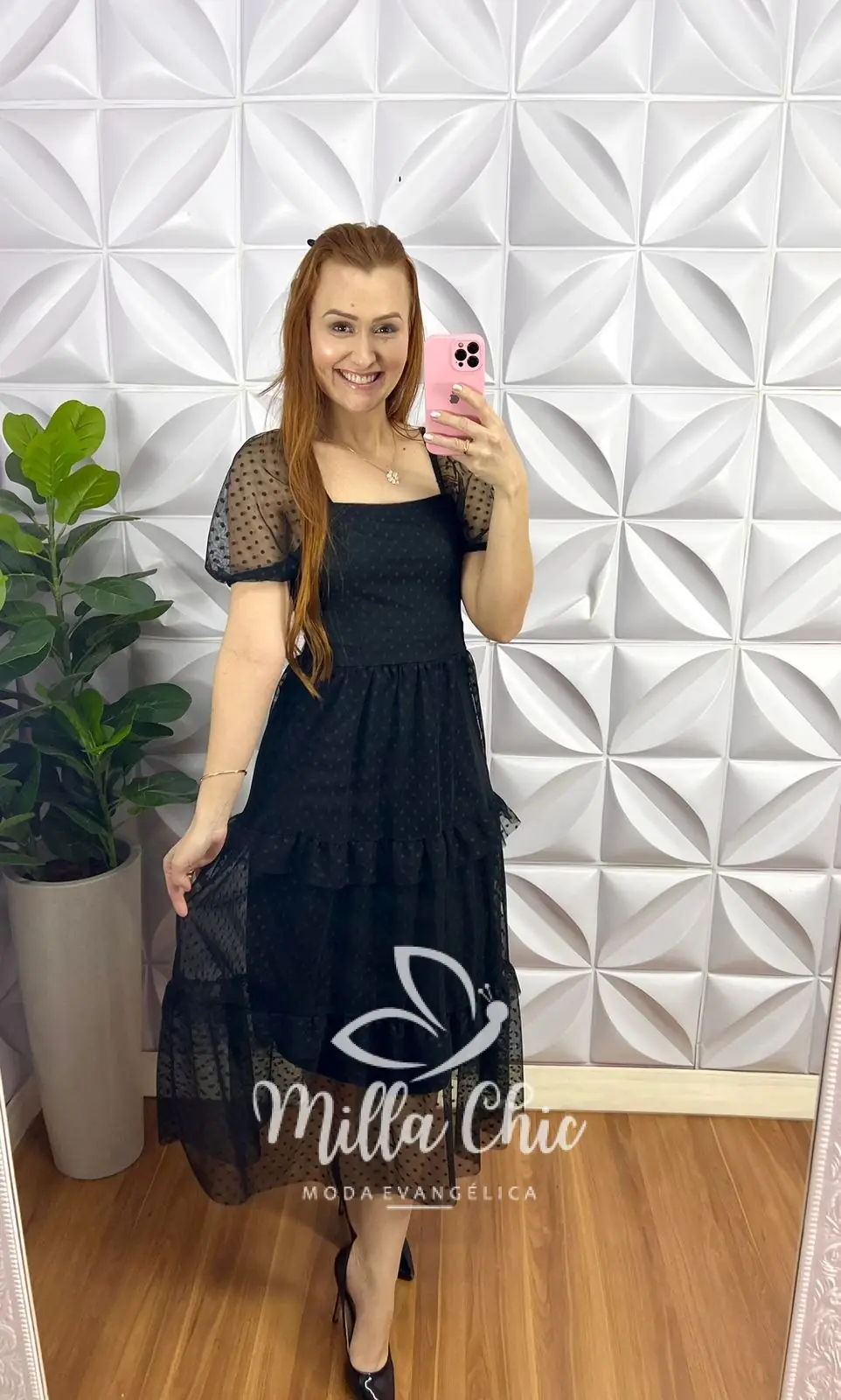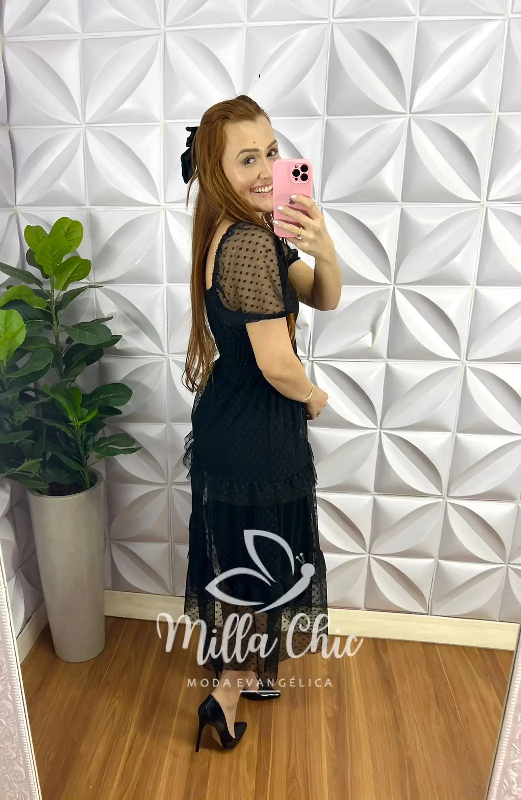 Vestido Tule Bolinha Decote Quadrado Manga Princesa Babadinhos Nas Marias Milene - Preto - Milla Chic