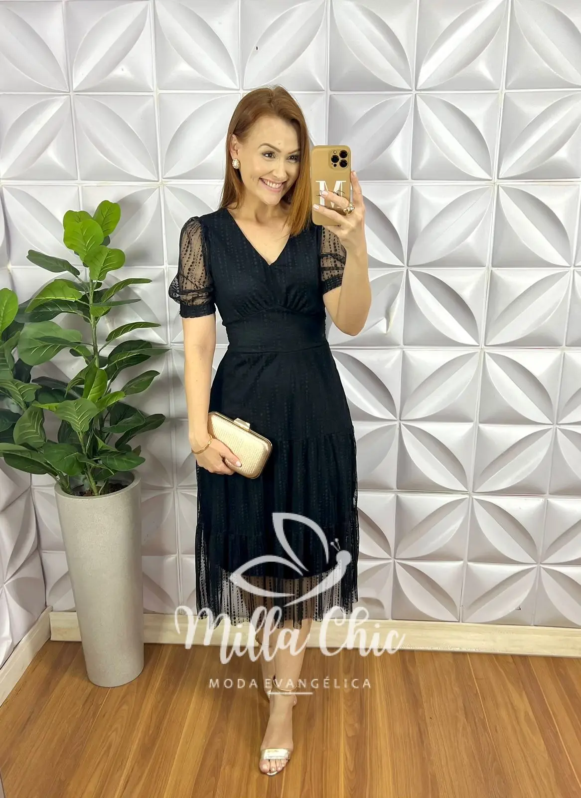 Possui: decote V, manga princesa com transparência, pala na cintura, lastex nas costas, drapeados no busto, comprimento mídi, Três marias. Todo forrado, Faixa cinto.