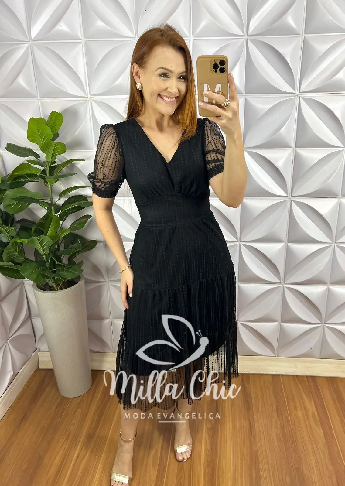 Vestido Tule Bolinha Decote V Manga Princesa Pala Na Cintura Mídi Três Marias Sandra – Preto