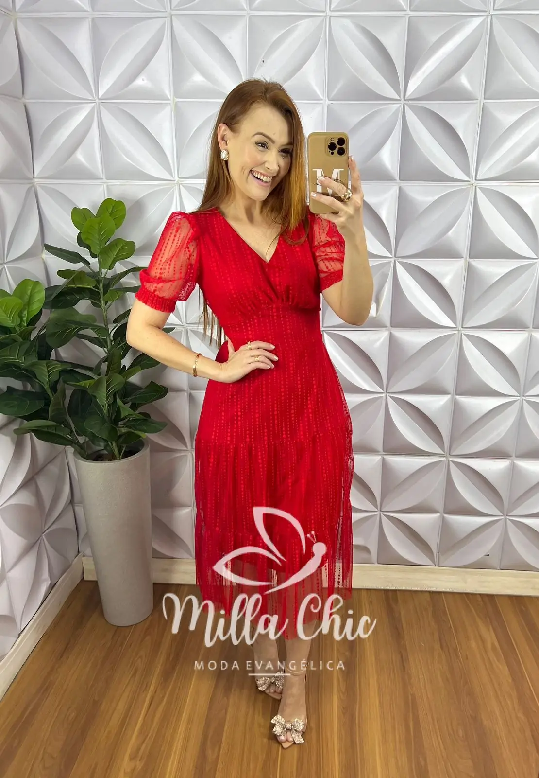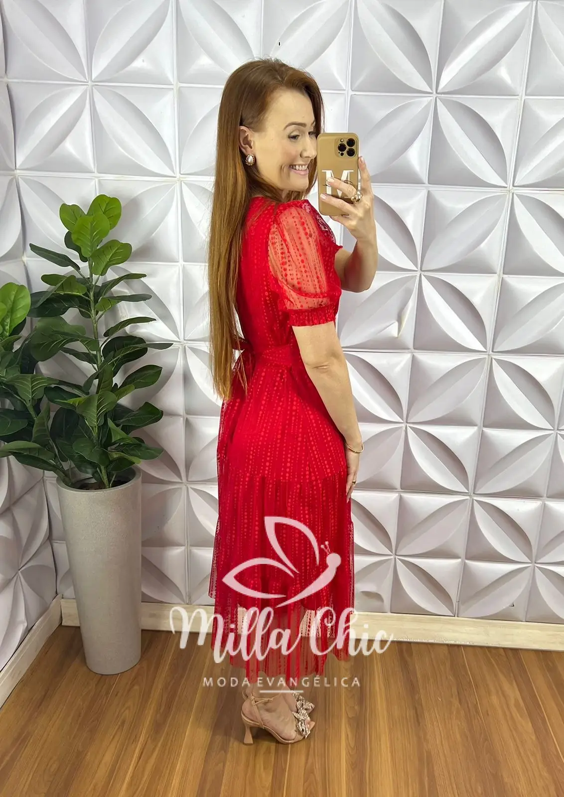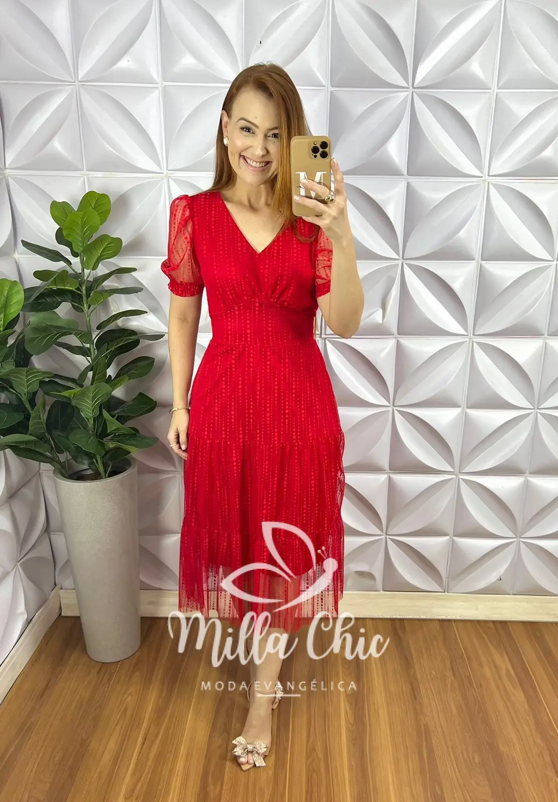 Vestido Tule Bolinha Decote V Manga Princesa Pala Na Cintura Mídi Três Marias Sandra – Vermelho