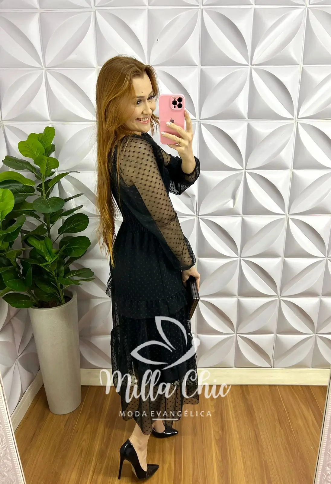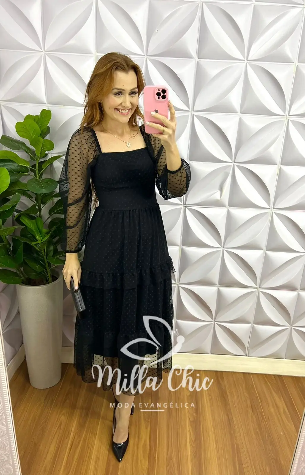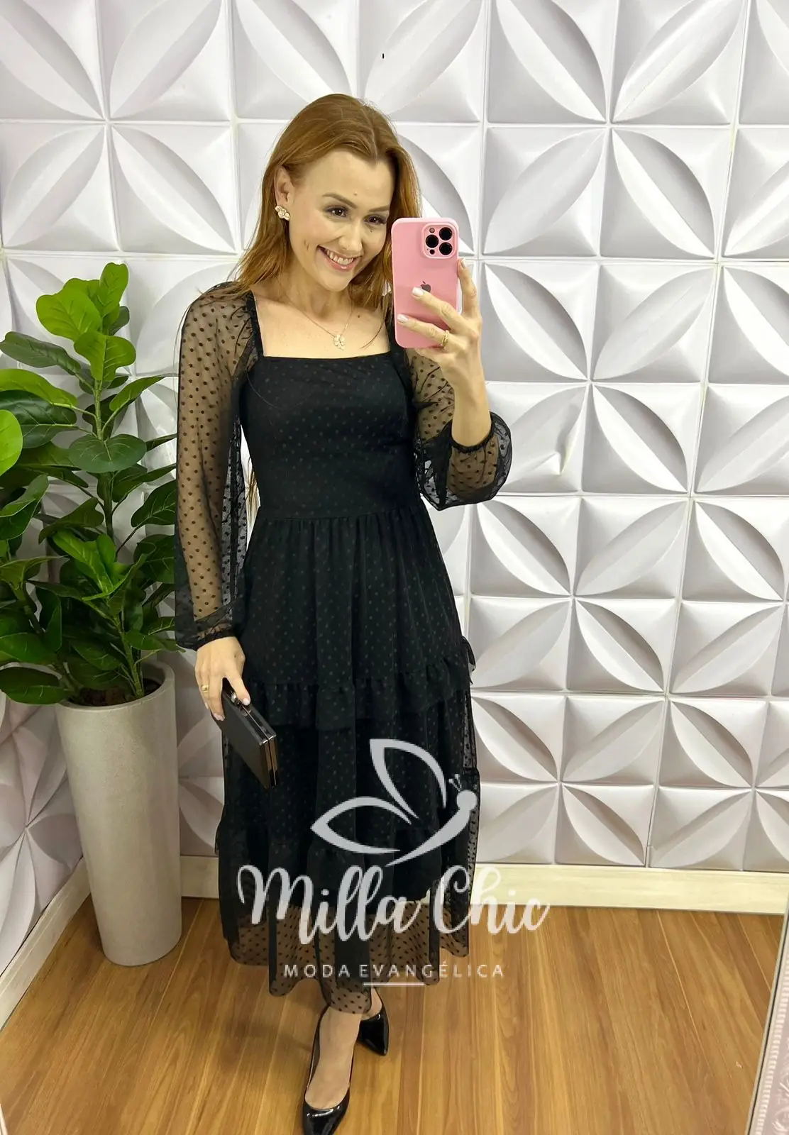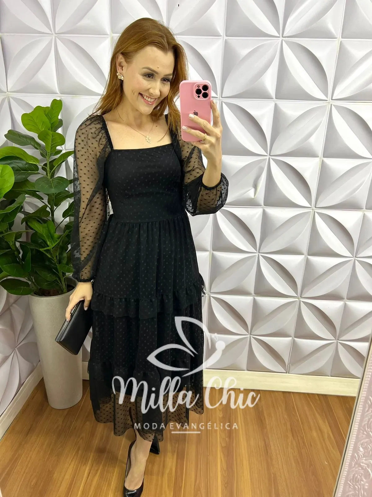 Vestido Tule Bolinha Manga Longa Decote Quadrado Mídi Com Babadinhos Hadasa - Preto - Milla Chic