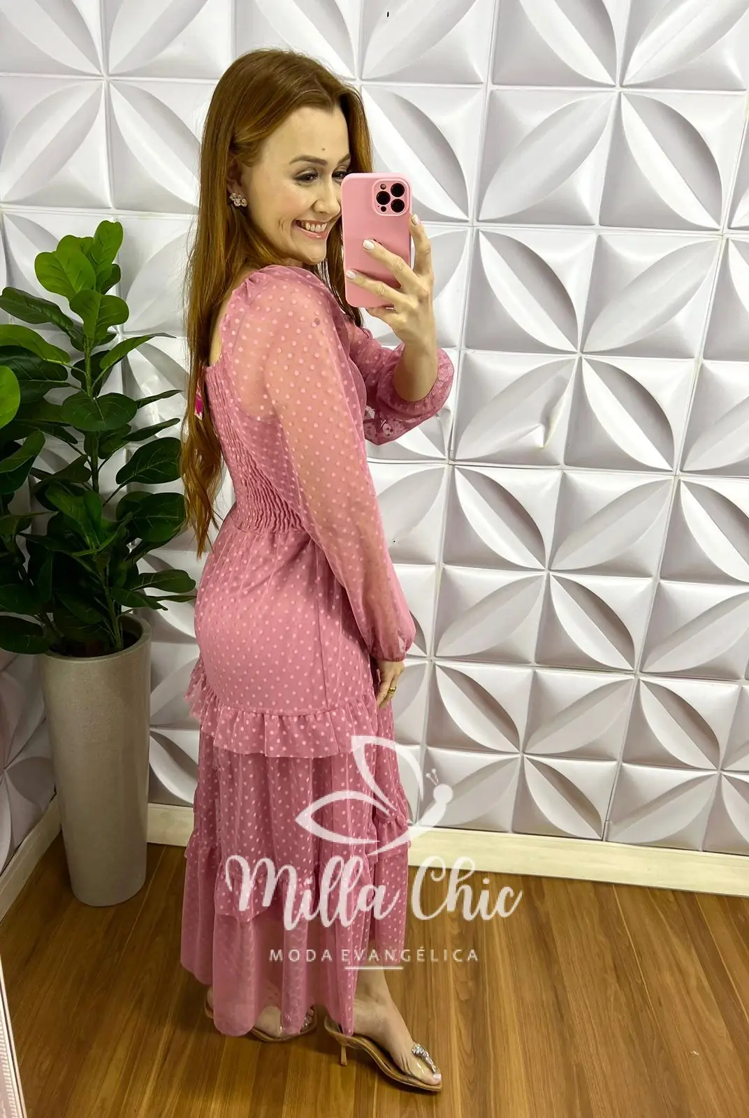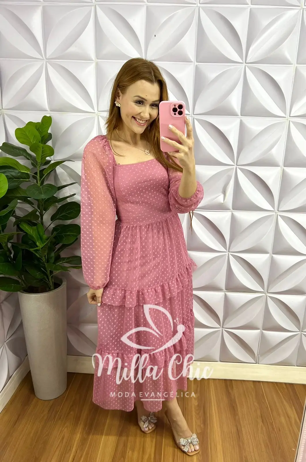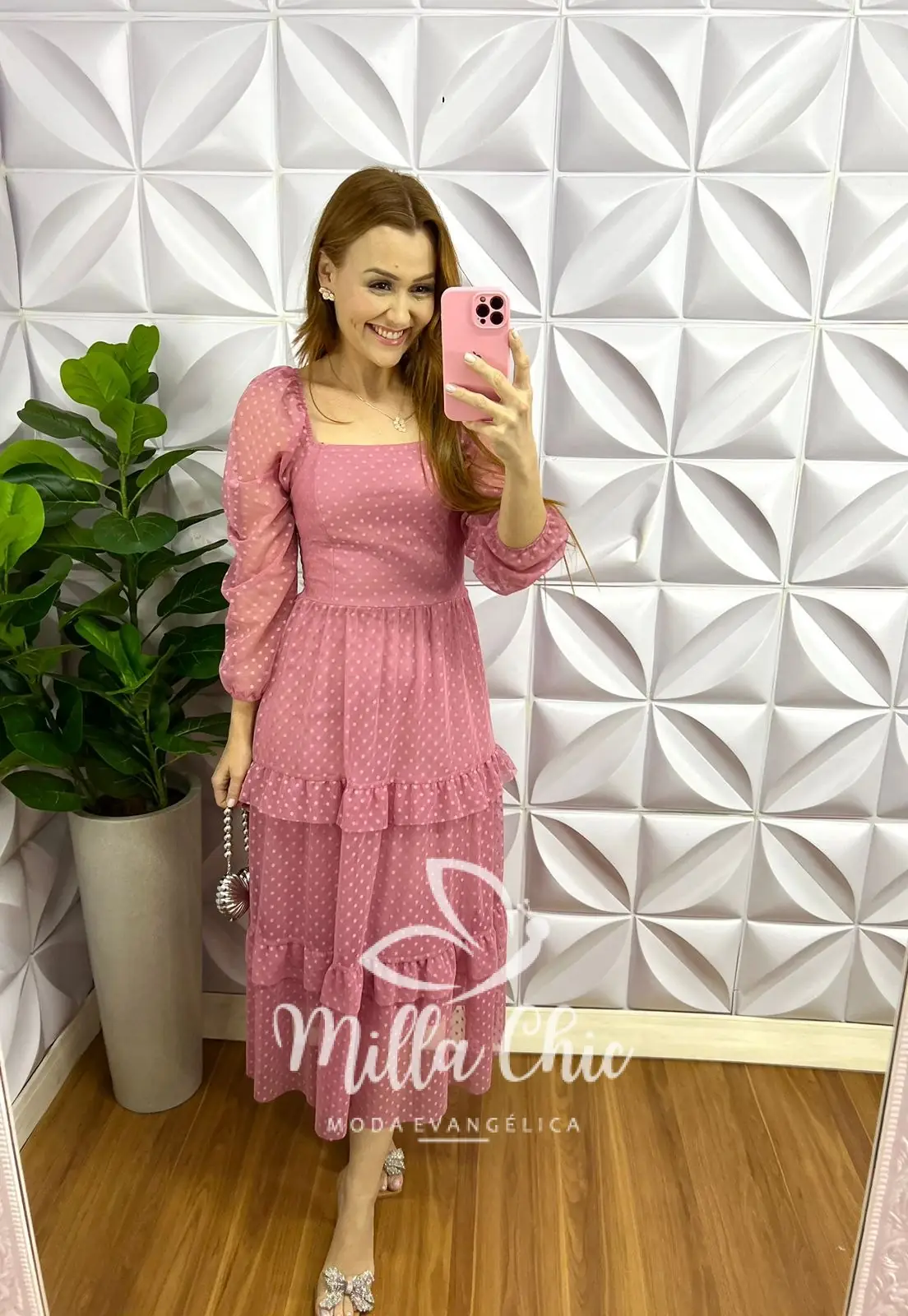 Vestido Tule Bolinha Manga Longa Decote Quadrado Mídi Com Babadinhos Hadasa - Rosa - Milla Chic
