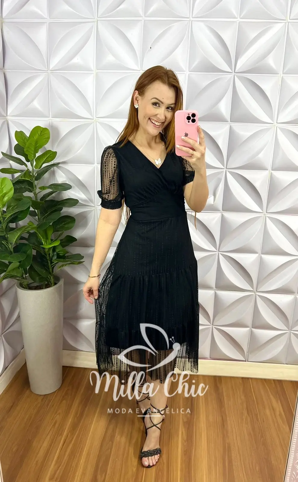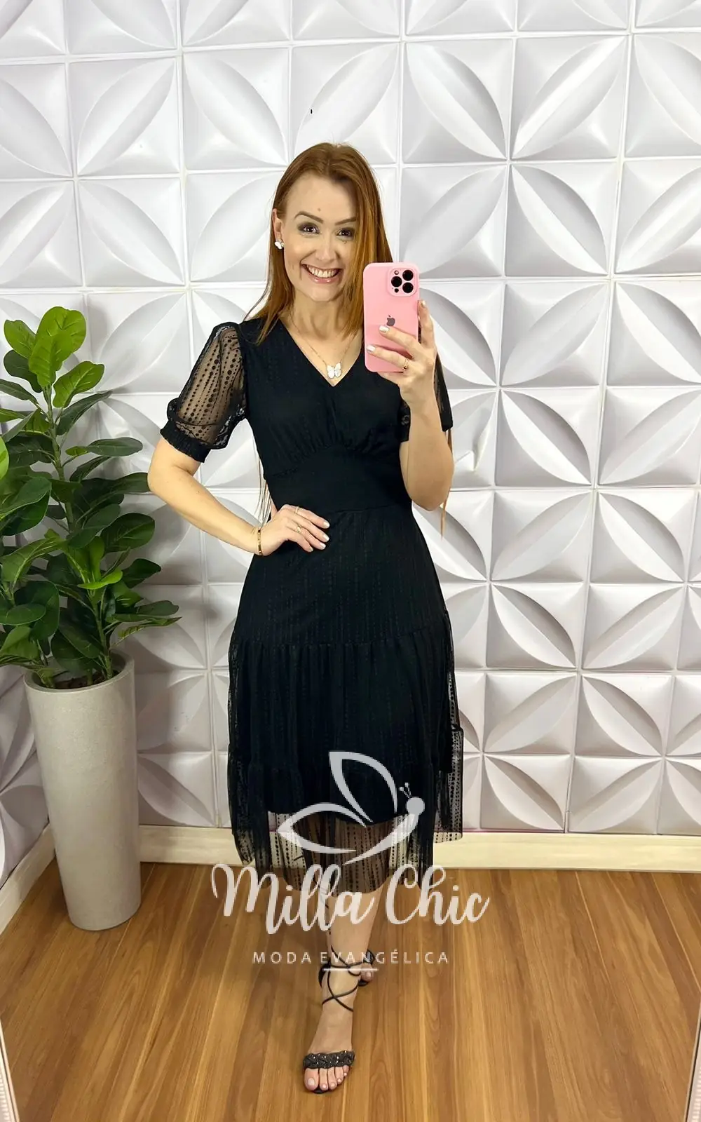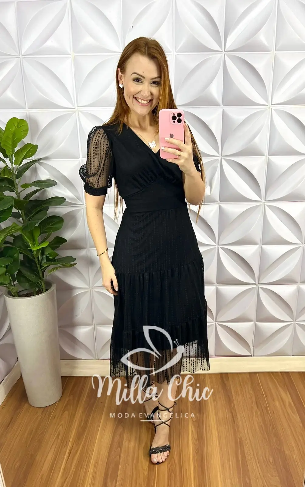 Vestido Tule Bolinha Decote V Pala Na Cintura Três Marias Manga Princesa Sandra – Preto