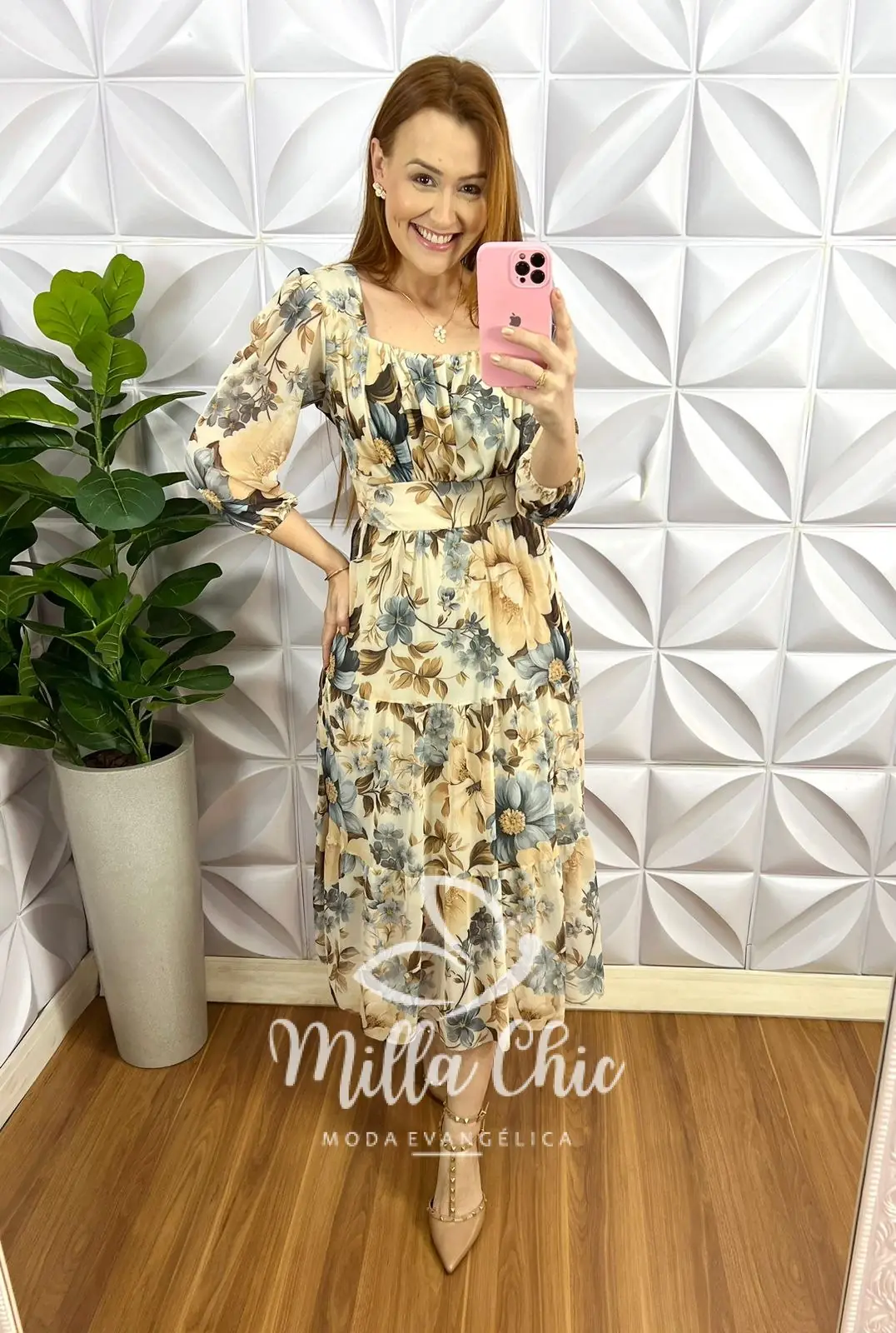 Possui: decote quadrado, todo drapeado no busto que está um charme, manga 7/8 princesa com elástico na barra, pala na cintura para vestir bem, comprimento mídi com marias.