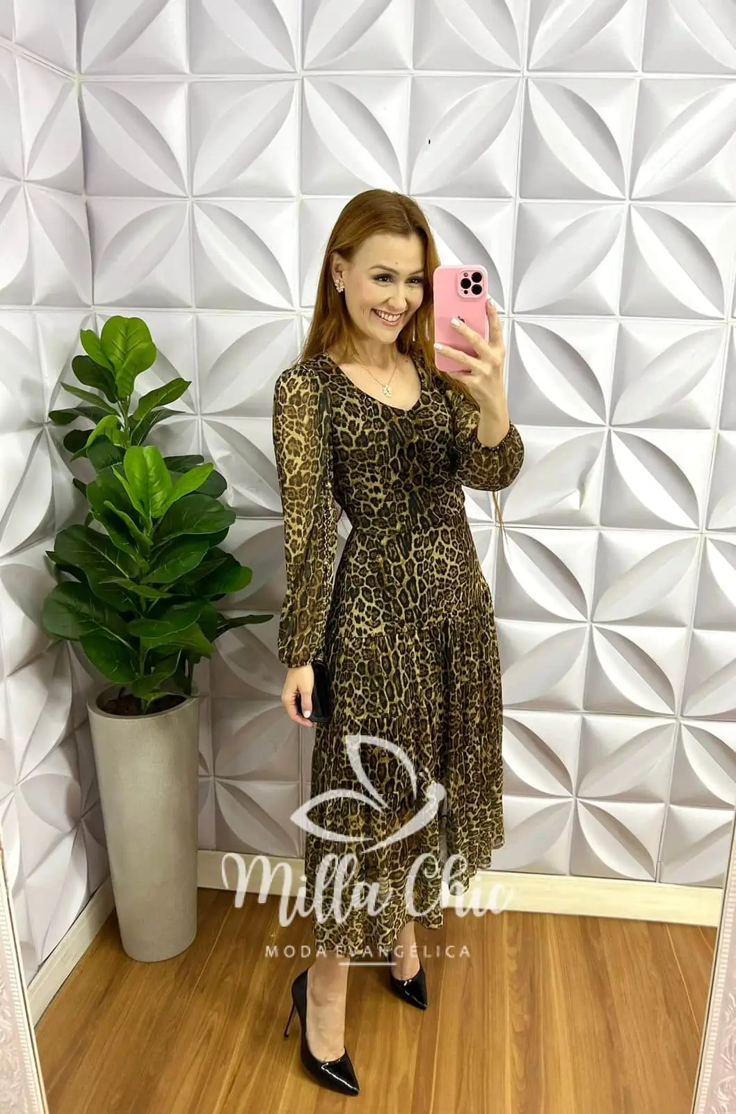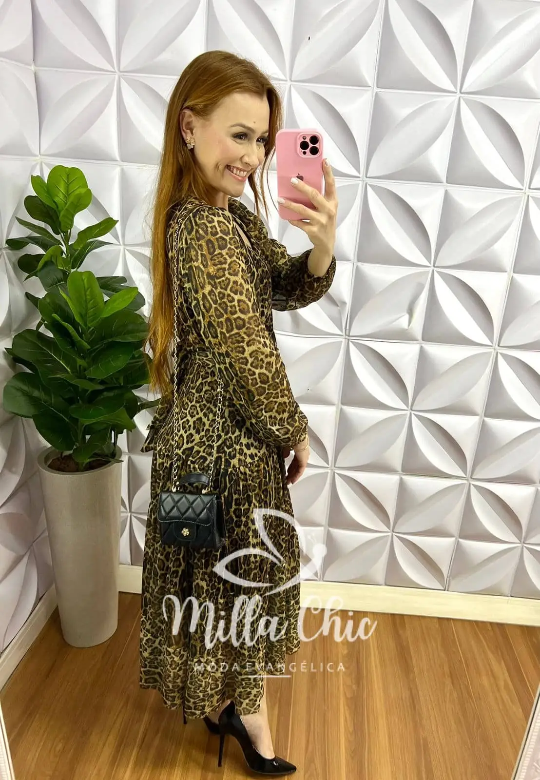 Vestido Tule Decote U Manga Longa Com Faixa Cinto Mídi Com Marias Cleonice - Onça - Milla Chic