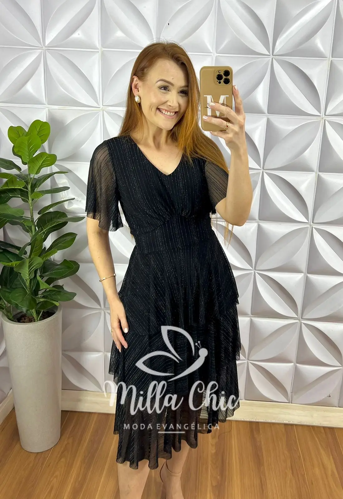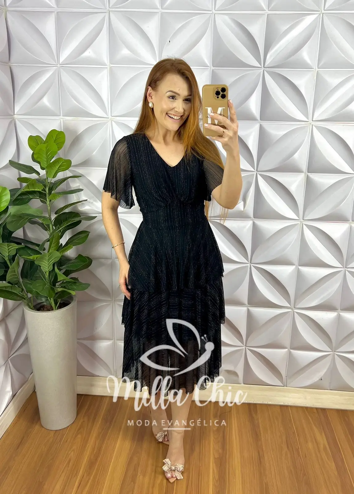 Vestido Tule Fios De Lurex Decote V Mídi Com Babados Três Marias Estrelar – Preto