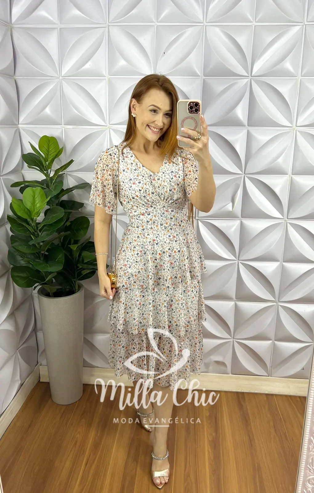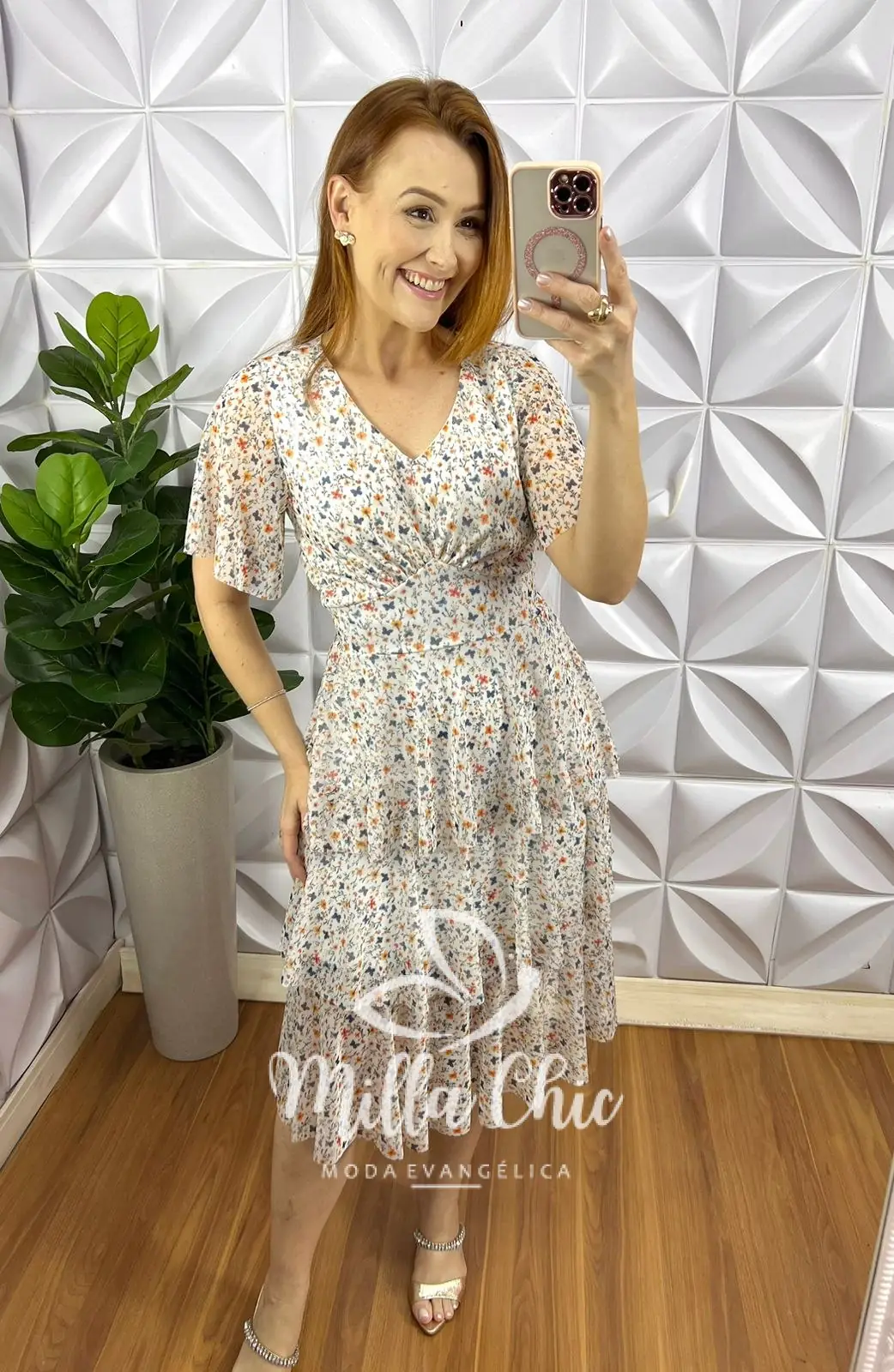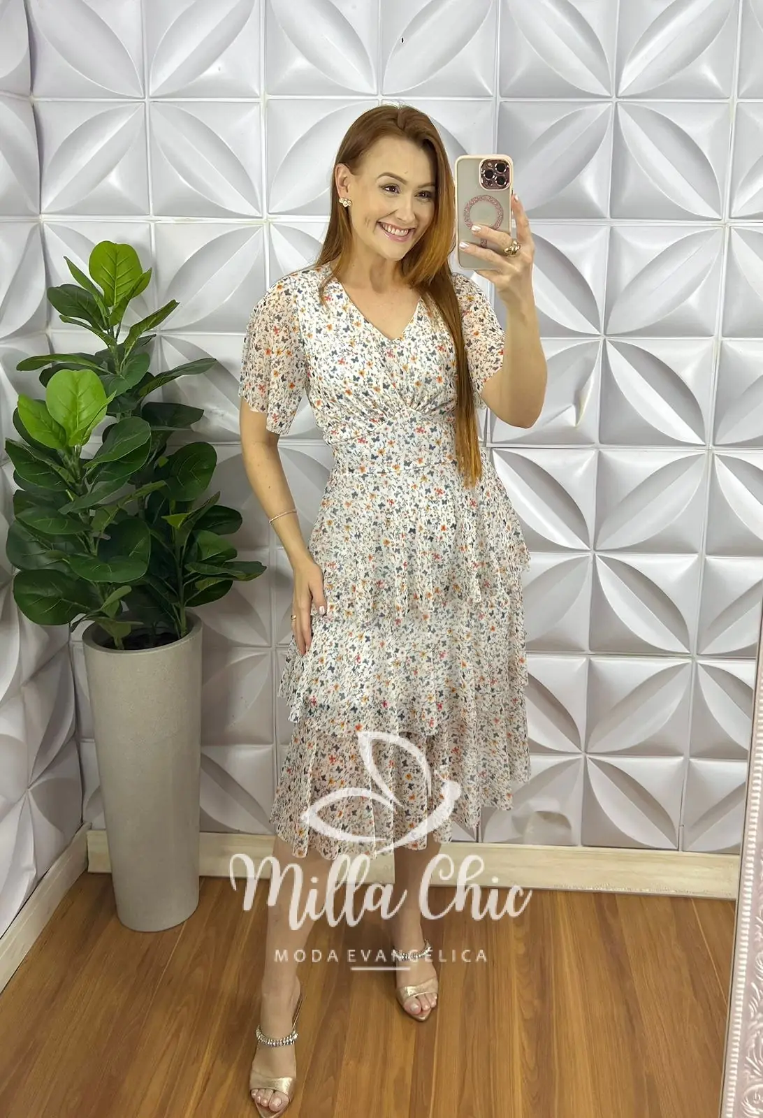 Vestido Tule Decote V Manga Soltinha Mídi Com Babados Três Marias Barbara – Branco