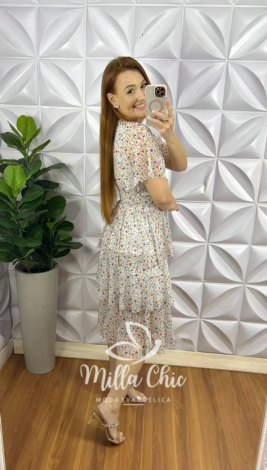 Possui: decote V, com drapeados no busto, pala abaixo do busto marcando a cintura, manga soltinha, lastex nas costas, comprimento mídi, babados Três marias, todo forrado.