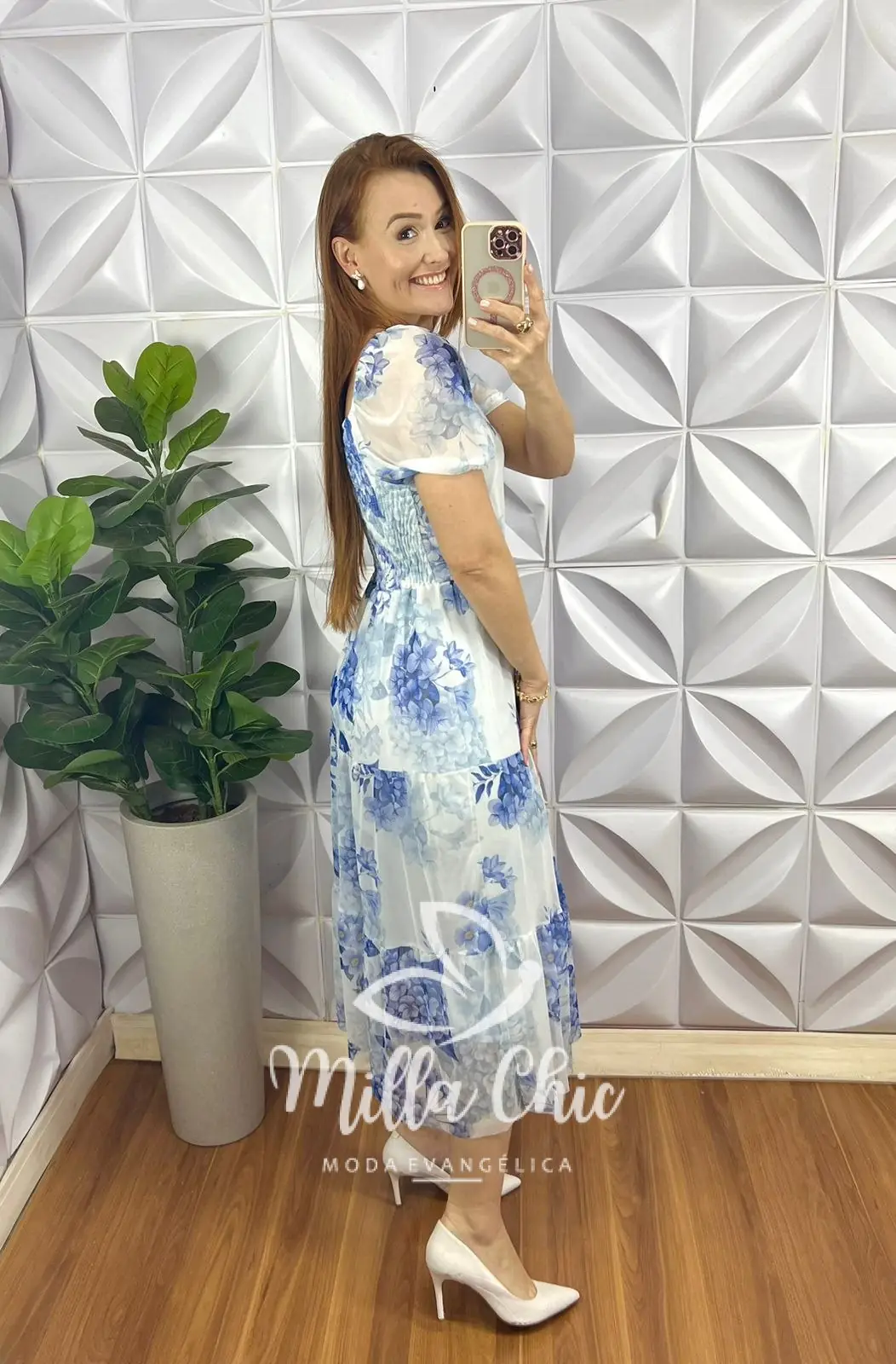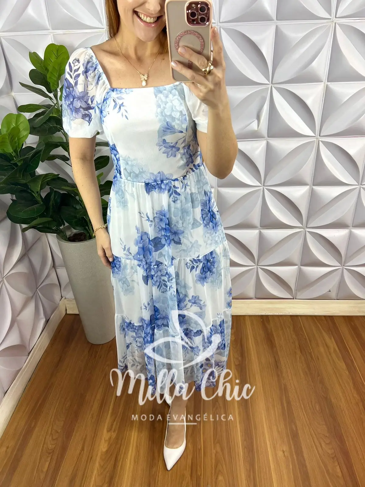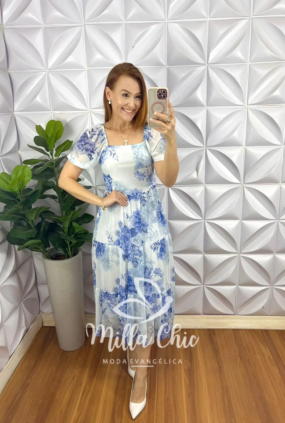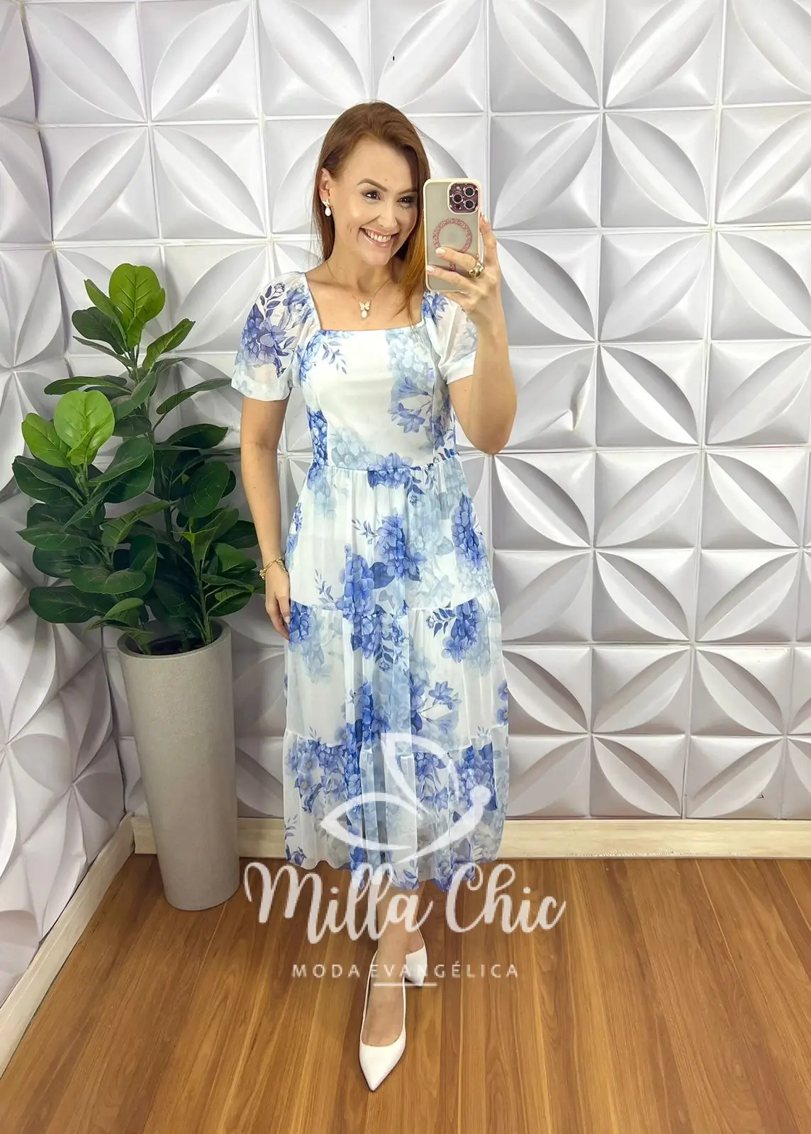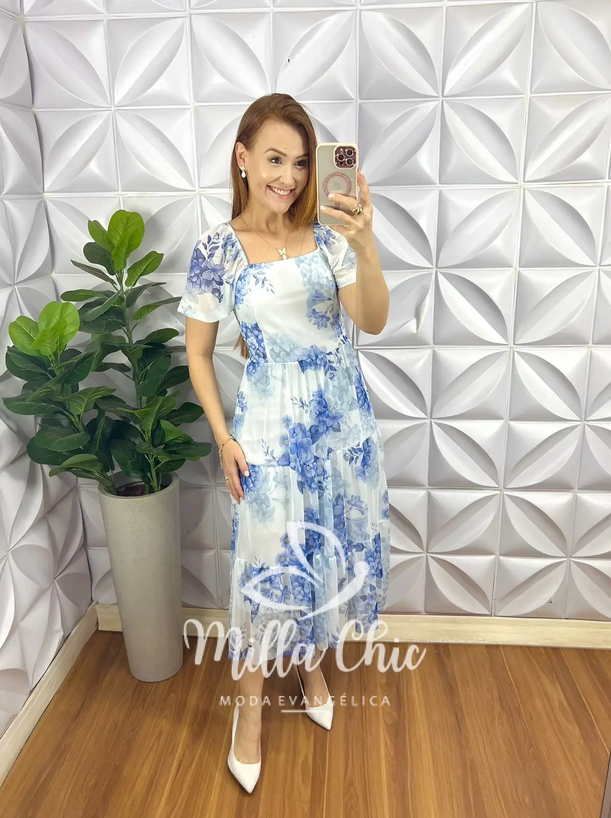 Vestido Tule Decote Quadrado Manga Princesa Lastex Nas Costas Mídi Três Marias Margarida – Azul (Floral)