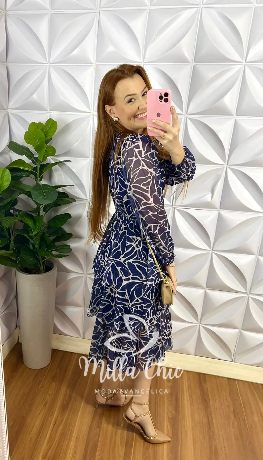 Vestido Tule Decote V Manga Longa Mídi Com Babados Três Marias Melinda - Azul ( Floral) - Milla Chic