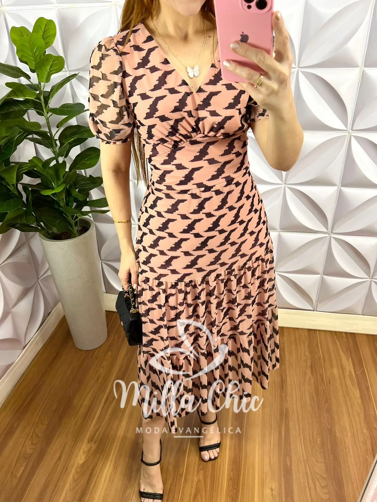 Vestido Tule Decote V Pala Na Cintura Três Marias Manga Princesa Sandra – Rosa Com Preto