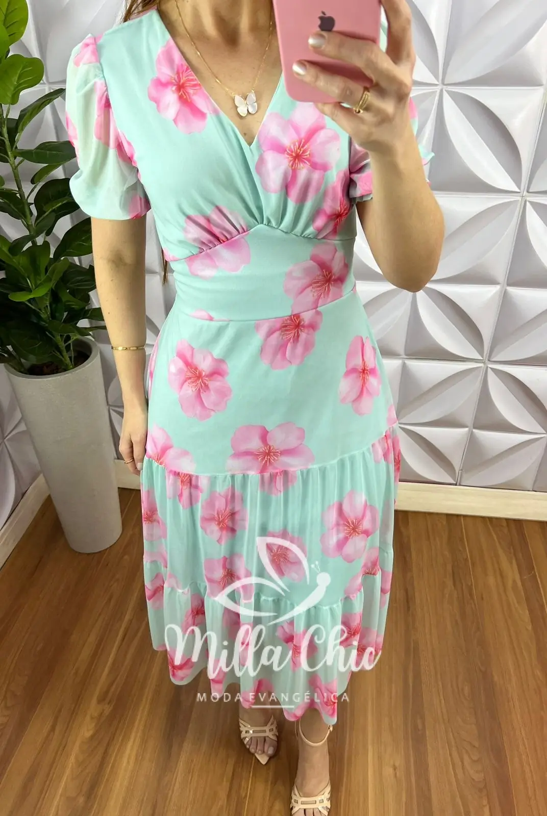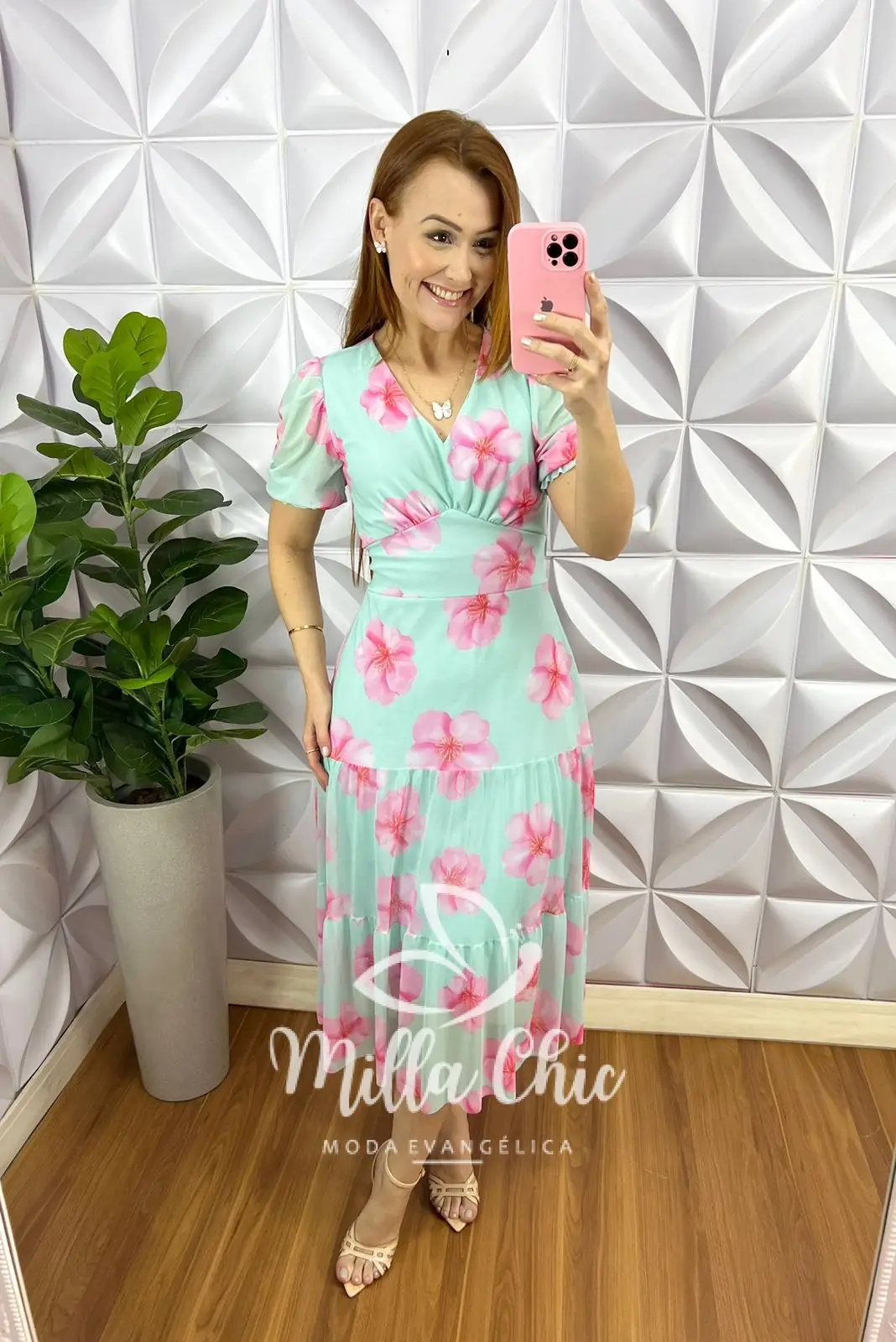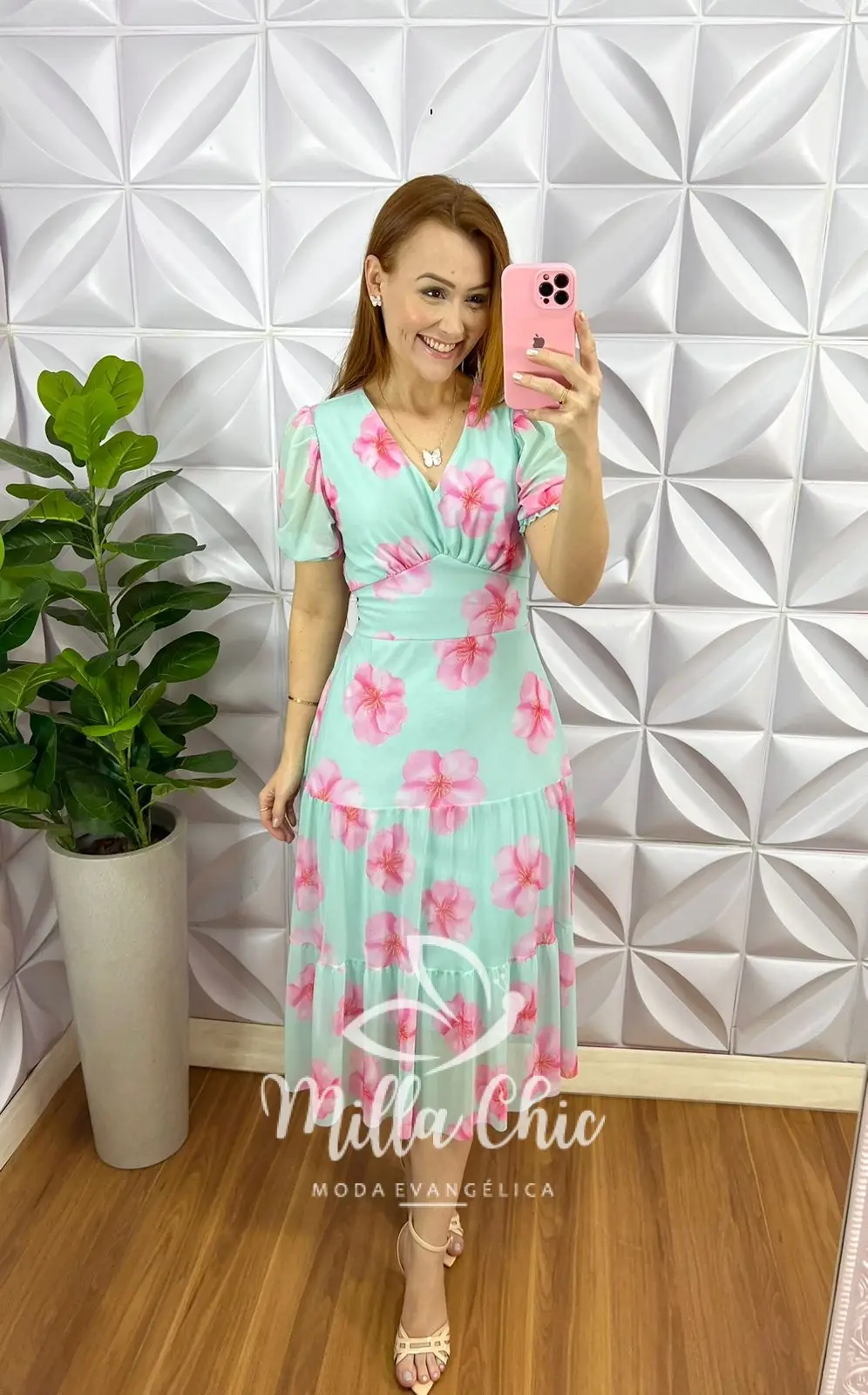 Vestido Tule Decote V Pala Na Cintura Três Marias Manga Princesa Sandra – Verde Agua E Rosa