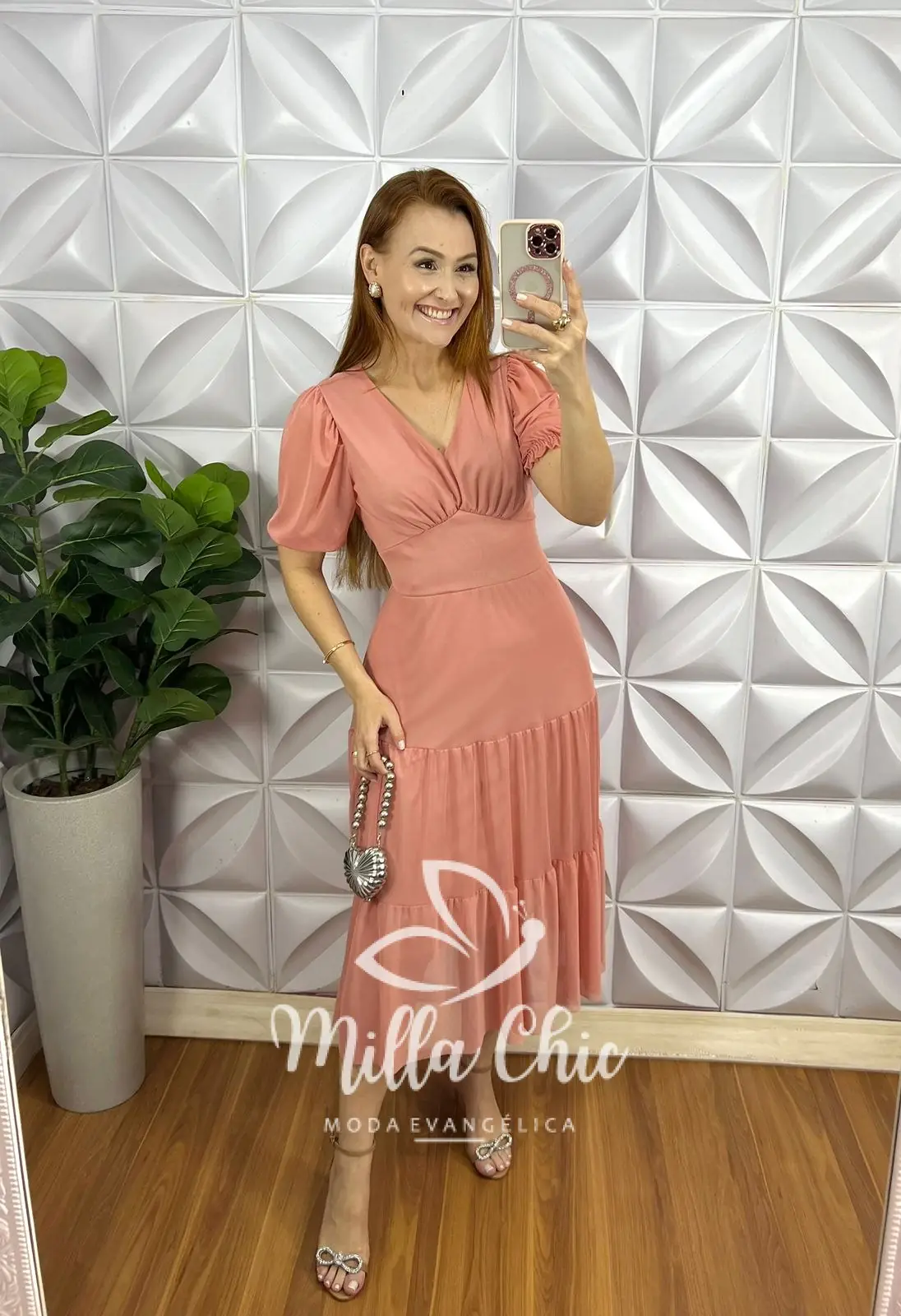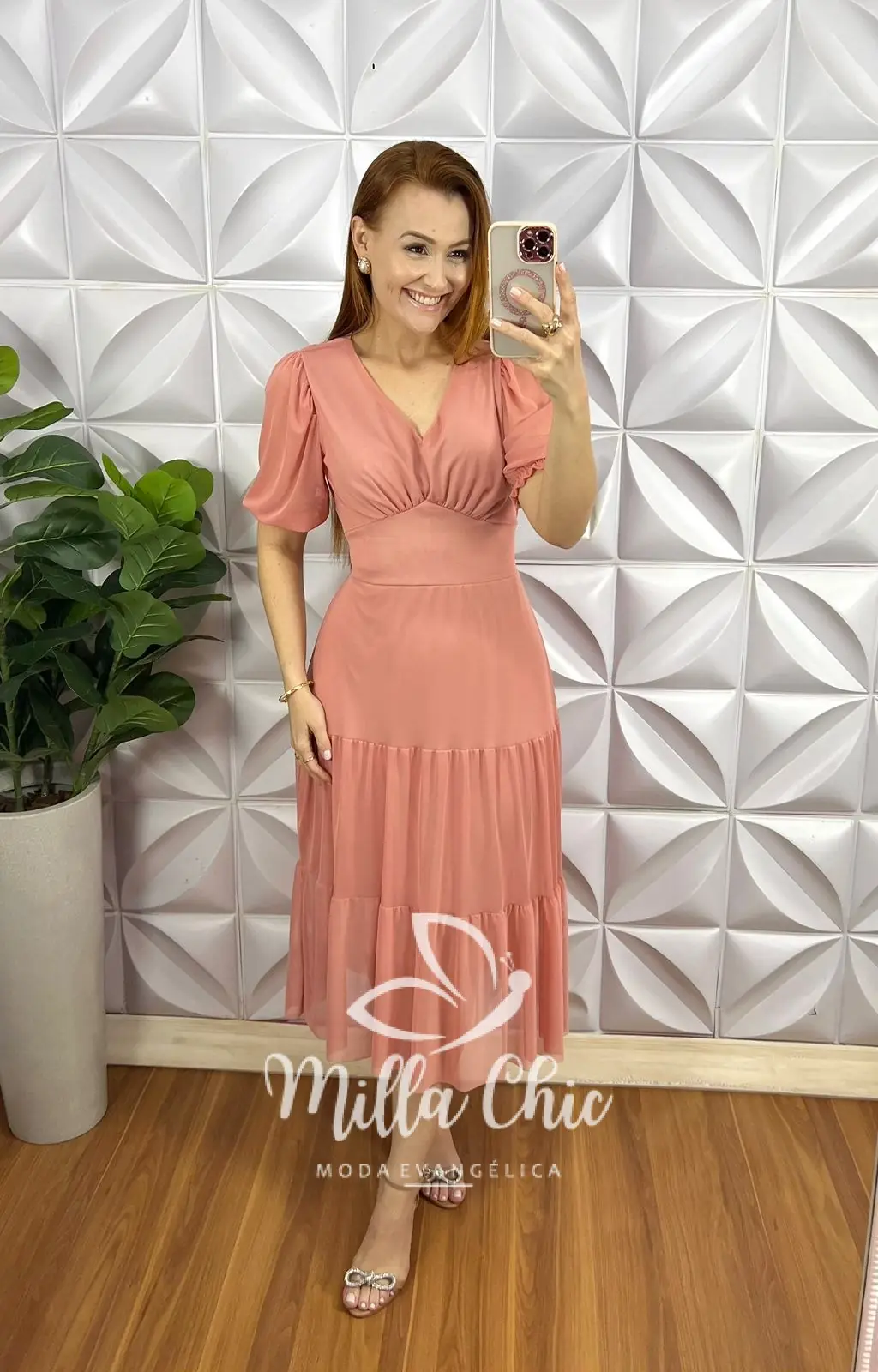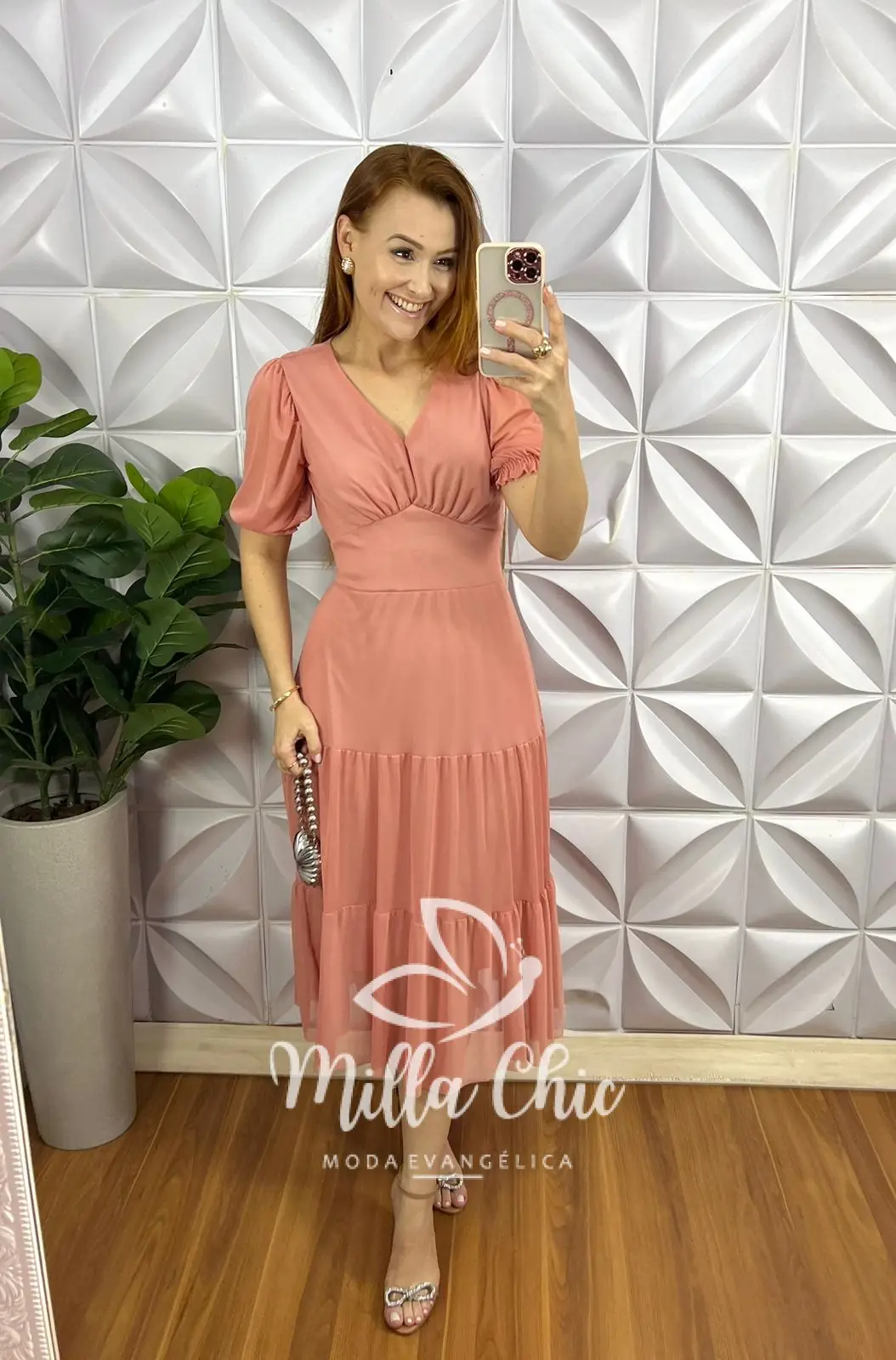Possui: decote V, manga princesa com transparência, pala na cintura, drapeados no busto, comprimento mídi, Três marias. Todo forrado, Faixa cinto.