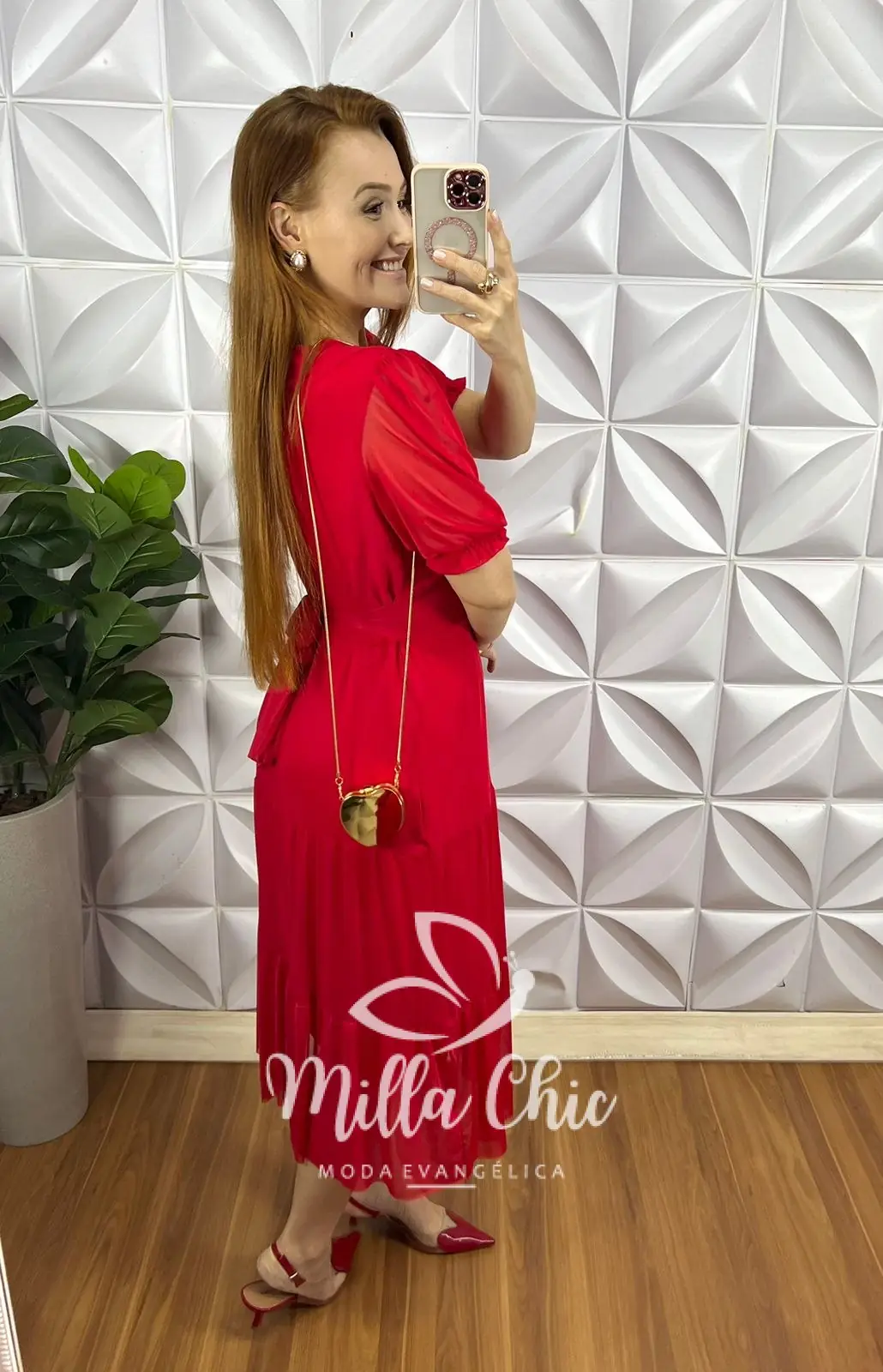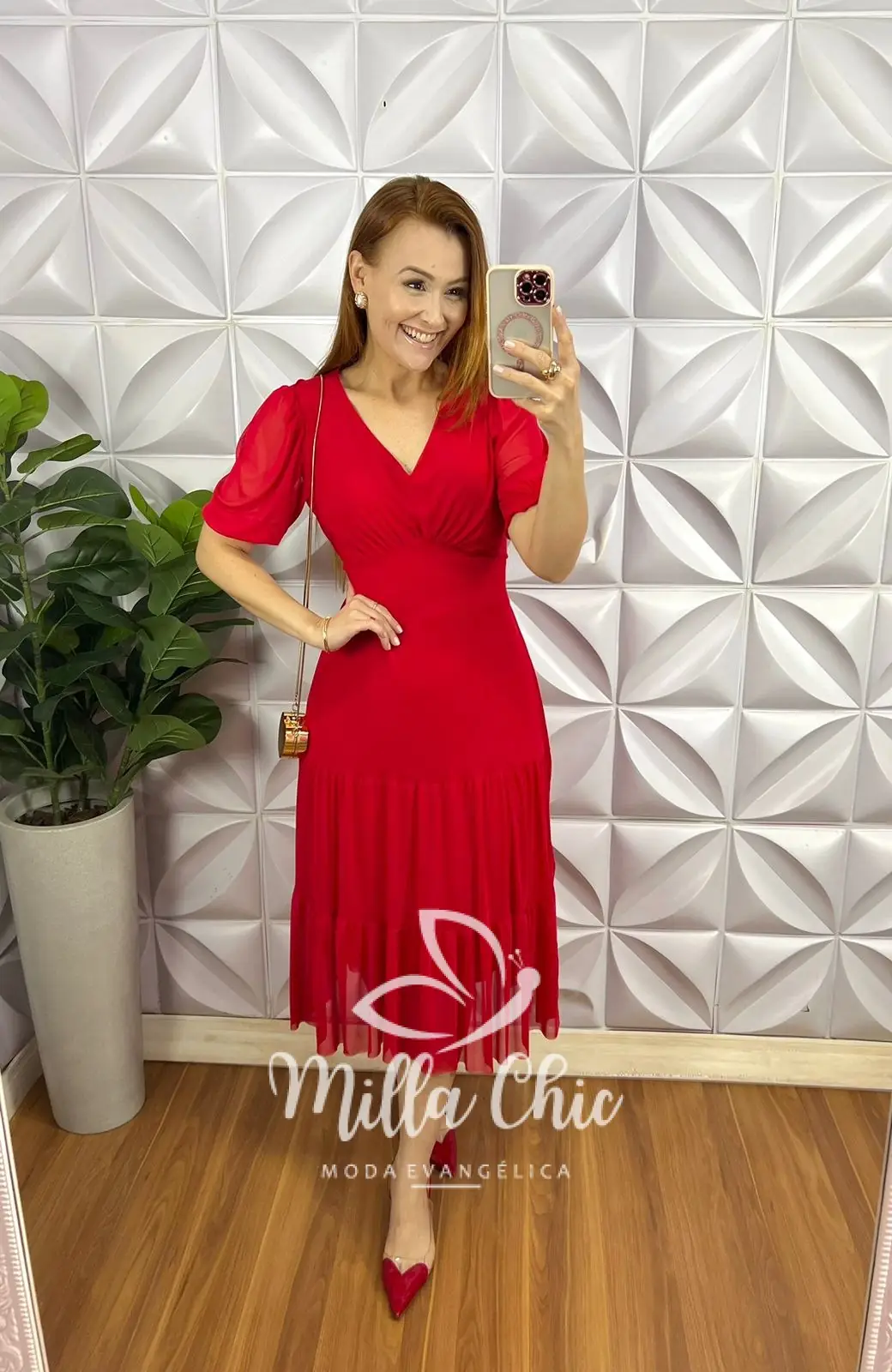 Vestido Tule Decote V Pala Na Cintura Três Marias Manga Princesa Sandra – Vermelho