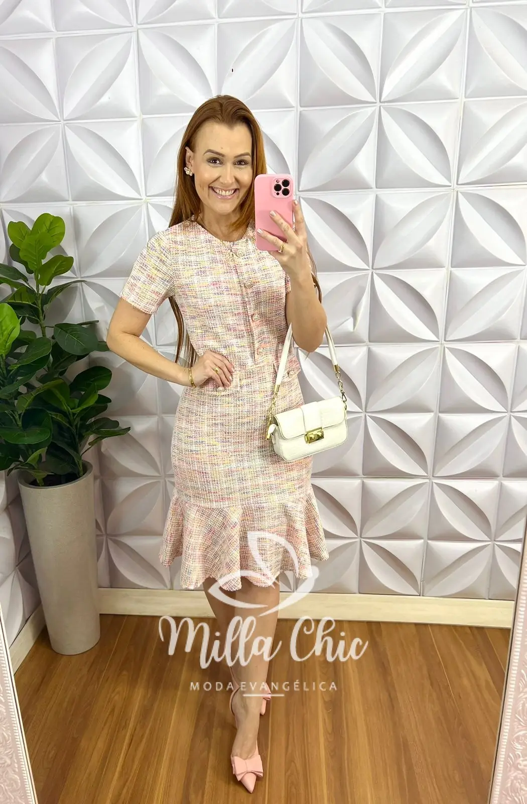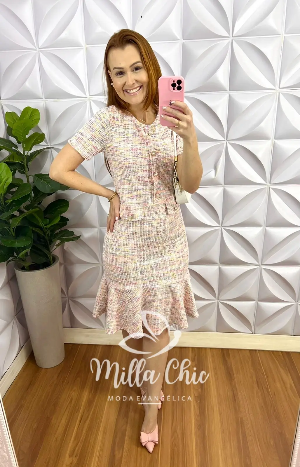 Vestido Tweed Com Lurex Botões De Perola Camila - Rosa - Milla Chic