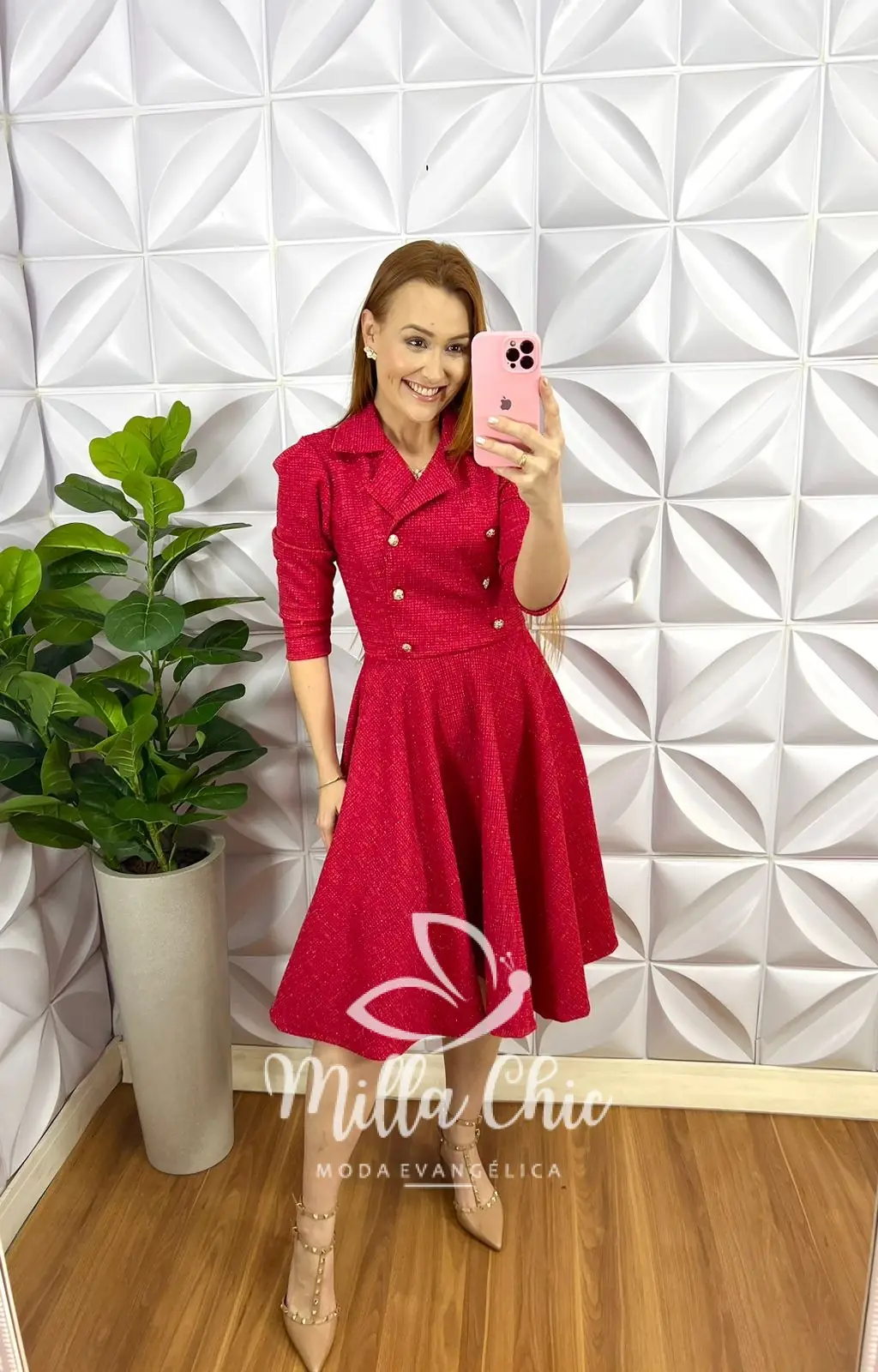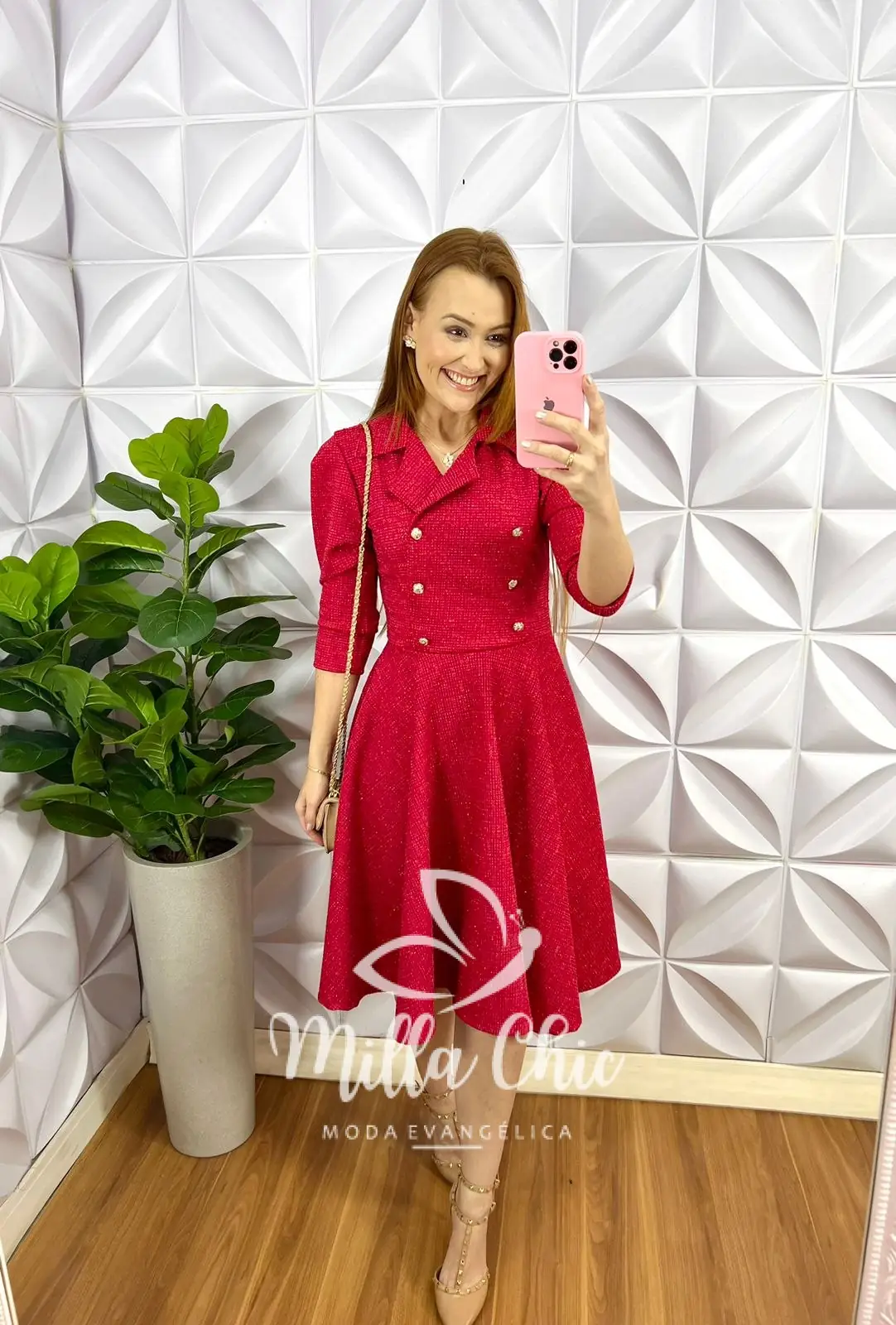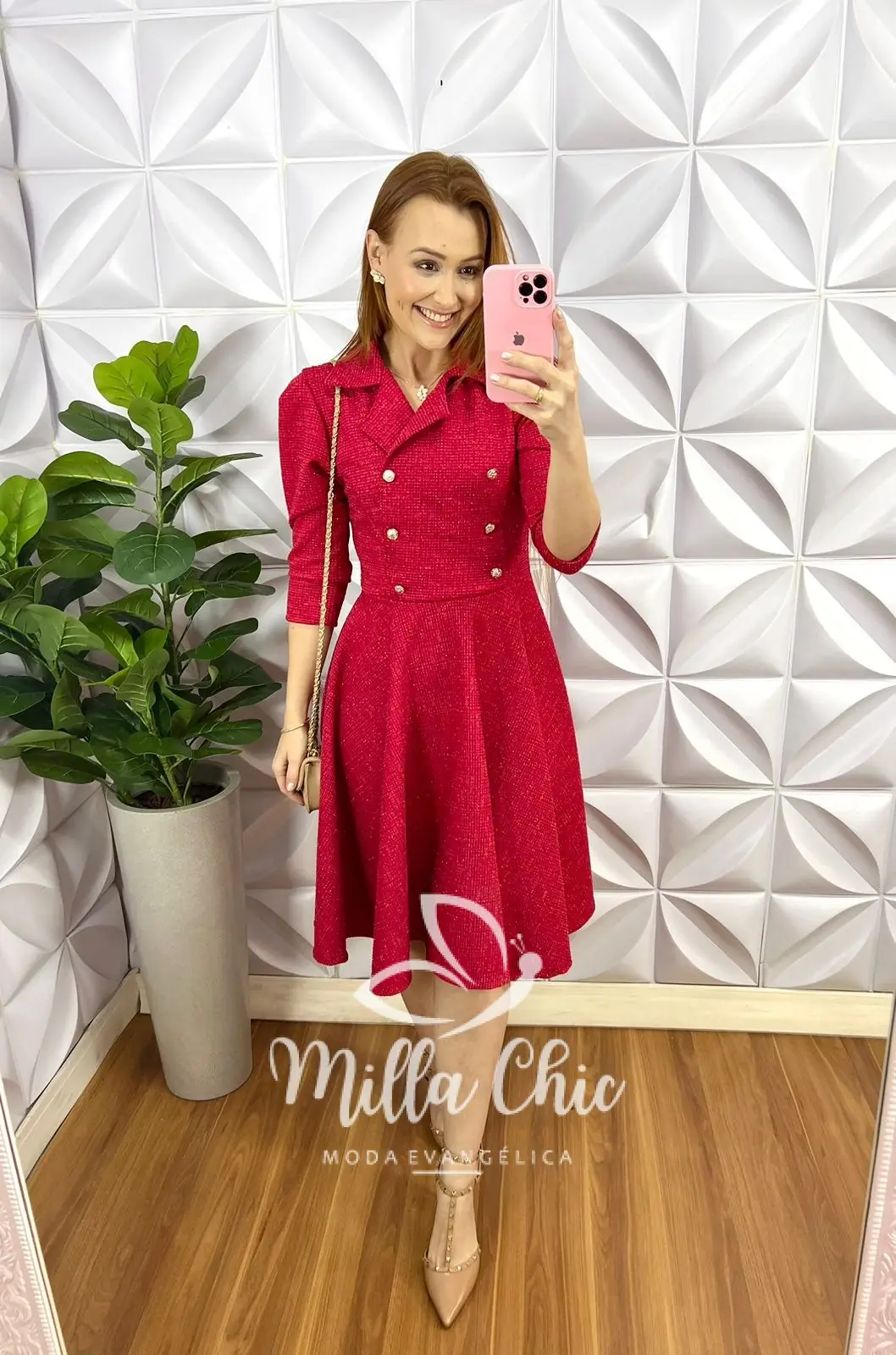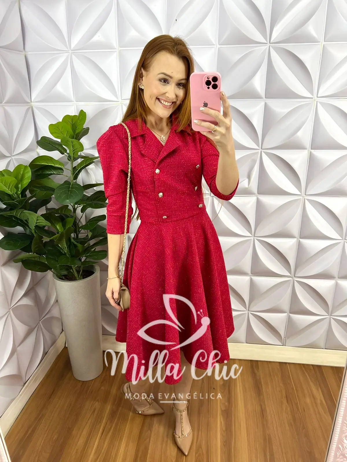 Vestido Tweed Estilo Casaco E Saia Godê Mariana - Vermelho - Milla Chic