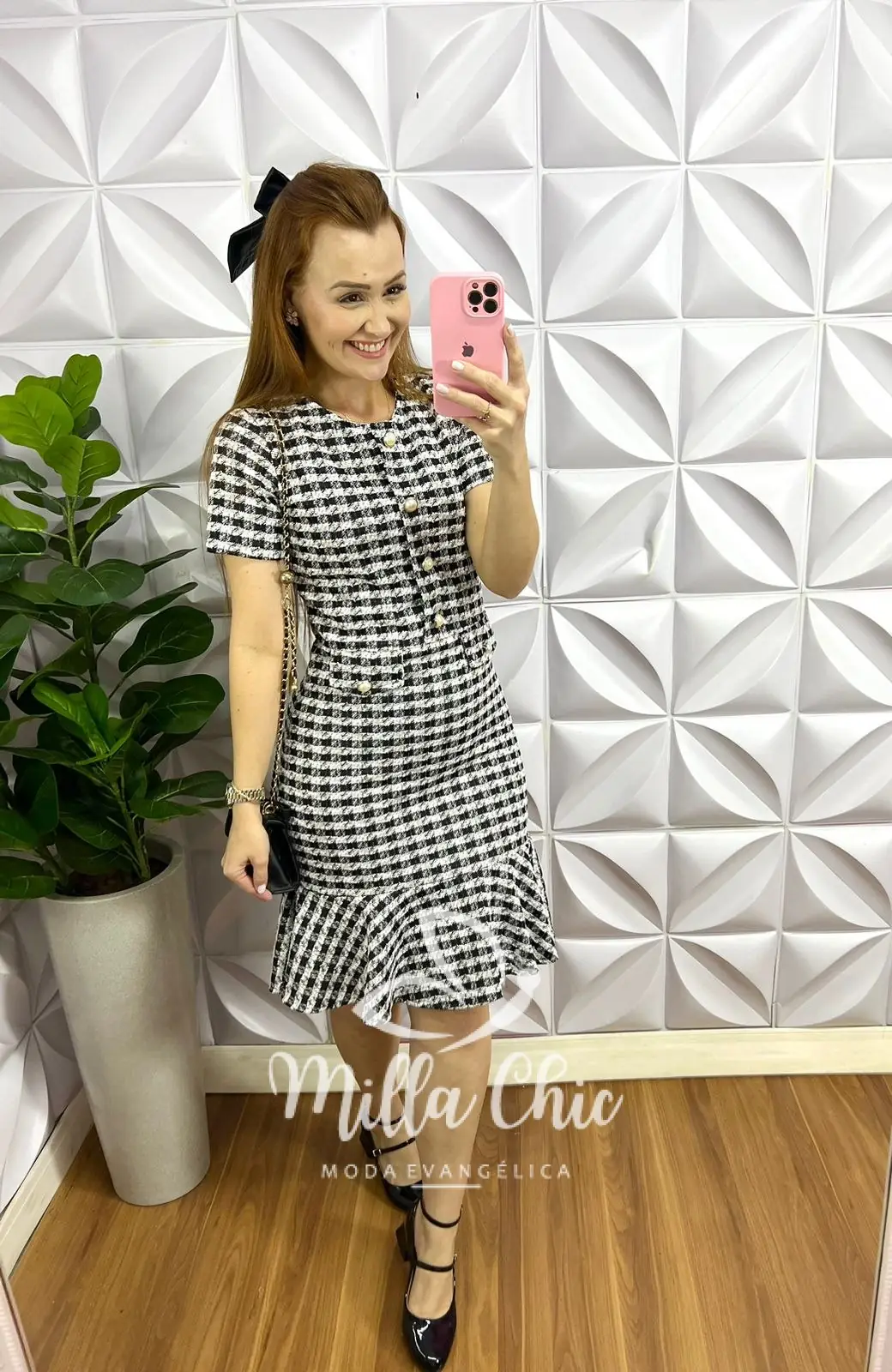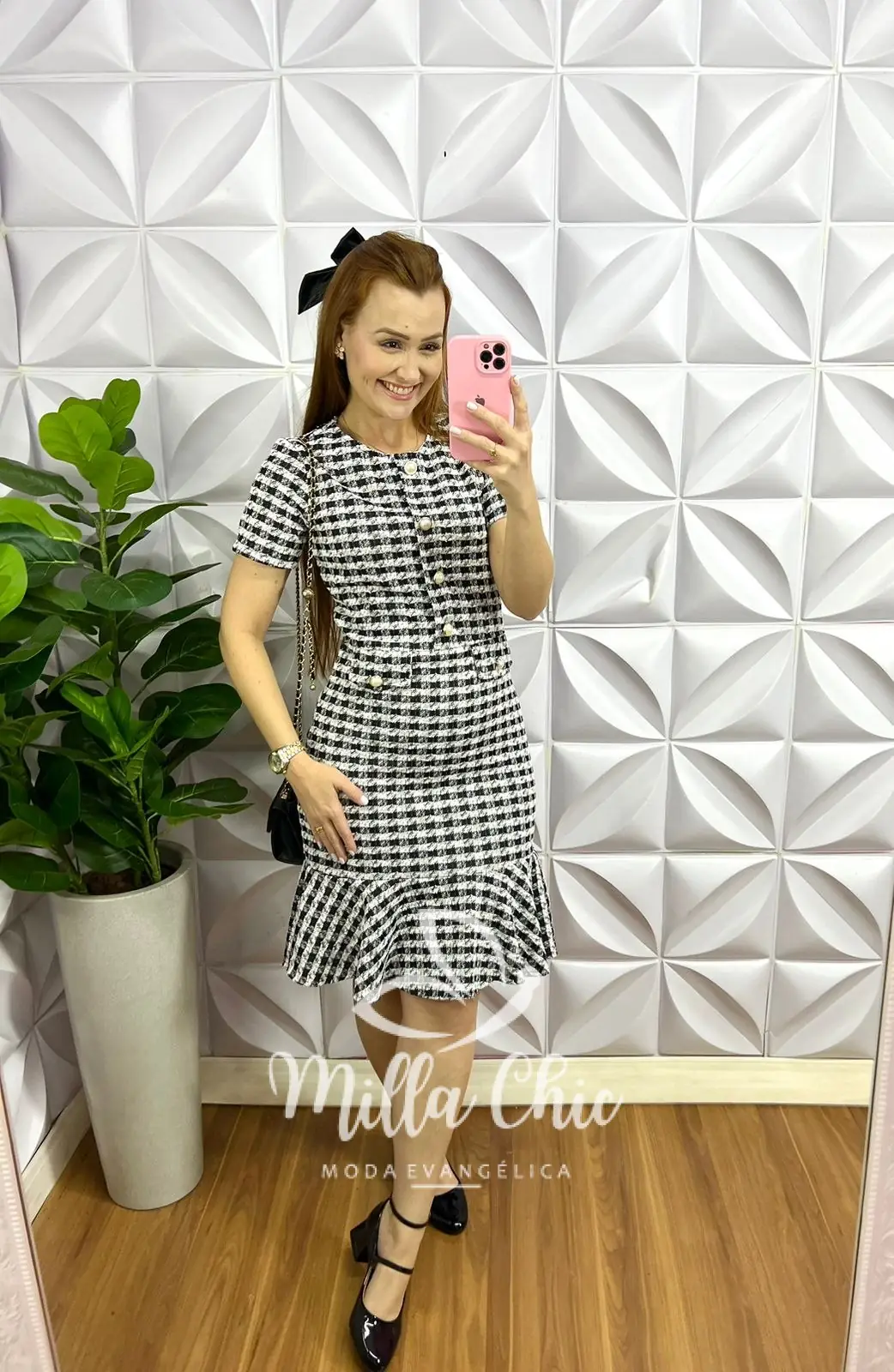 Vestido Tweed Quadriculado Botões De Perola Camila - Preto - Milla Chic