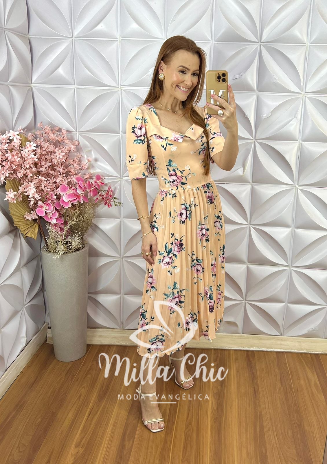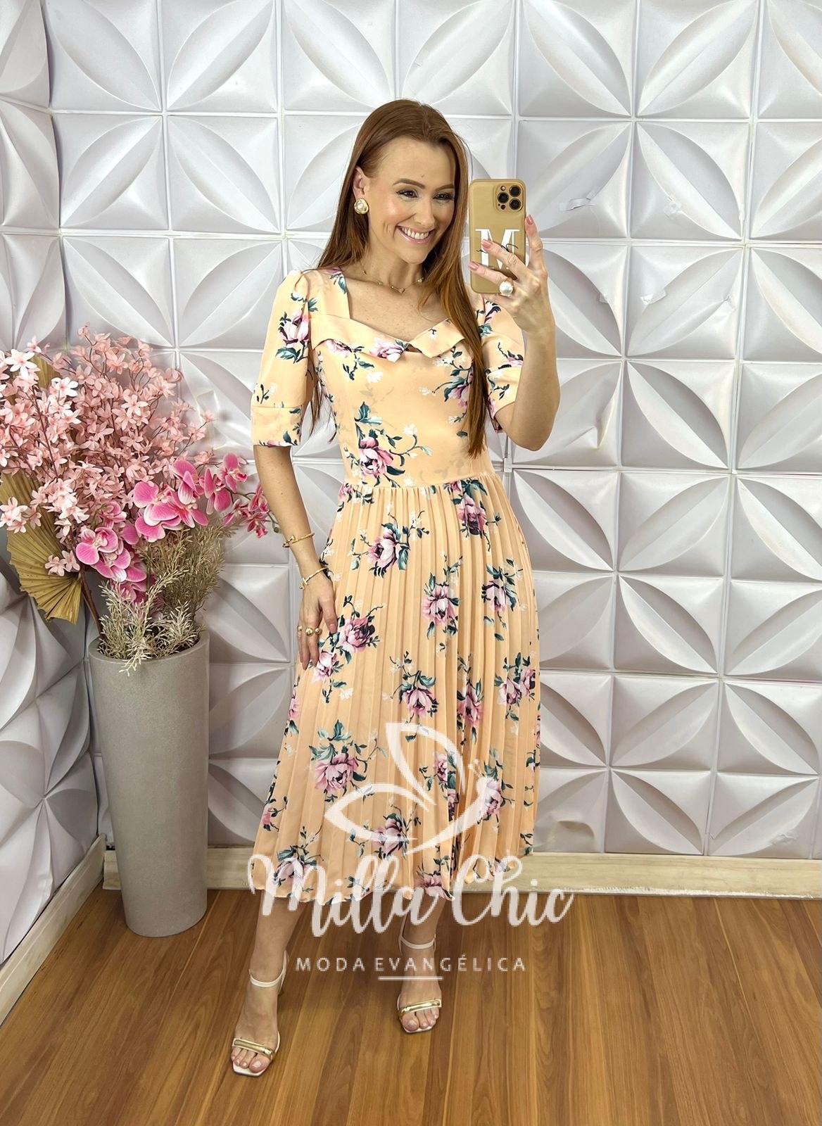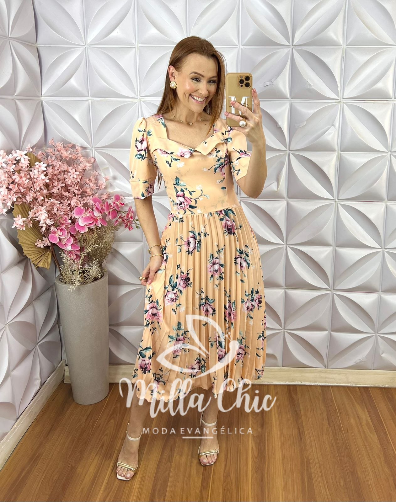 Aquele toque de clássico e elegante da saia toda plissada e a delicadeza da manga princesa é do decote tem essa pala que traz mais elegância e feminilidade.