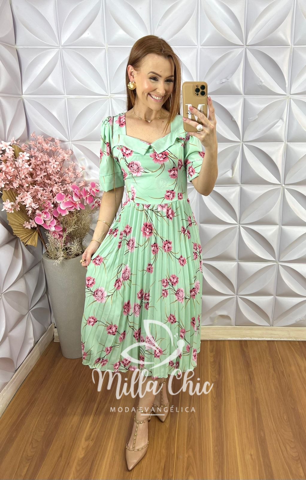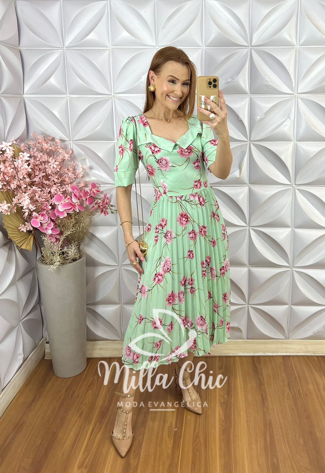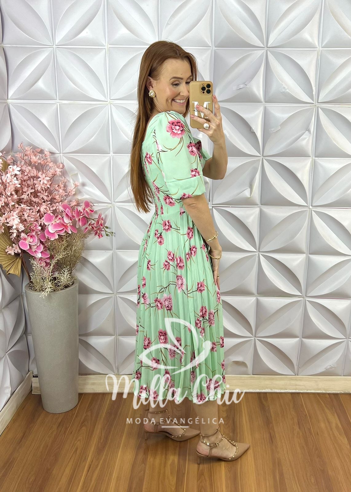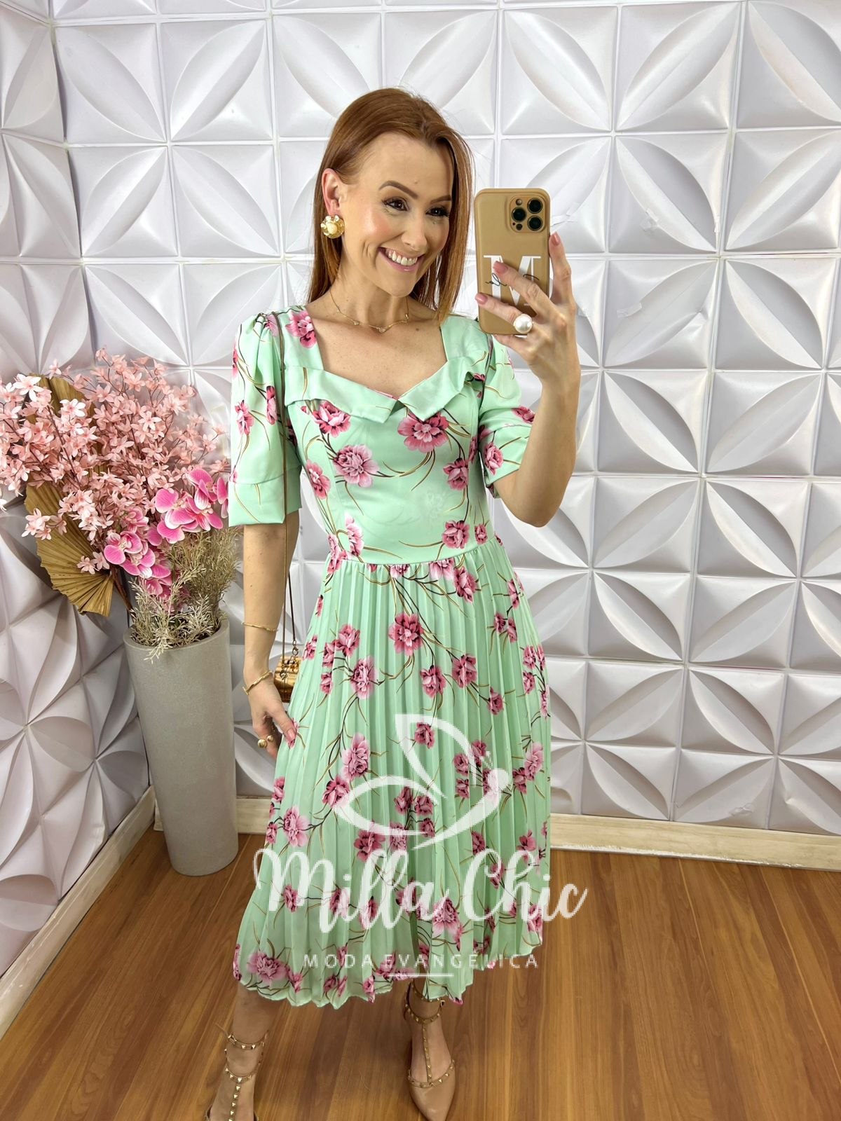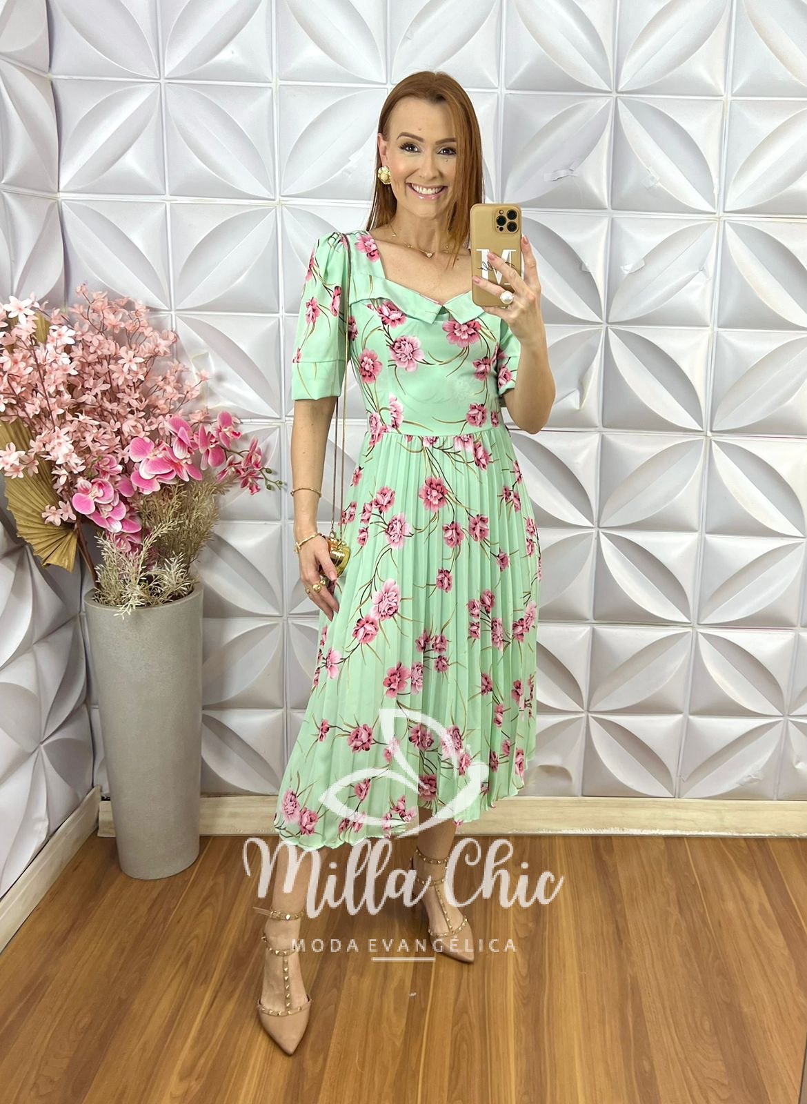 Aquele toque de clássico e elegante da saia toda plissada e a delicadeza da manga princesa é do decote tem essa pala que traz mais elegância e feminilidade.
