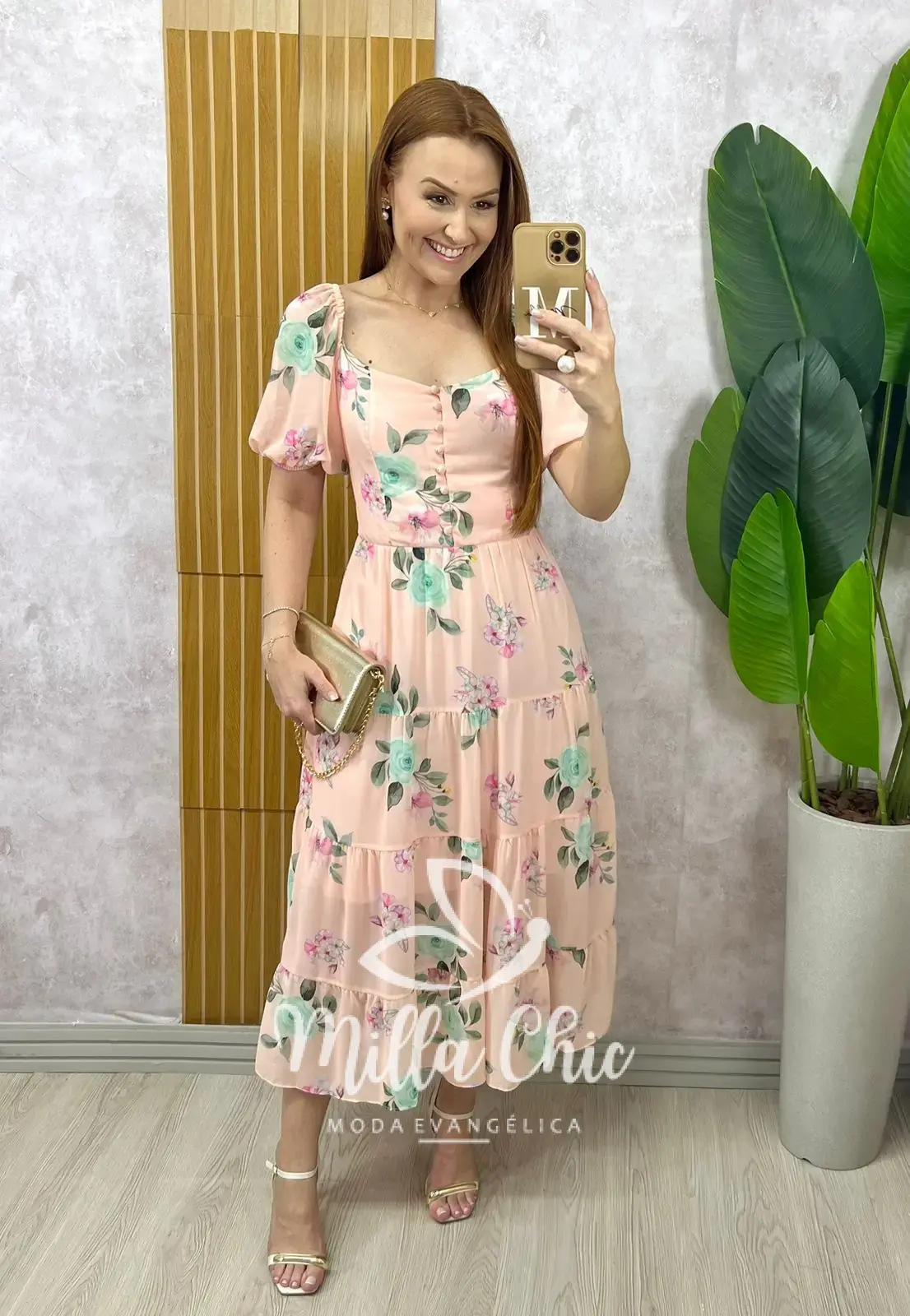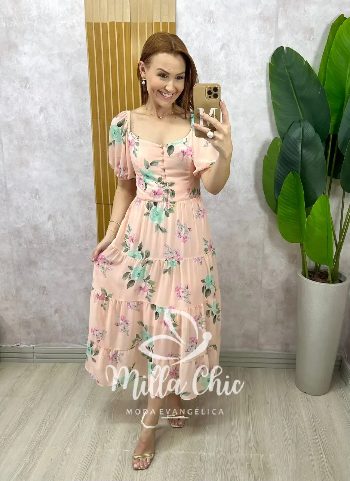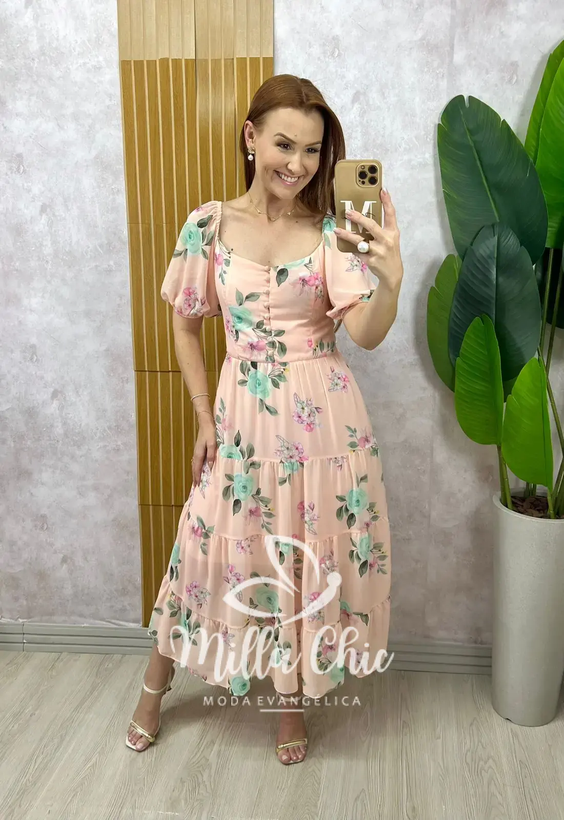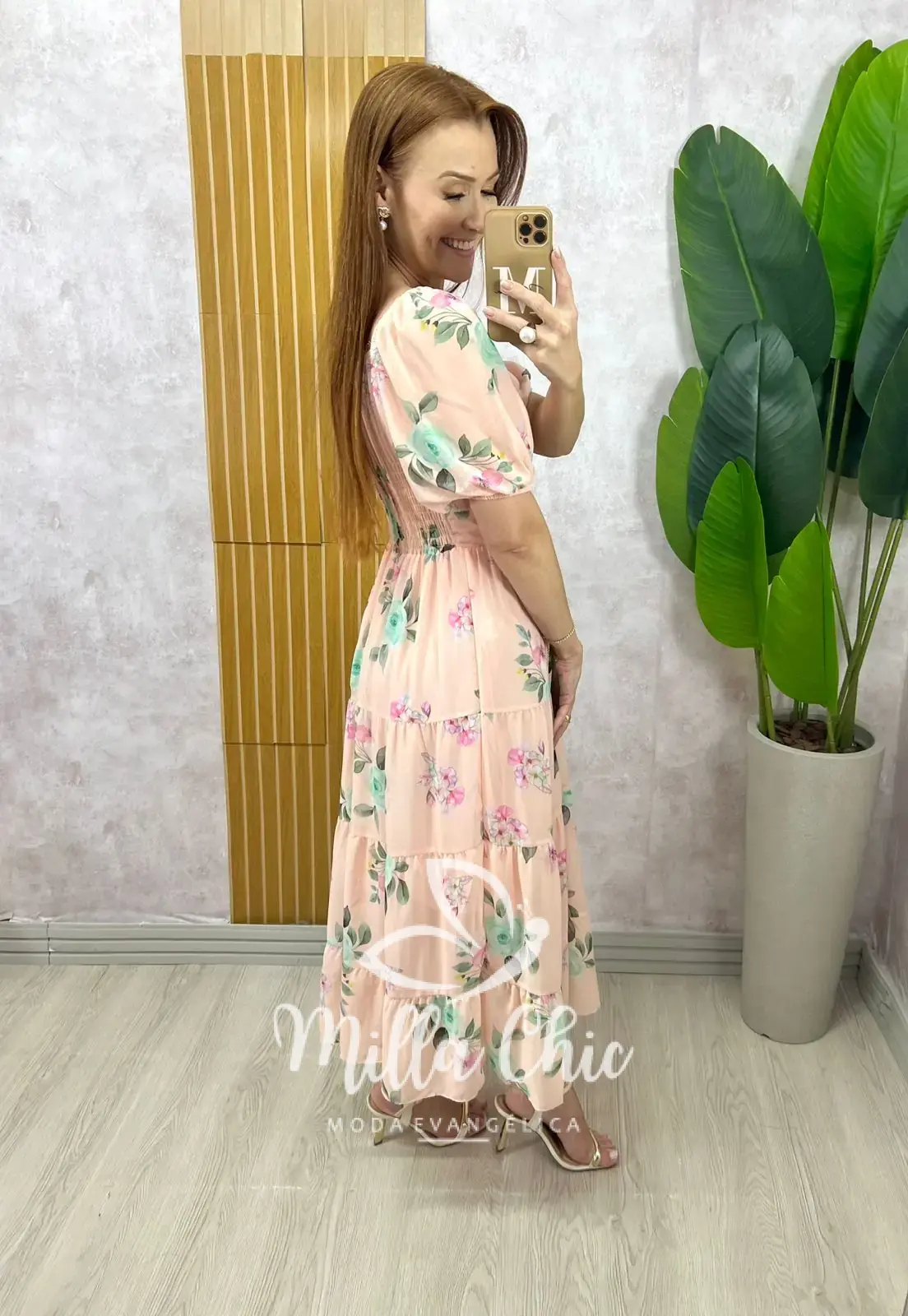 O vestido Valéria traduz elegância e requinte em cada detalhe! Simplesmente deslumbrante, foi criado para minhas irmãs se sentirem especiais em todos os momentos! Um modelo marcante, capaz de transformar qualquer ocasião em uma experiência inesquecível! Confeccionado no tecido chiffon que une conforto, sofisticação e um caimento impecável e a harmonia entre os tons da estampa. Fluido , delicado e feminino . Esse vestido vai te deixar deslumbrante.