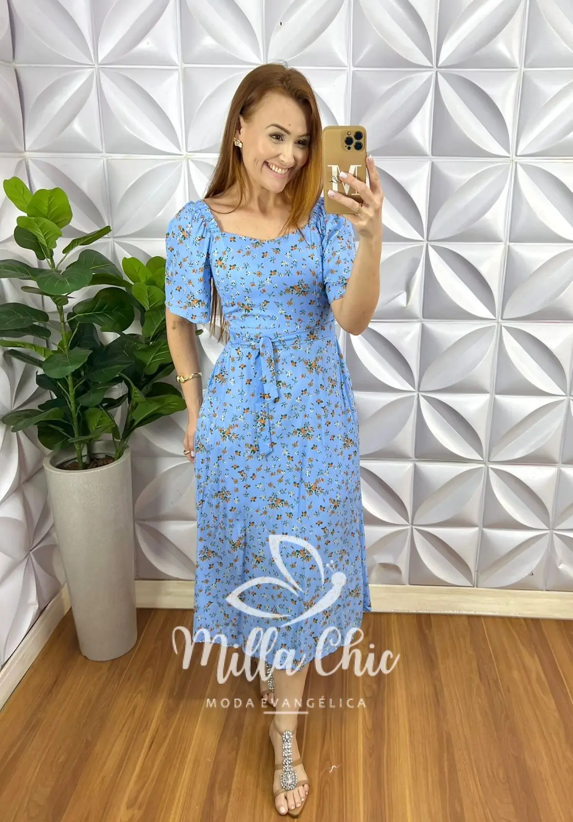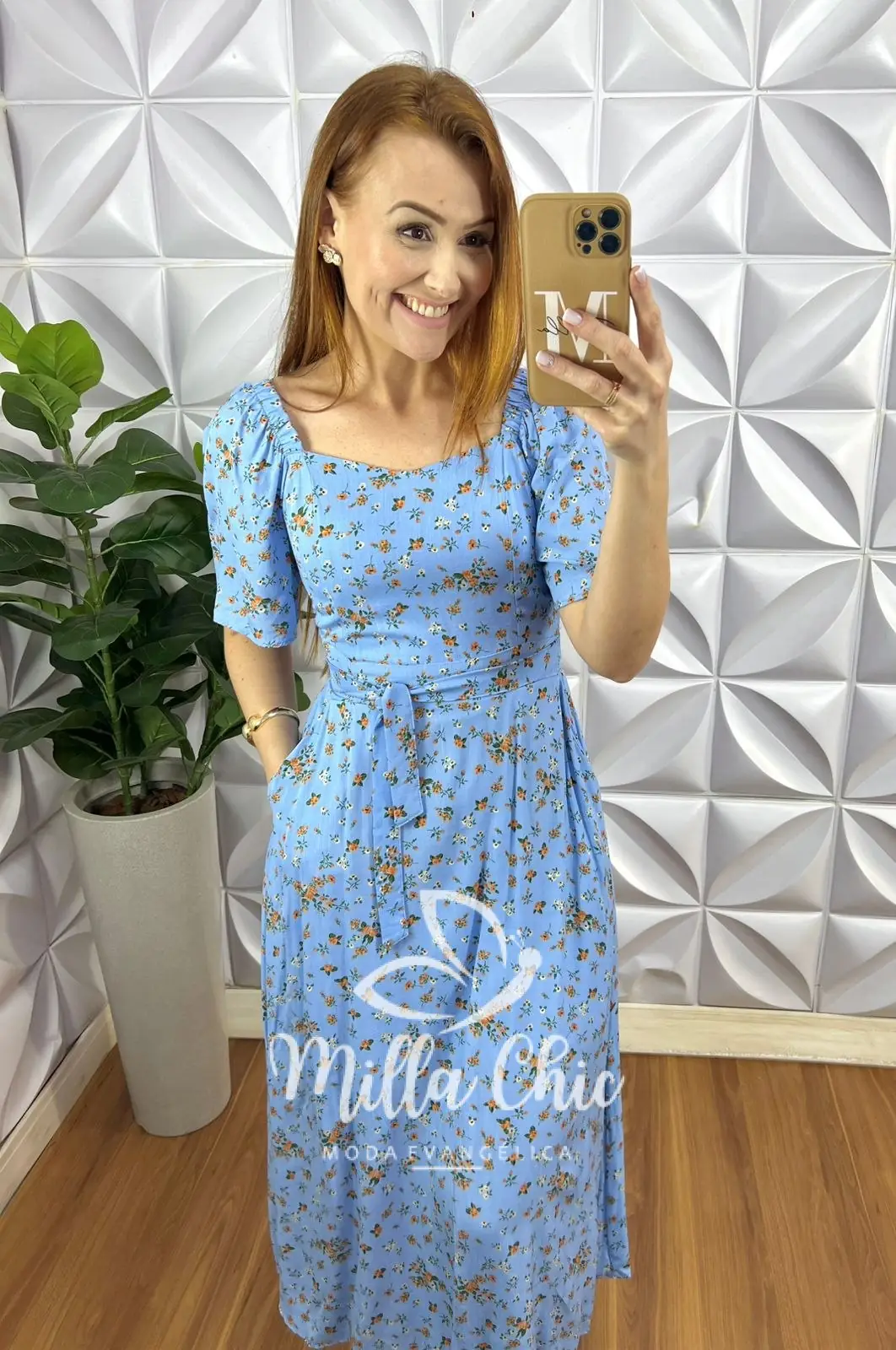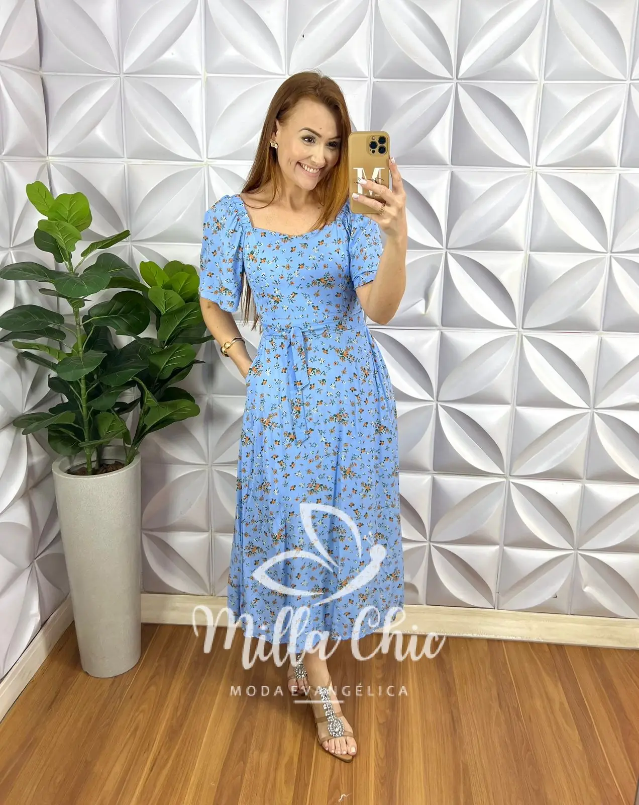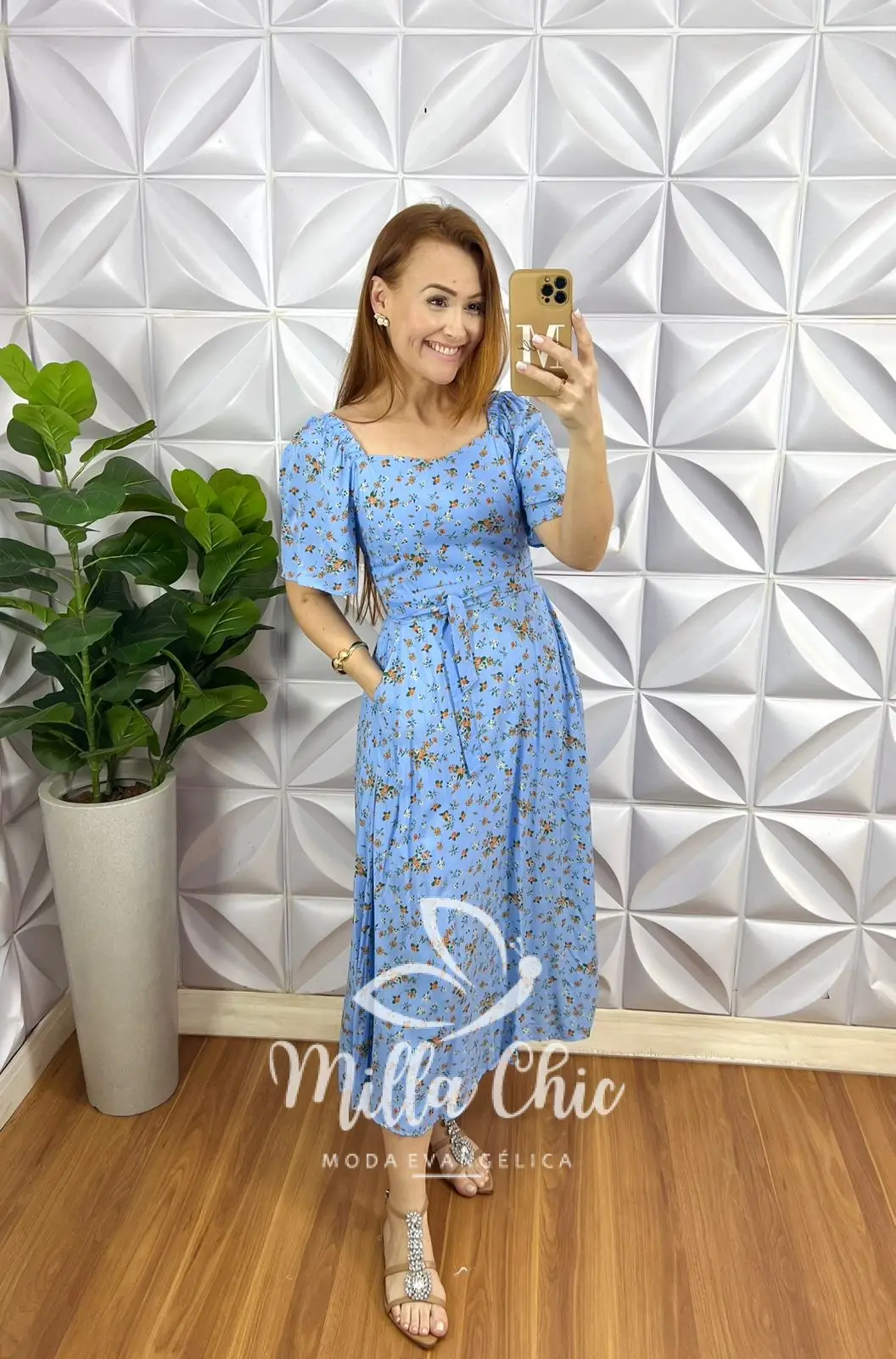 Possui: Decote quadrado, manga soltinha, recorte no busto, pala na cintura, bolsos laterais, lastex nas costas, comprimento Mídi, caimento evase,cinto faixa nas laterais, forrado na saia.